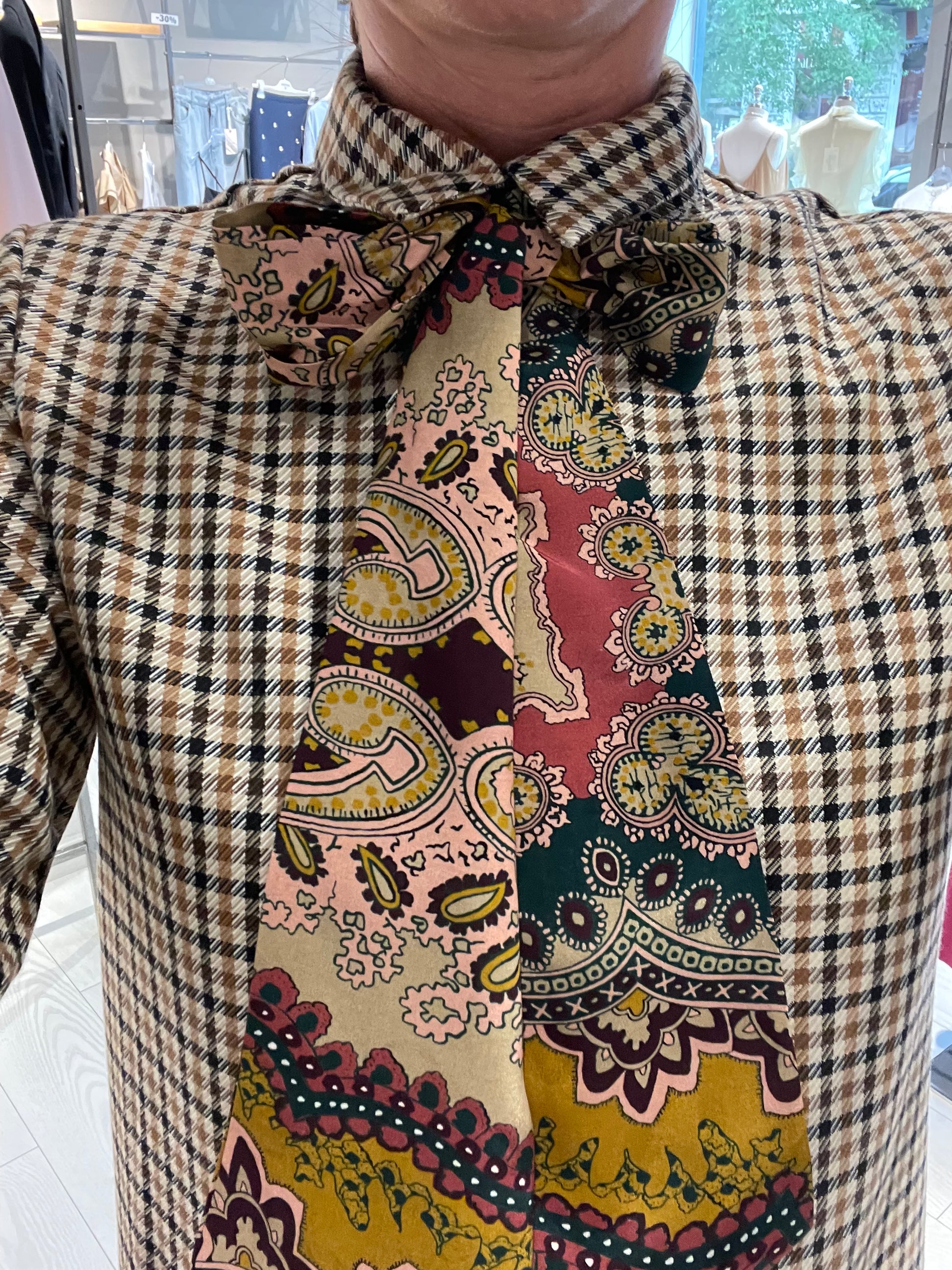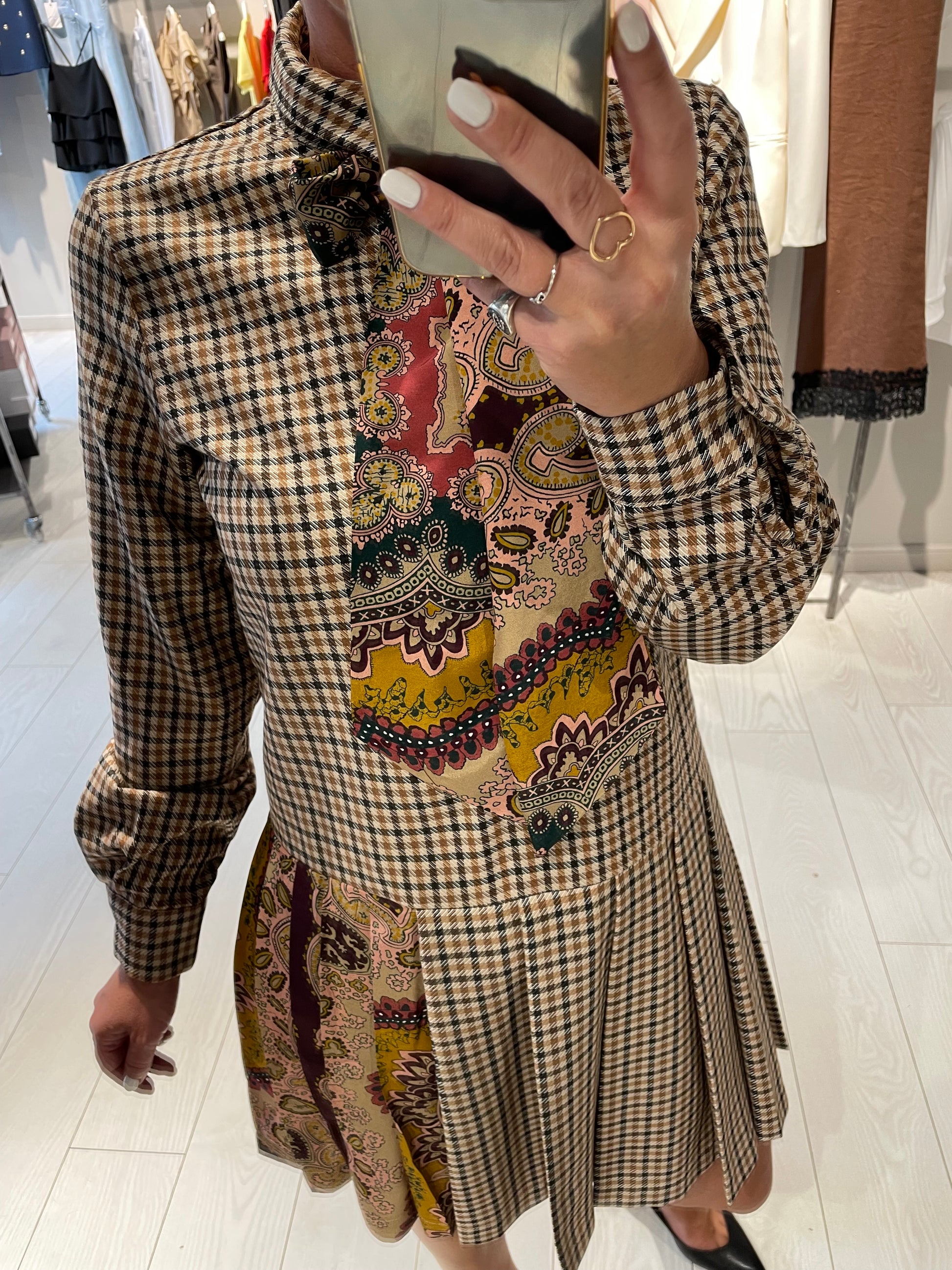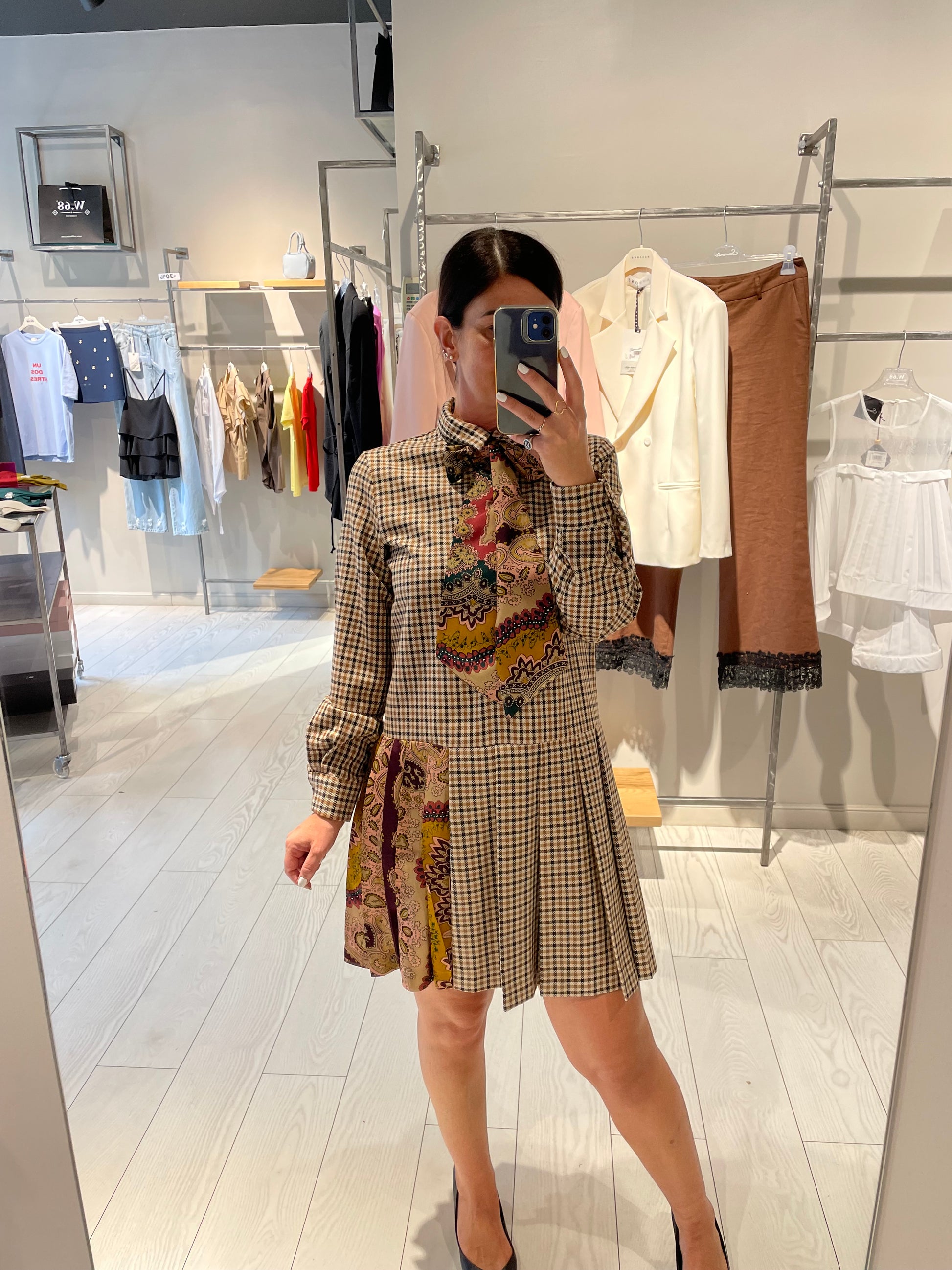 Abito corto modello college con gonnellino in doppia fantasia, foulard staccabile in fantasia uguale alla gonna, la vestibilità è regolare, la modella in foto indossa una taglia S ed è alta 1.68 m circa