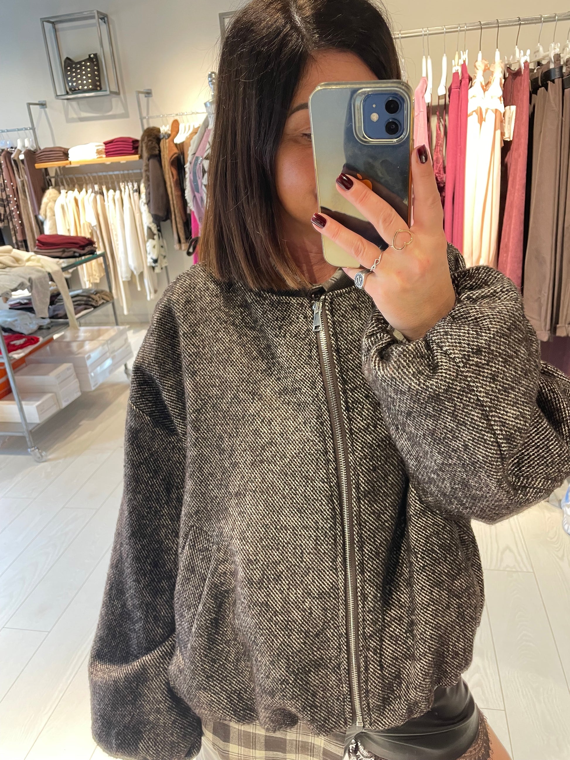 Giacca modello bomber con manica a palloncino, collo alla coreana e chiusura con cerniera, capo disponibile in taglia unica che può vestire fino ad una L, la modella in foto è alta 1,68 m circa