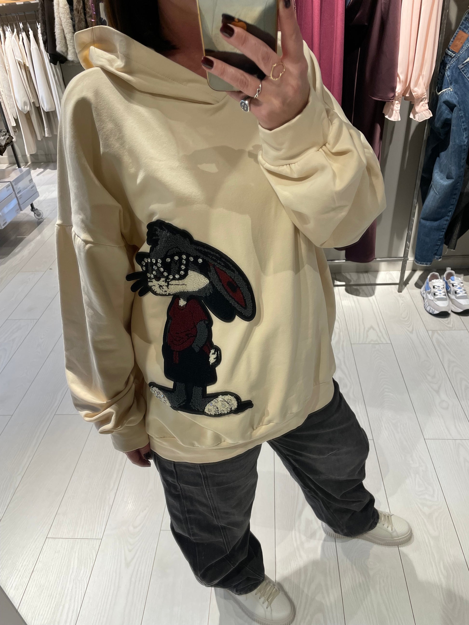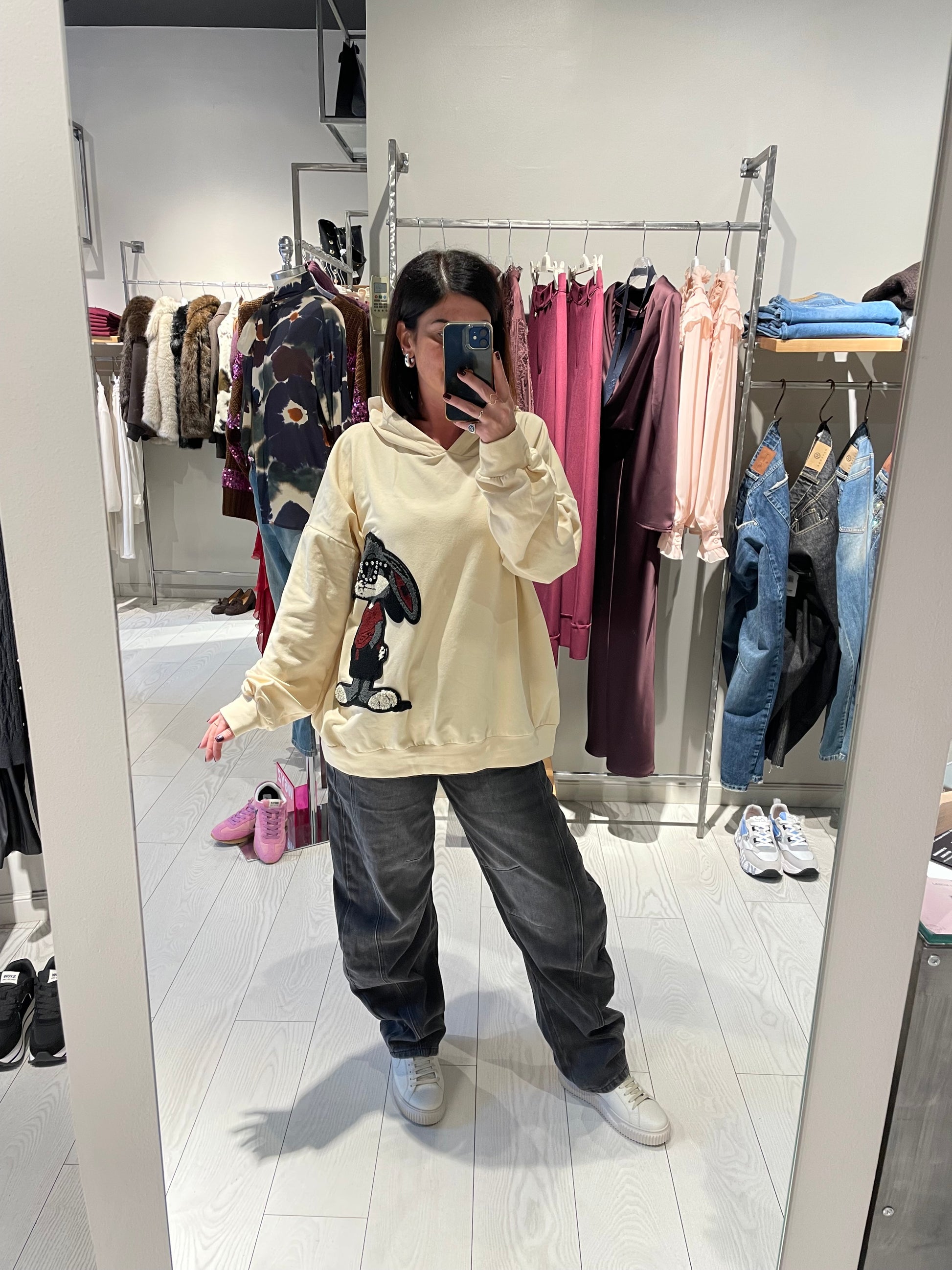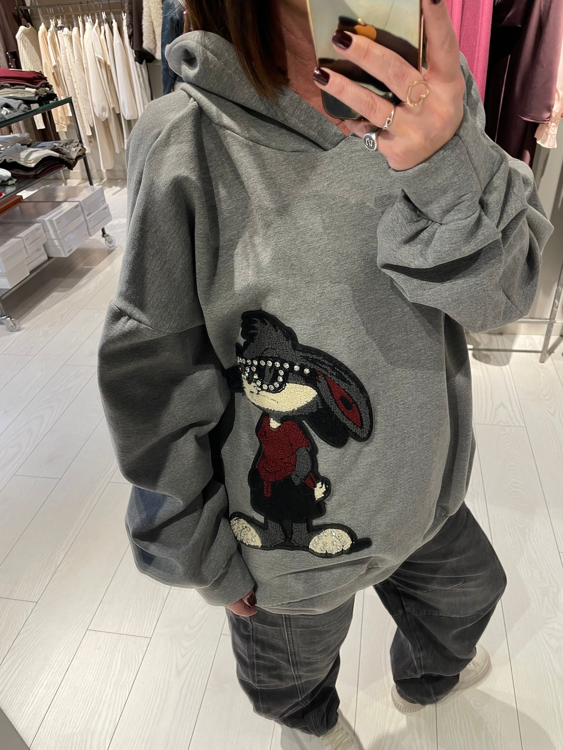 Felpa modello over lunga con cappuccio, stampa laterale, capo disponibile in taglia unica che può vestire fino ad una L, la modella in foto è alta 1,68 m circa