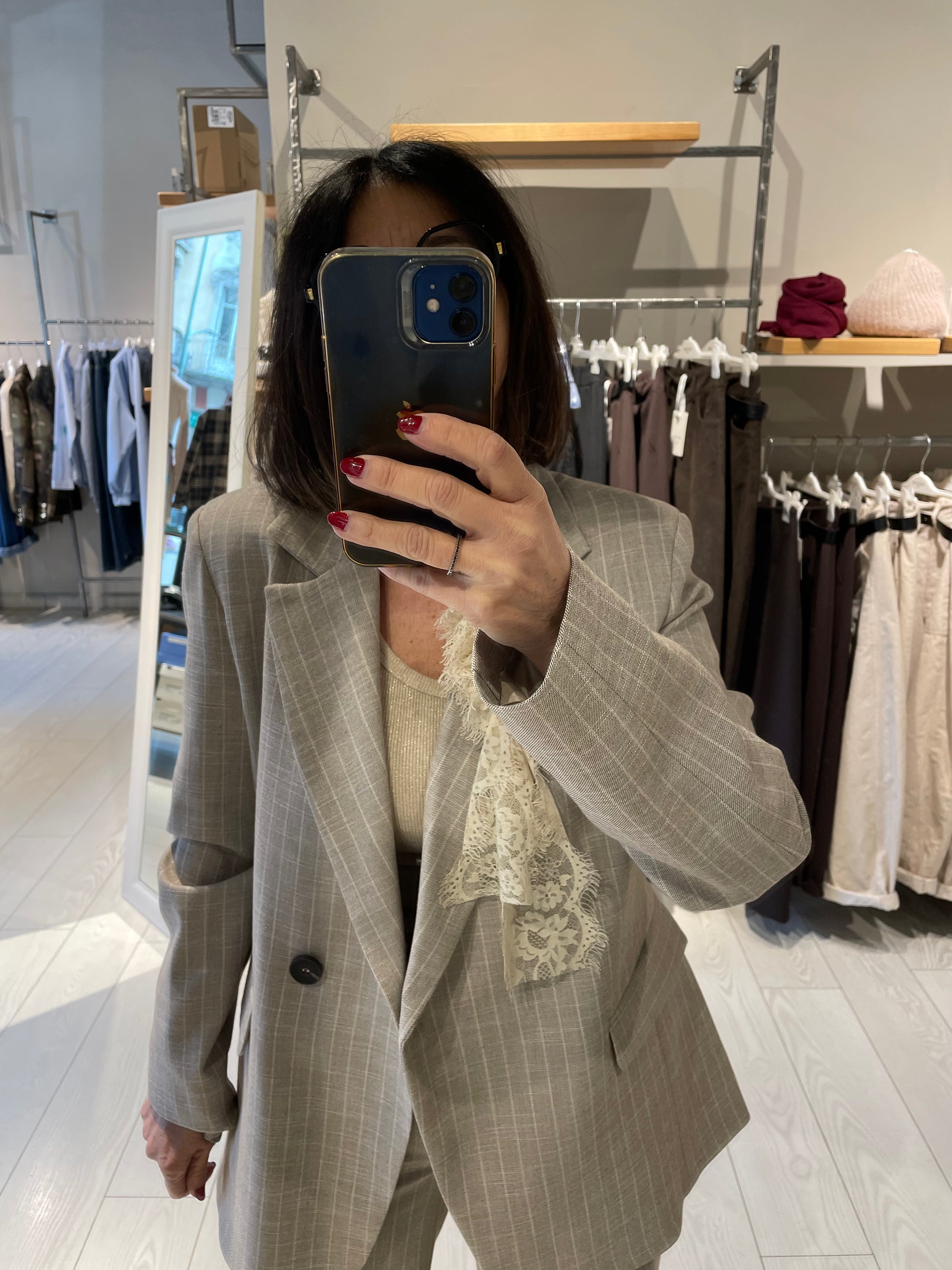 Bellissimo, con una particolare apertura, taglio perfetto, leggermente over, punta di grigio molto piacevole. Super contenta
