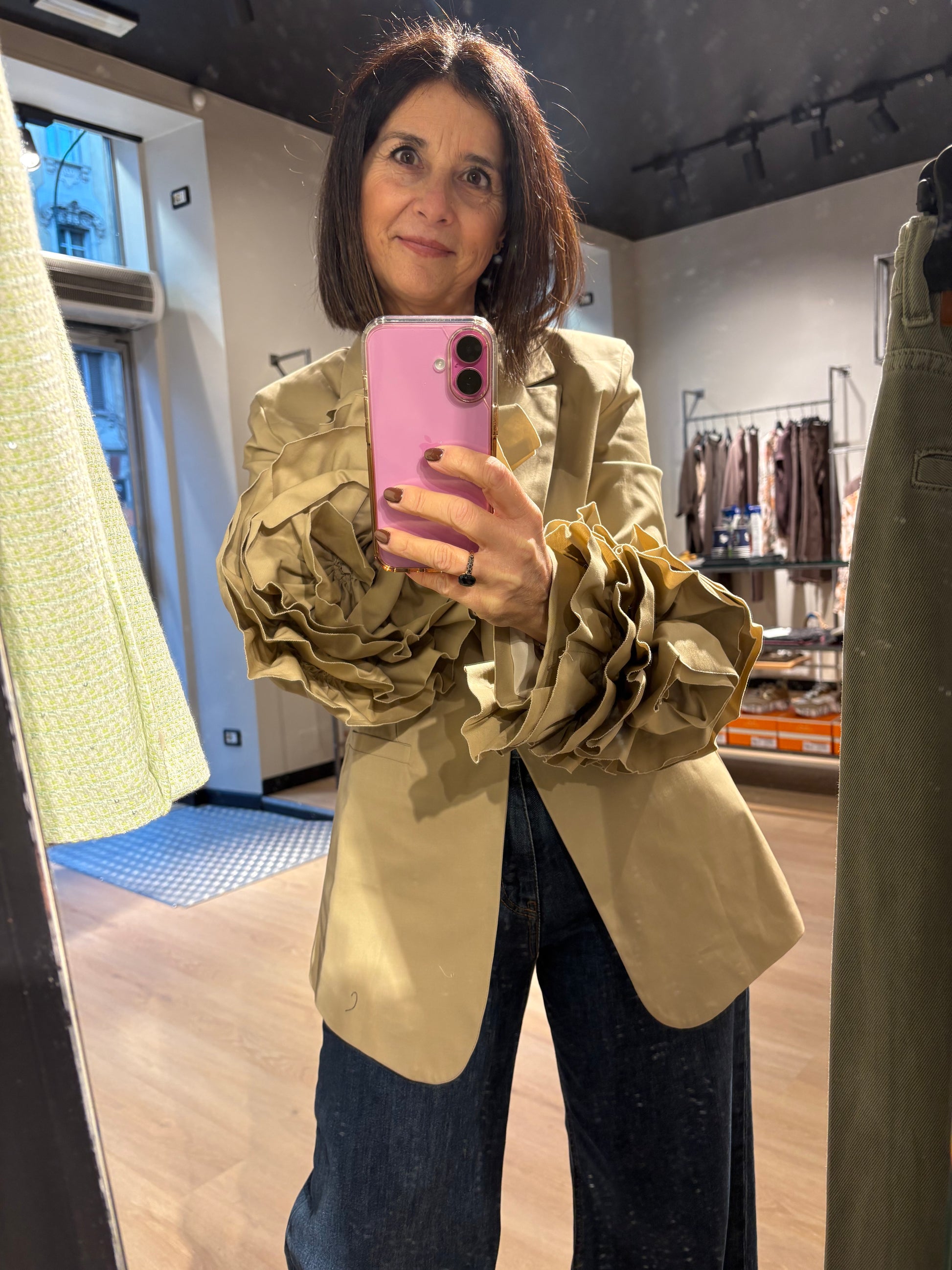 Bellissimo, con una particolare apertura, taglio perfetto, leggermente over, punta di grigio molto piacevole. Super contenta