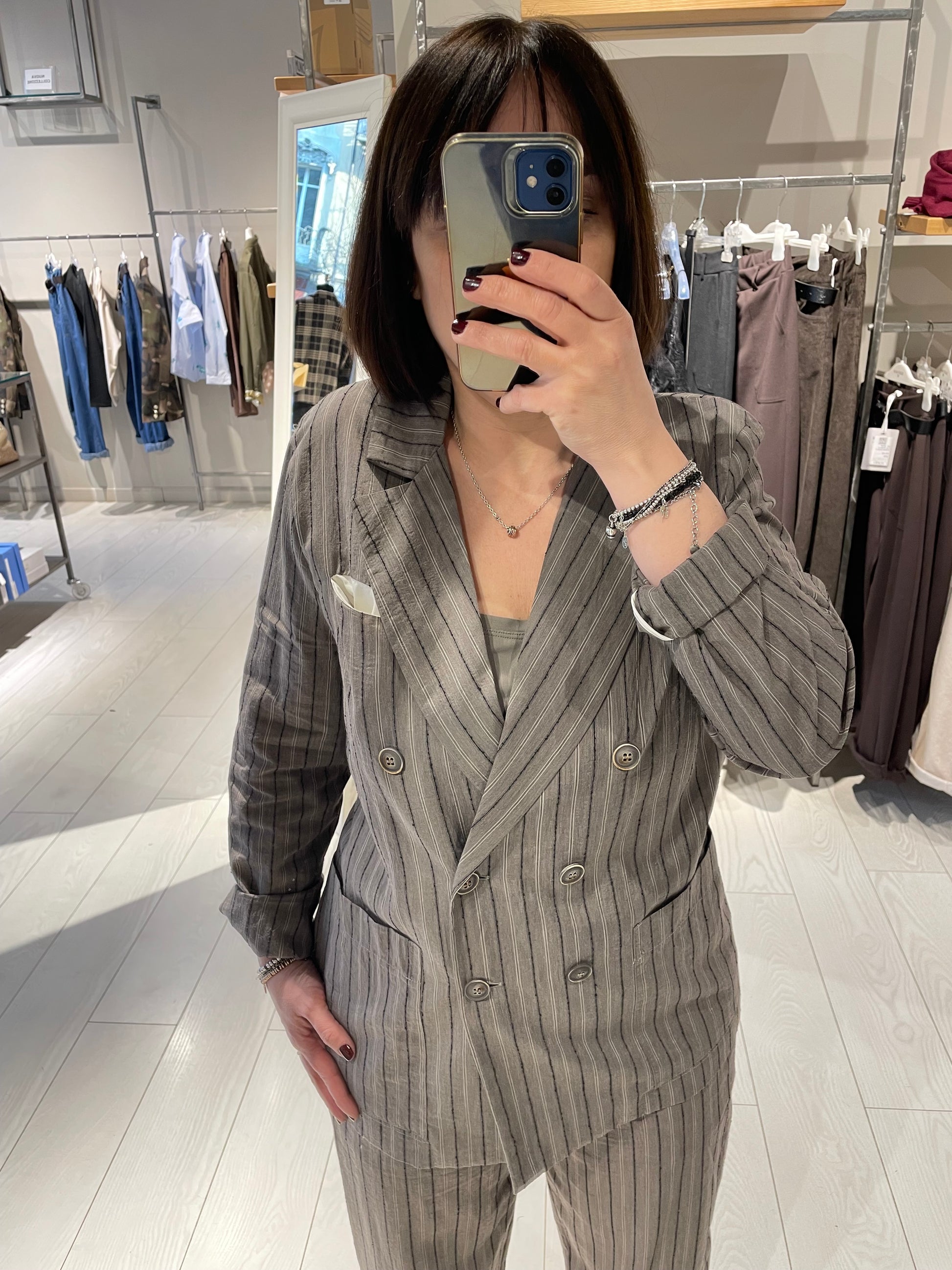 Giacca decostruita doppio petto con elegante motivo gessato e raffinate righe. Questo capo rappresenta l'eccellenza della sartoria italiana, combinando tradizione artigianale e dettagli sofisticati. La struttura in doppio petto garantisce una silhouette classica e versatile, mentre le righe ricamate aggiungono un tocco di distinzione, abbinata al suo pantaloni chiude un completo di qualità e stile. La modella in foto indossa una taglia M ed è alta 1.60 circa