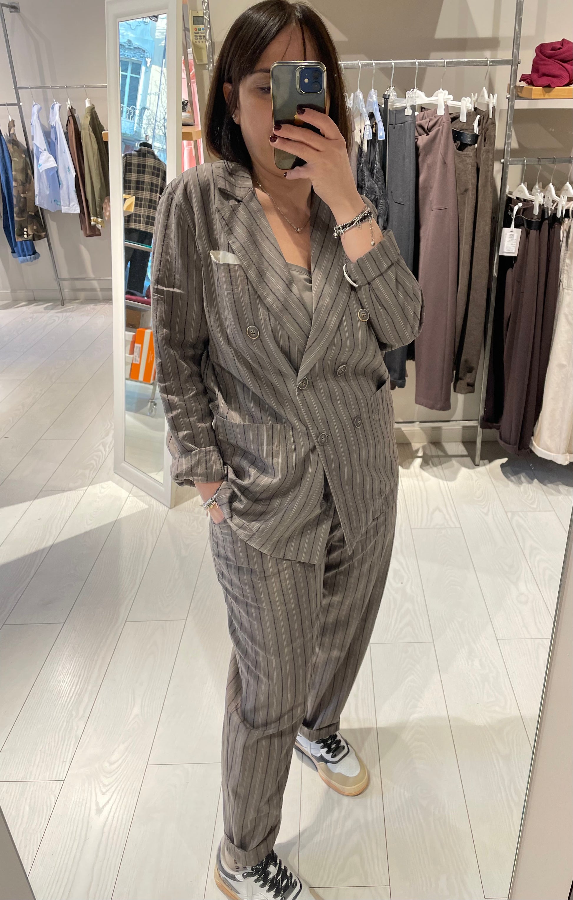 Bellissimo, con una particolare apertura, taglio perfetto, leggermente over, punta di grigio molto piacevole. Super contenta