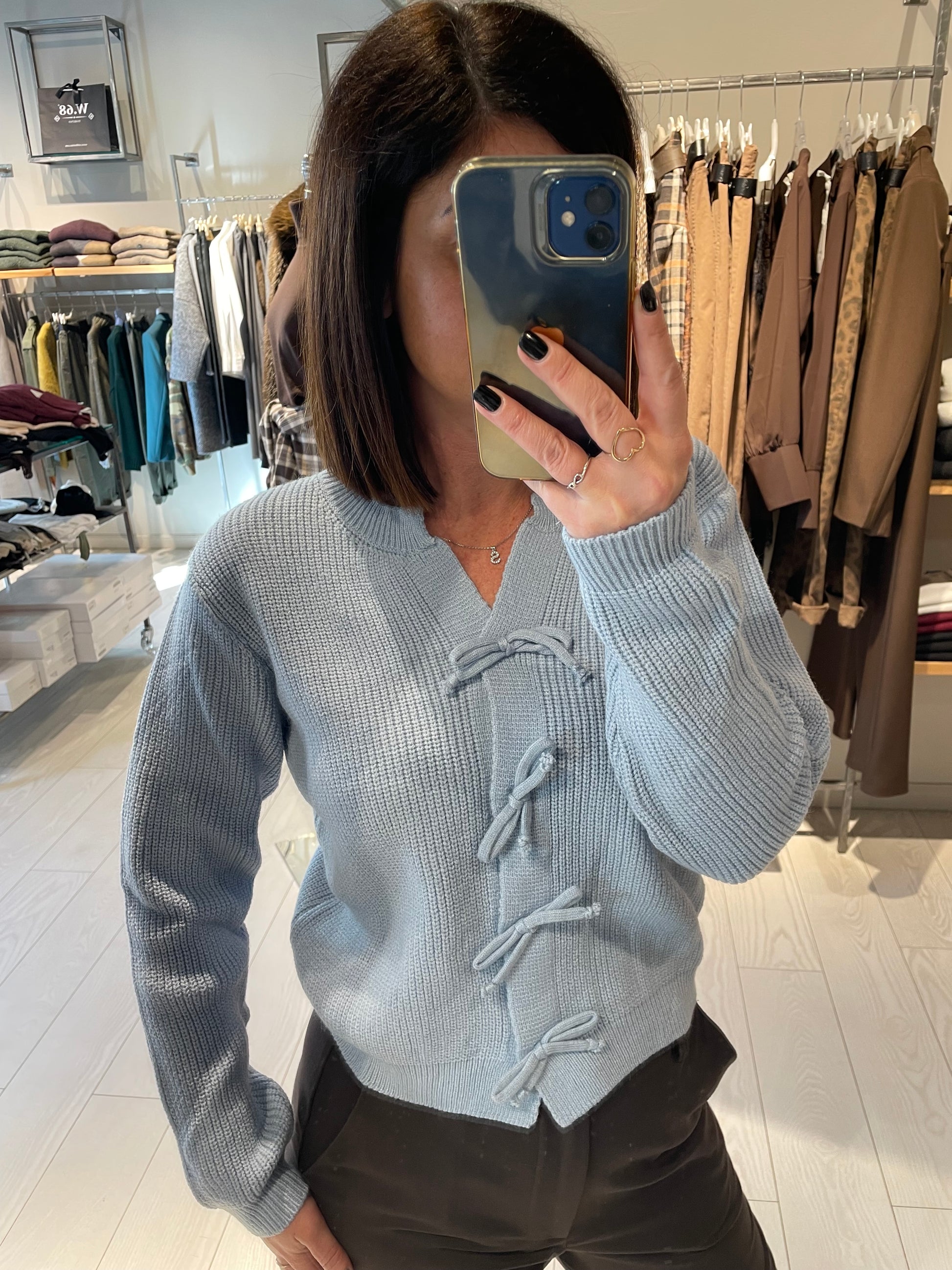 Cardigan corto modello a giacchina, chiusura con bottoni nascosti dai fiocchetti, capo disponibile in taglia unica che veste fino ad una M, la modella in foto è alta 1,68 m circa