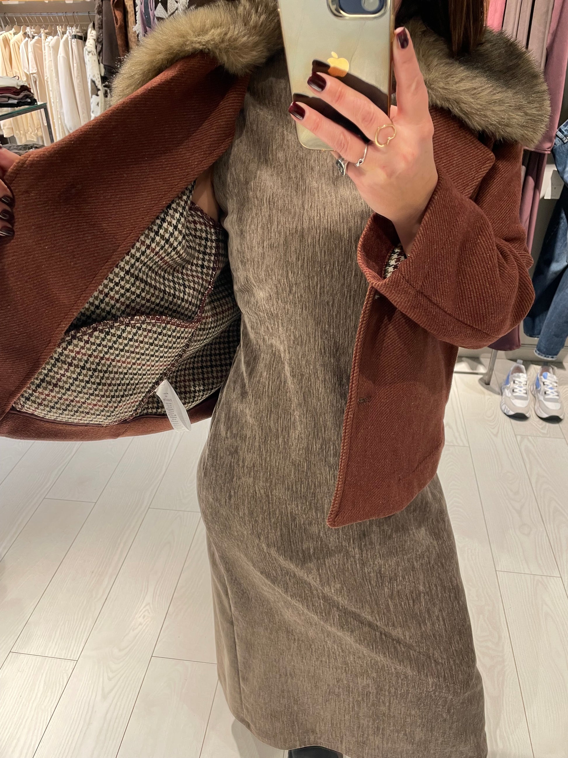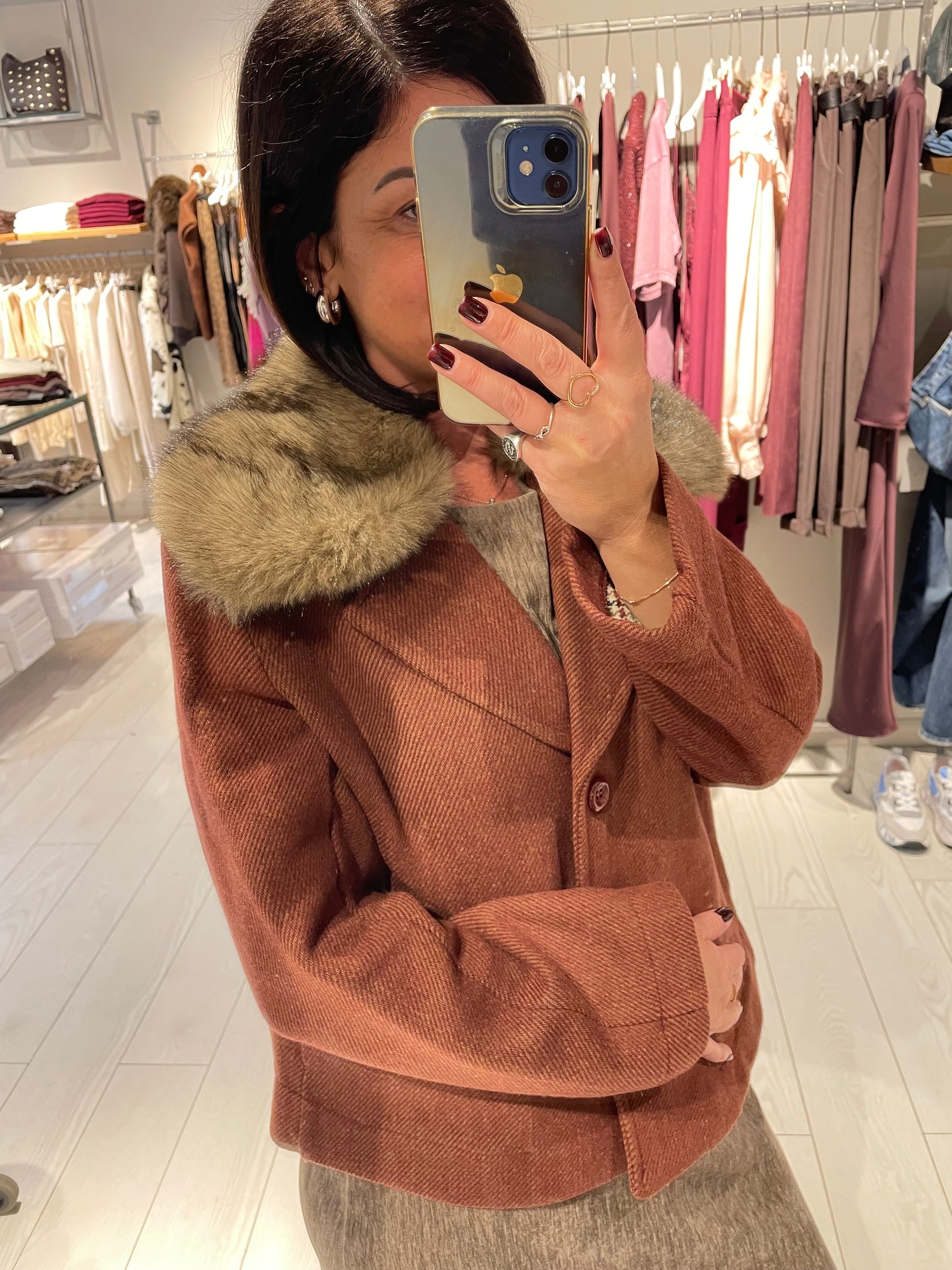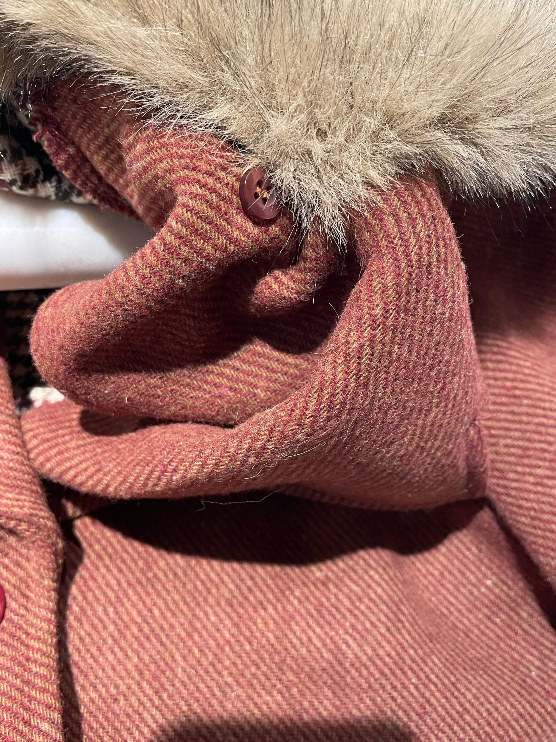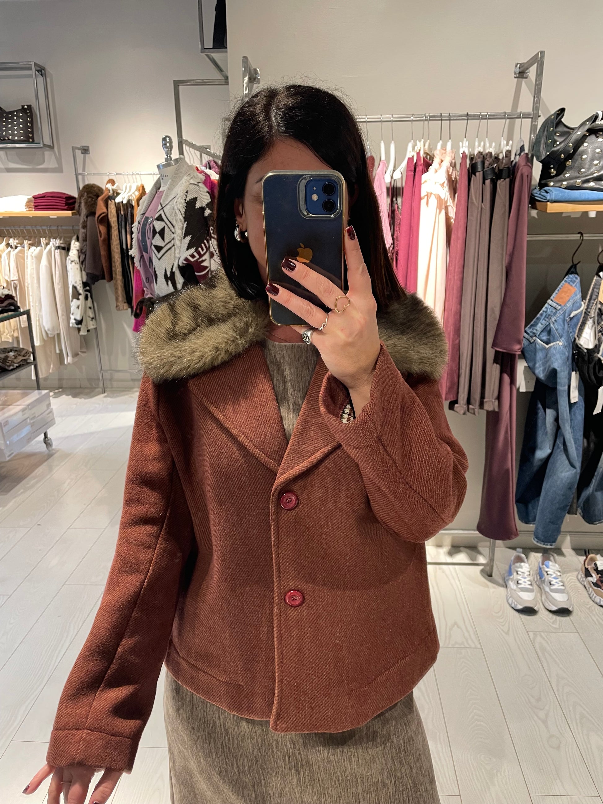 Giubbotto modello giacca, chiusura con due bottoni ed eco pelliccia nel collo staccabile, foderato internamente con stoffa pied de poule, la vestibilità è regolare, la modella in foto indossa una taglia S ed è alta 1,68 m circa