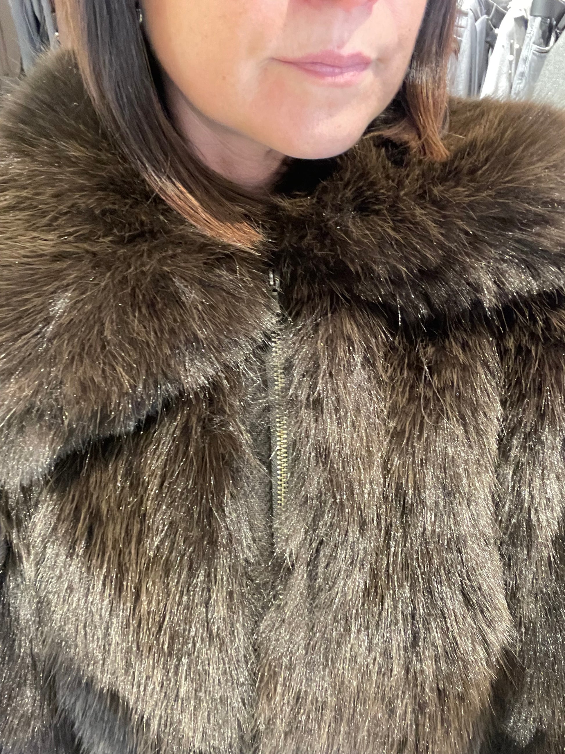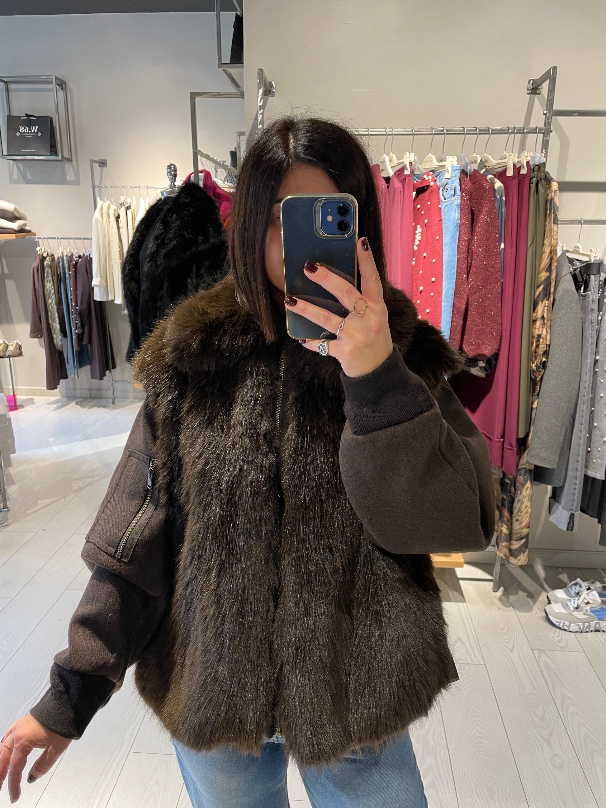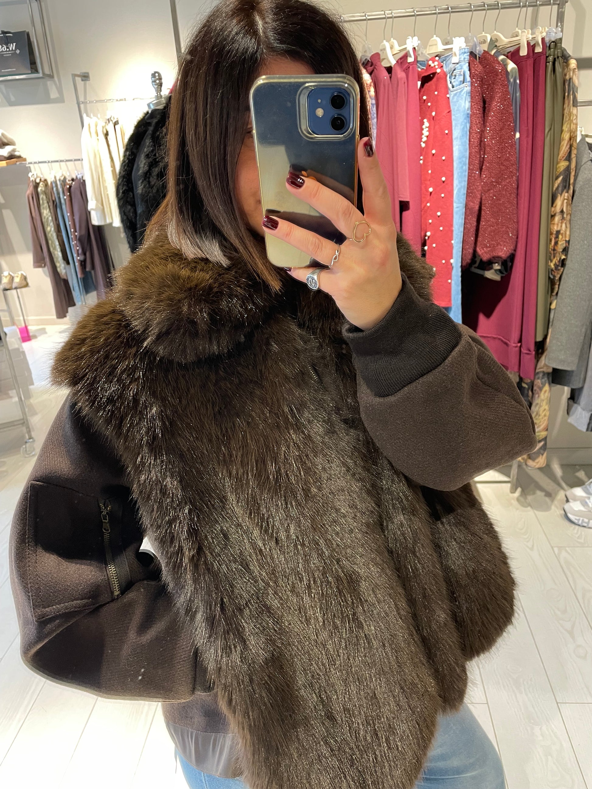 Giubbotto corto con ecopelliccia davanti e sul collo, vestibilità over, la modella in foto indossa una XS ed è alta 1.68 m circa