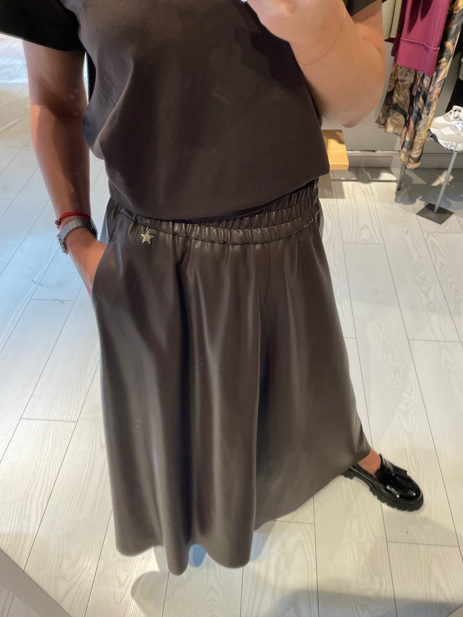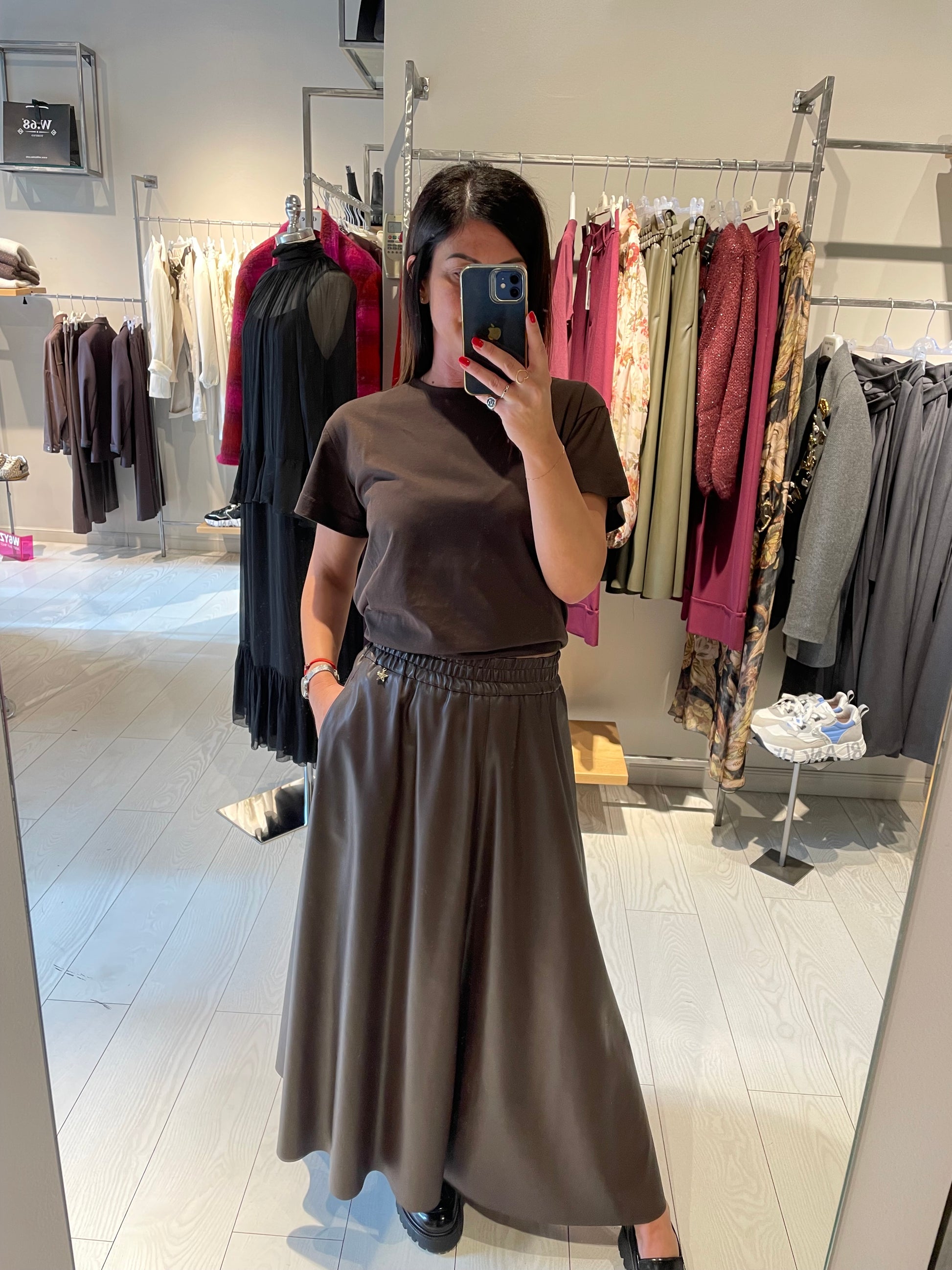 Gonna lunga a ruota in ecopelle, tasche e tutto elastico in vita, la vestibilità è regolare, la modella indossa una taglia S ed è alta 1,68 m cira