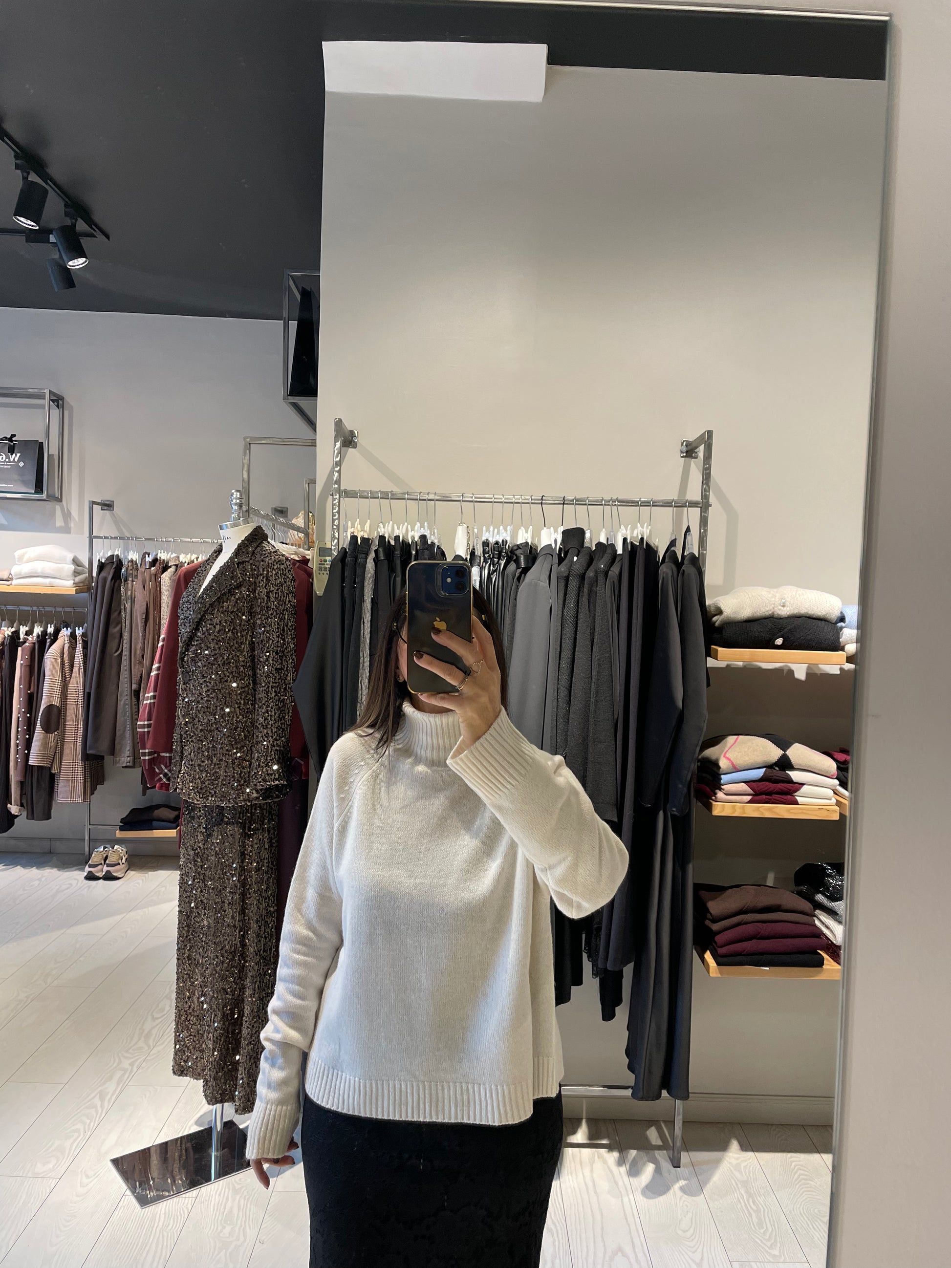 Dolcevita modello a scatoletta con spalla a raglan e manica a manicotto, caldo e confortevole, capo disponibile in taglia unica che può vestire fino ad una L, la modella in foto è alta 1.68 m circa