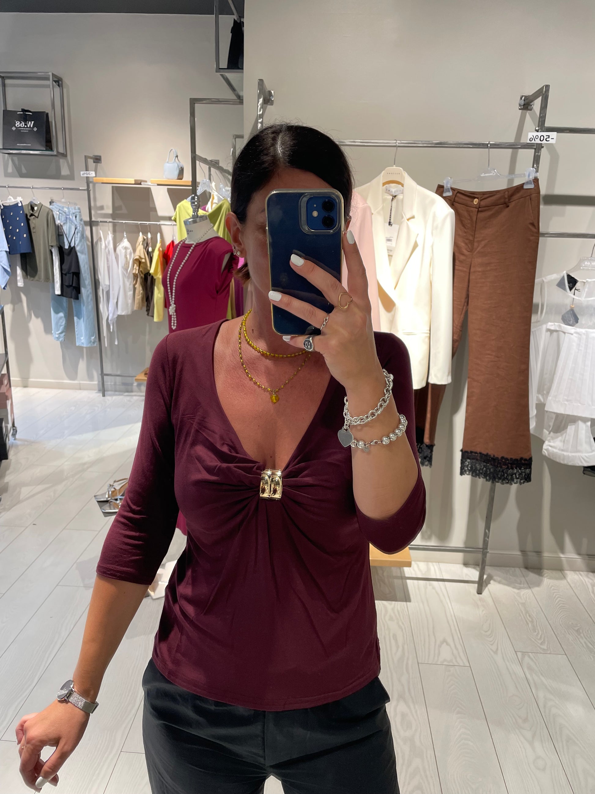 Maglia manica a 3 quarti con. scollatura profonda a V che termina con accessorio dorato, disponibile in taglia unica, essendo leggermente elasticizzato veste fino ad una L, la modella è alta 1,68 m circa
