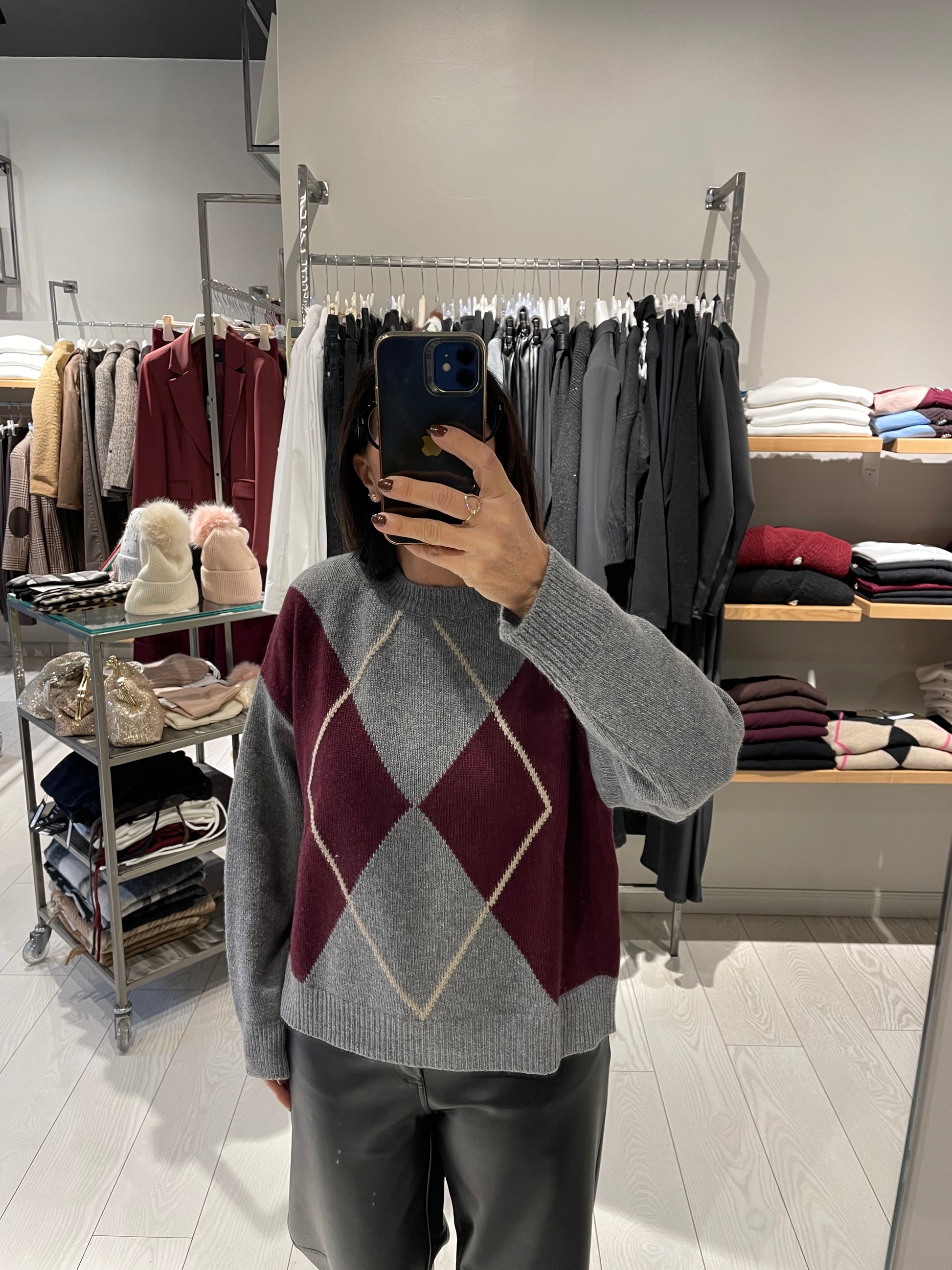 Girocollo con motivo a rombi nella parte anteriore, modello over caldo e morbido, capo disponibile in taglia unica che veste fino ad una L