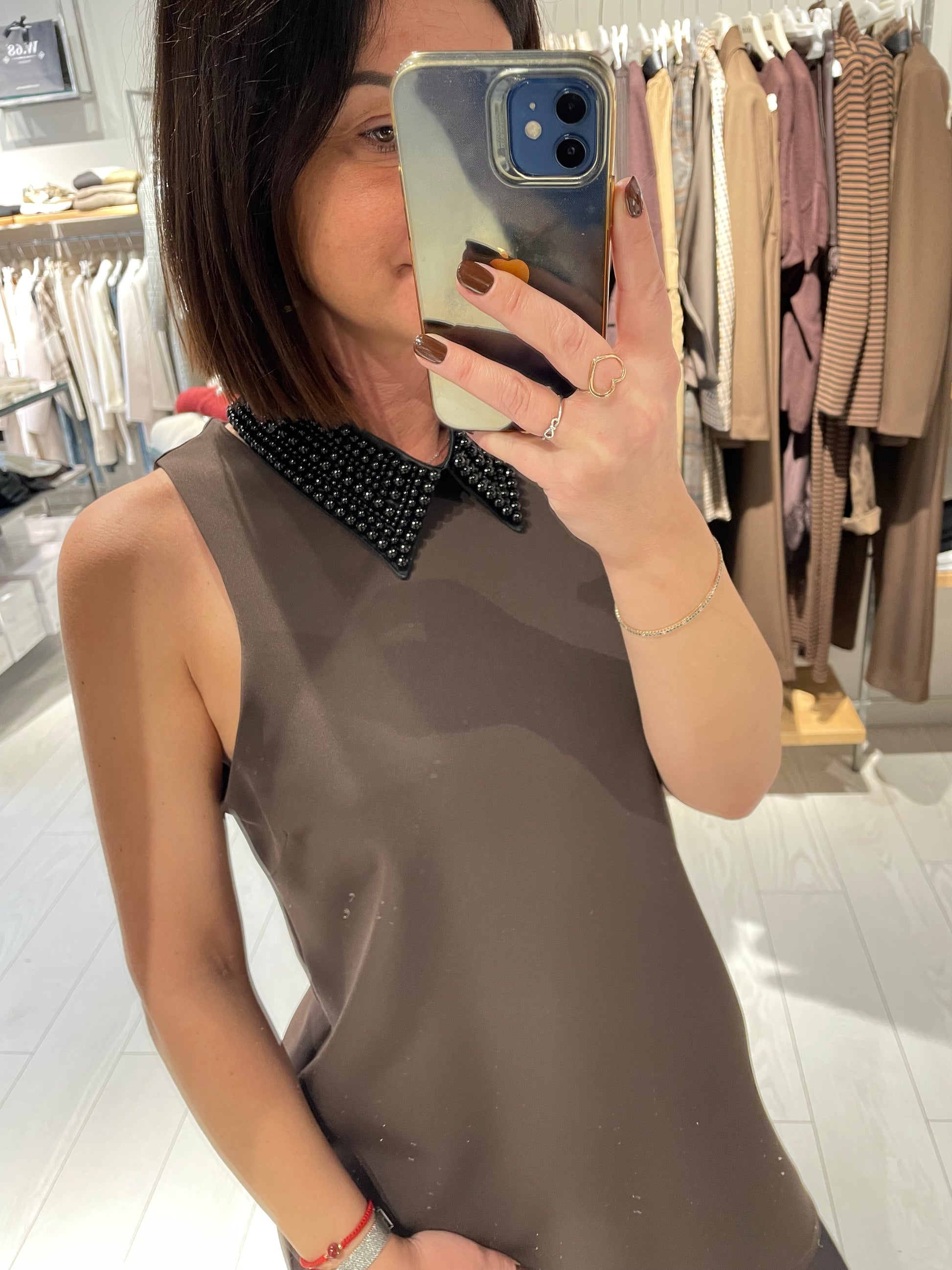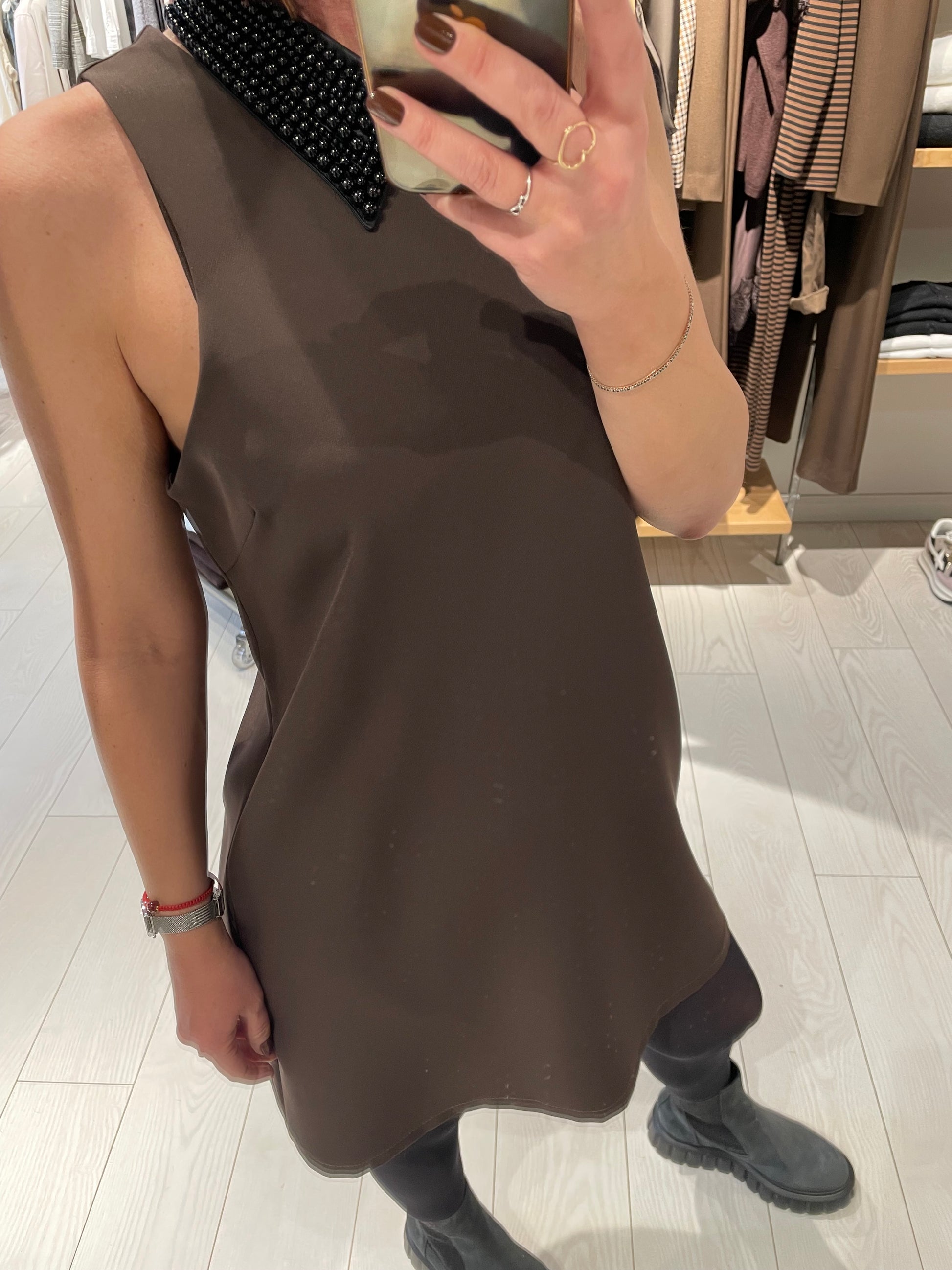 Abito svasato smanicato, impreziosito dal un colletto removibile utilizzabile su altri capi, la vestibilità è regolare, la modella in foto indossa una taglia S ed è alta 1,68 m circa