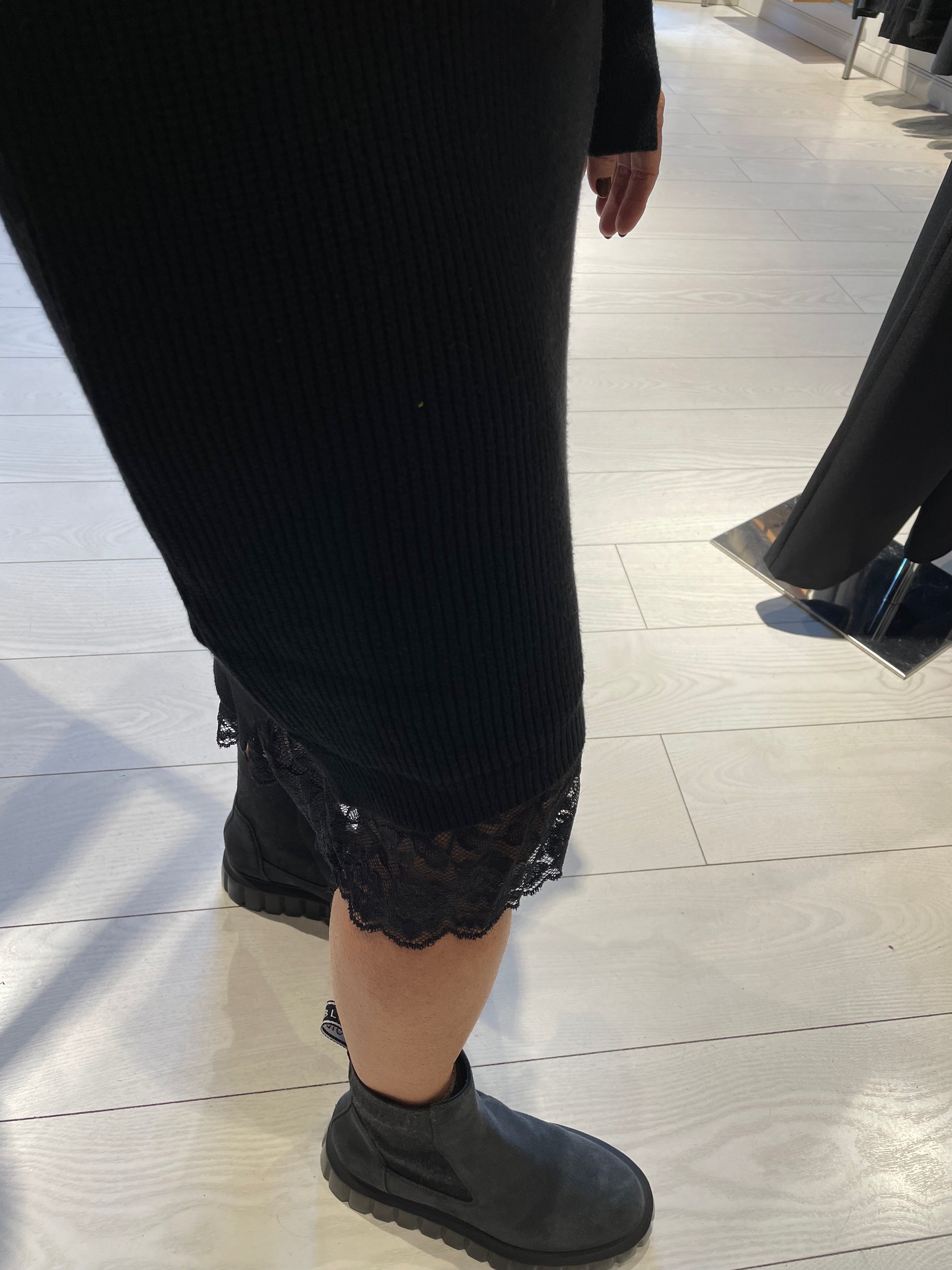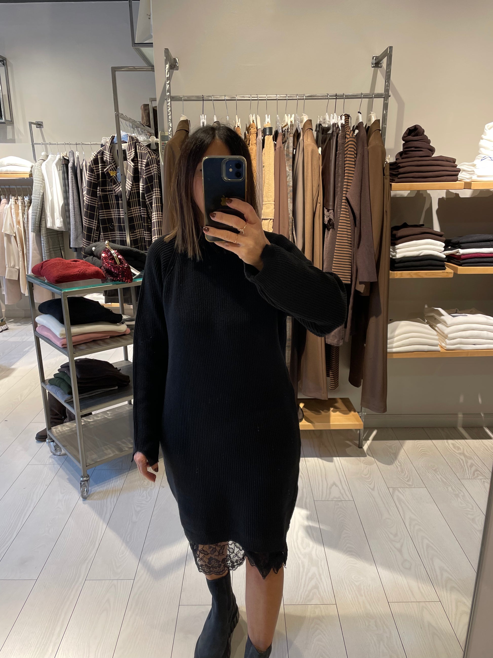 Abito in maglia con scollo a cratere e pizzo al fondo, modello a sacco disponibile in taglia unica che può essere indossato fino ad una L, la modella in foto è alta 1.60 m circa