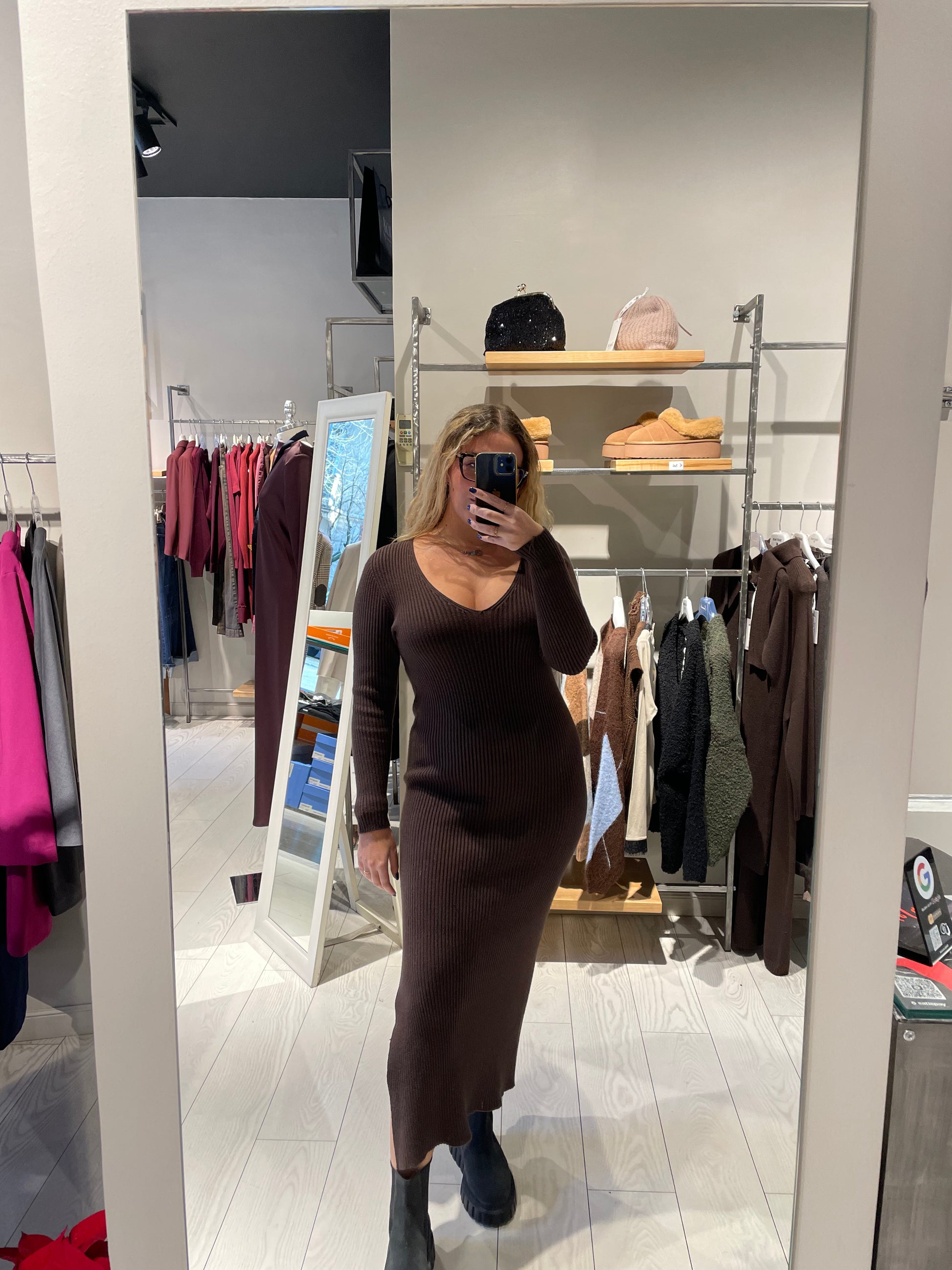Abito in maglia con scollo a V che valorizza la silhouette grazie alla linea tubolare essenziale. Realizzato in tessuto elasticizzato che garantisce comfort e aderenza perfetta, si adatta a diverse morfologie con la sua taglia unica. Un capo versatile e raffinato, ideale per occasioni casual e semi-formali, che combina praticità e eleganza senza compromessi. La modella in foto è alta 1.65 m circa