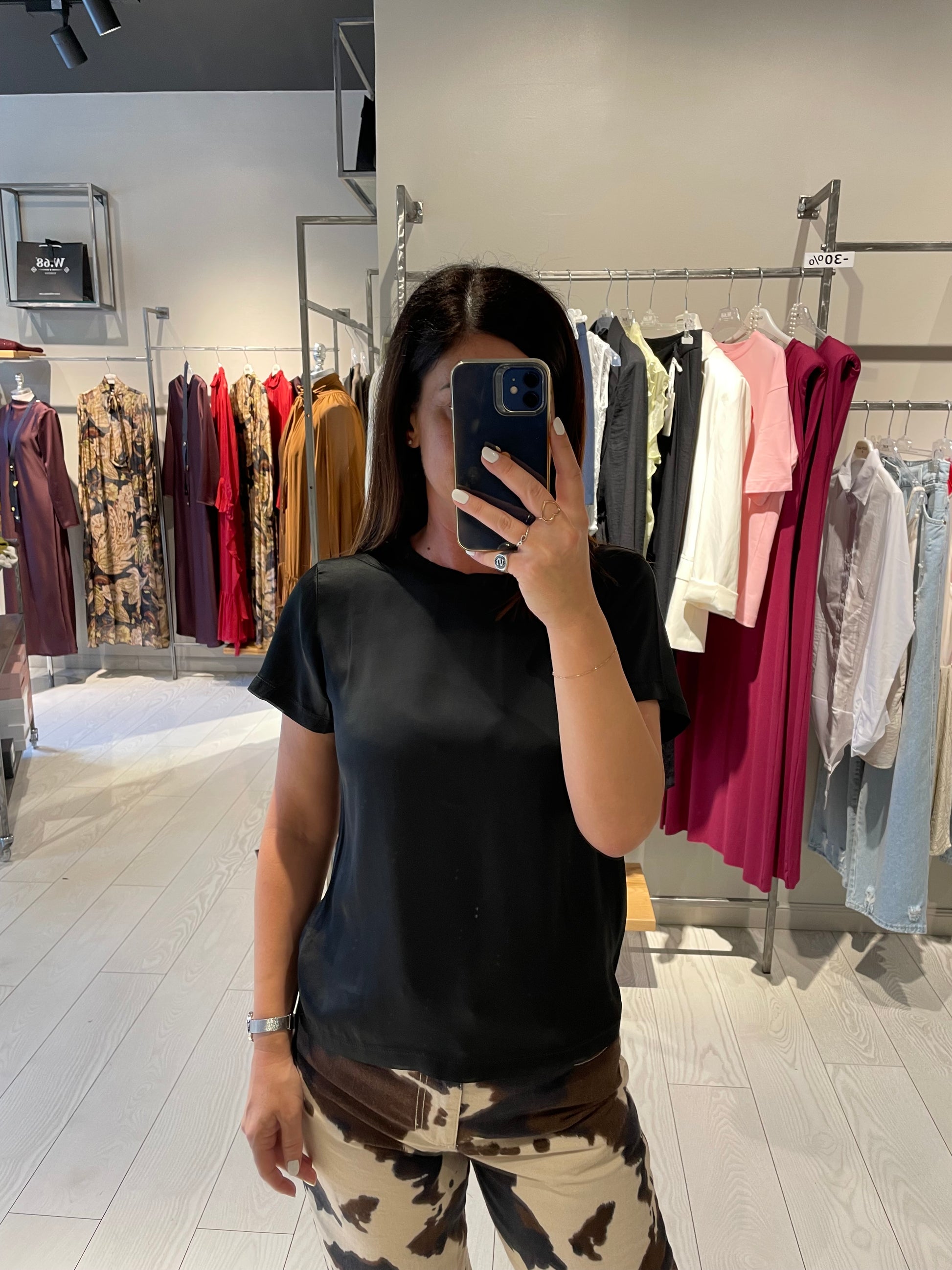 Blusa con manica corta girocollo, leggermente elasticizzata, la vestibilità è regolare, la modella indossa una taglia S ed è alta 1,68 m circa