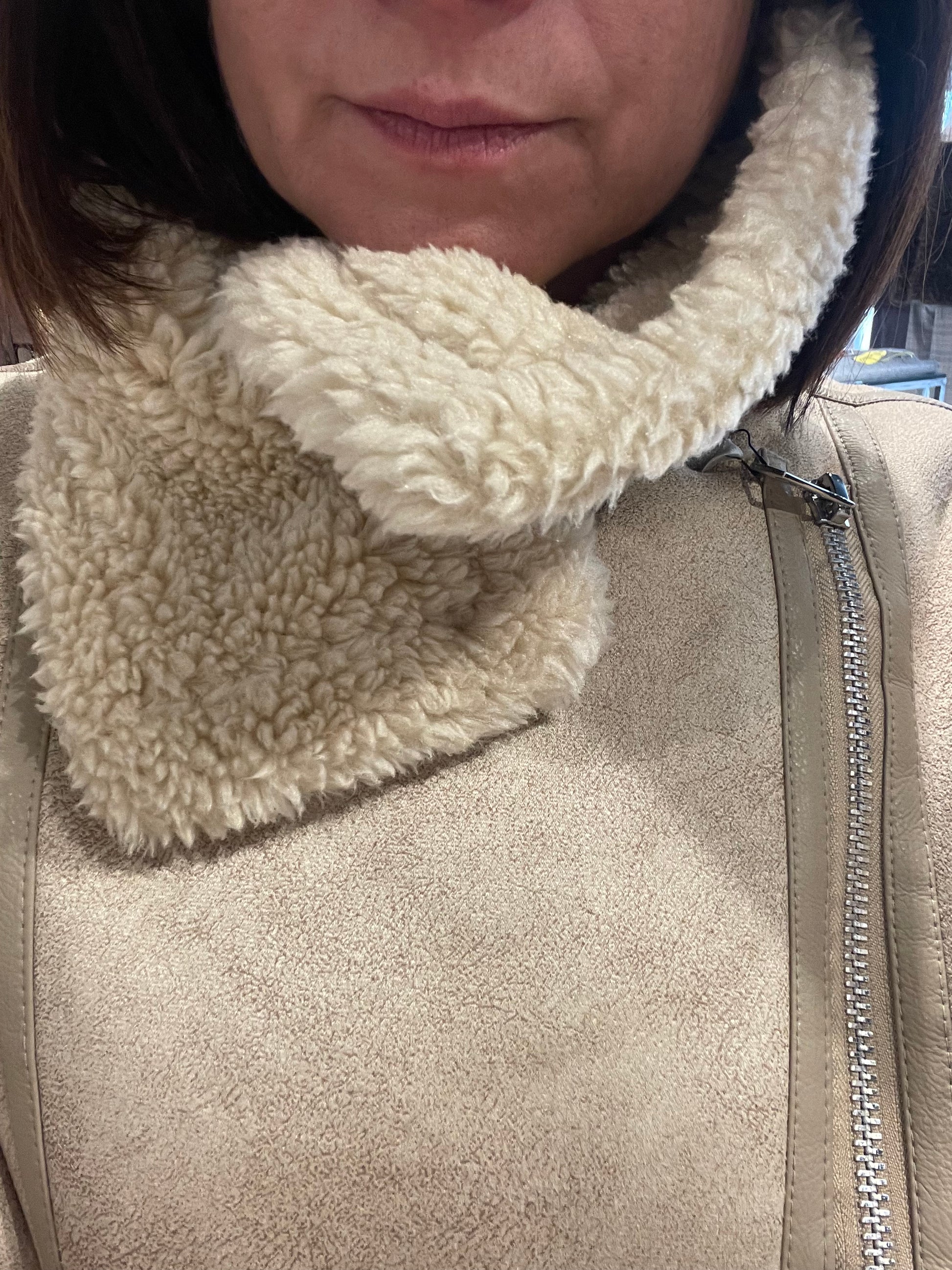 Giacca in eco montone, modello chiodo over con chiusura laterale, tasche e fibbie in vita, caldo e morbido, la vestibilità è regolare, la modella in foto indossa una taglia S ed è alta 1,68 m circa