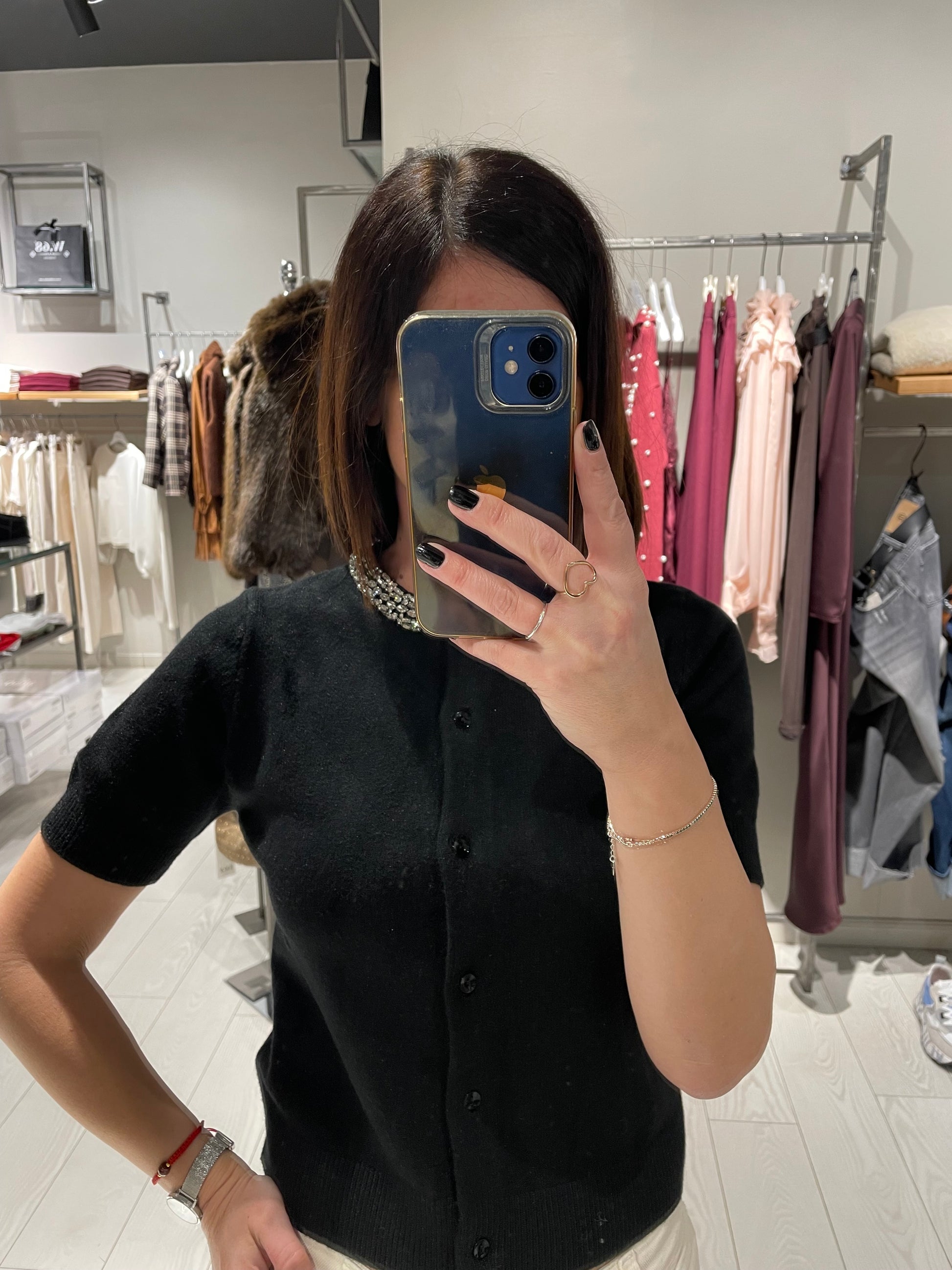 Cardigan a manica corta con strass sul colletto alla coreana, la vestibilità è regolare, la modella indossa una taglia S ed è alta 1,68 m circa