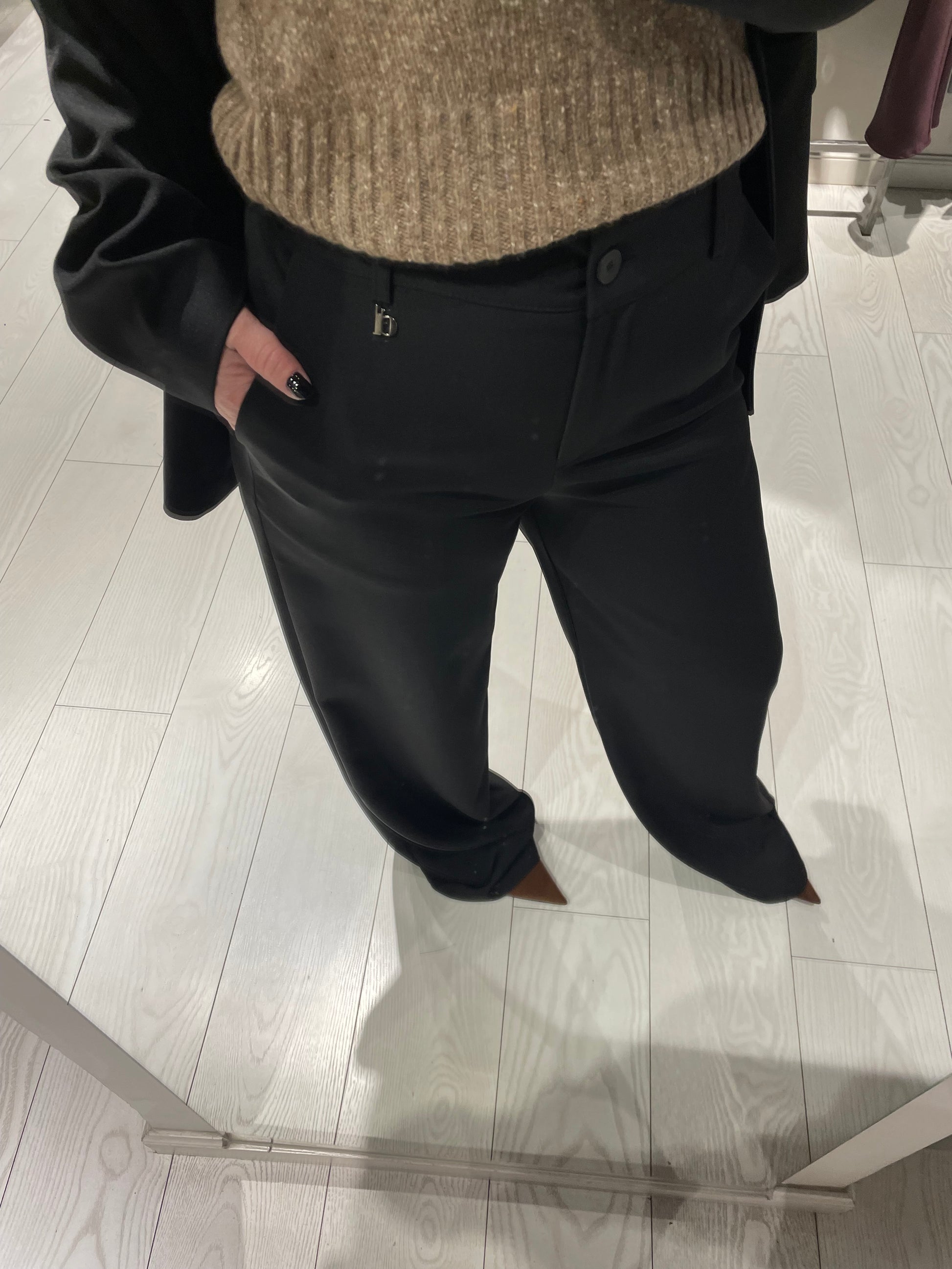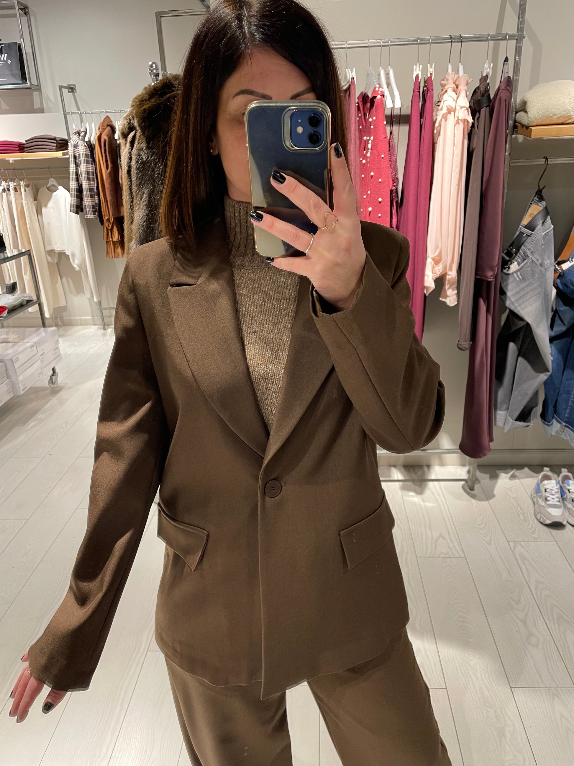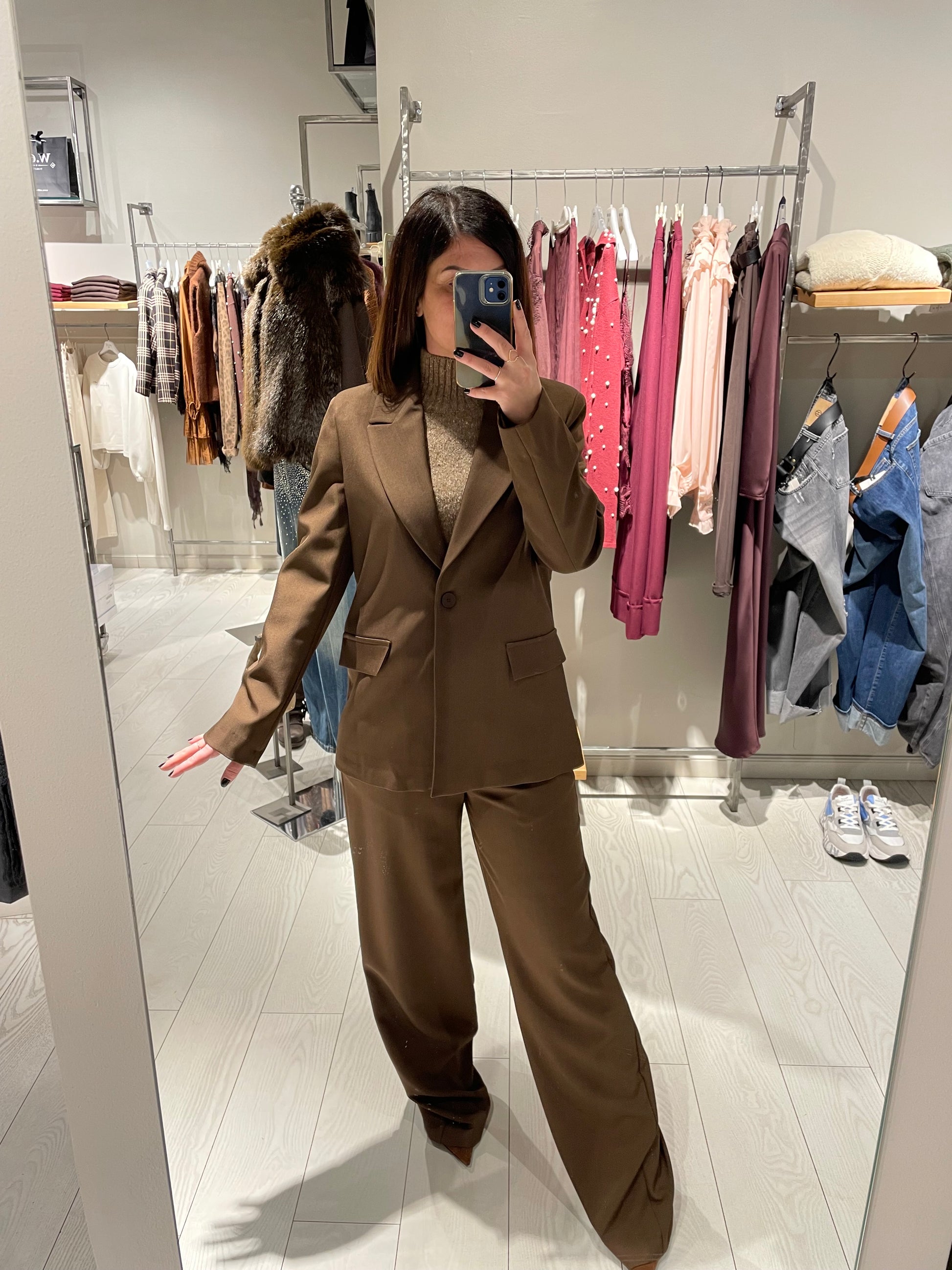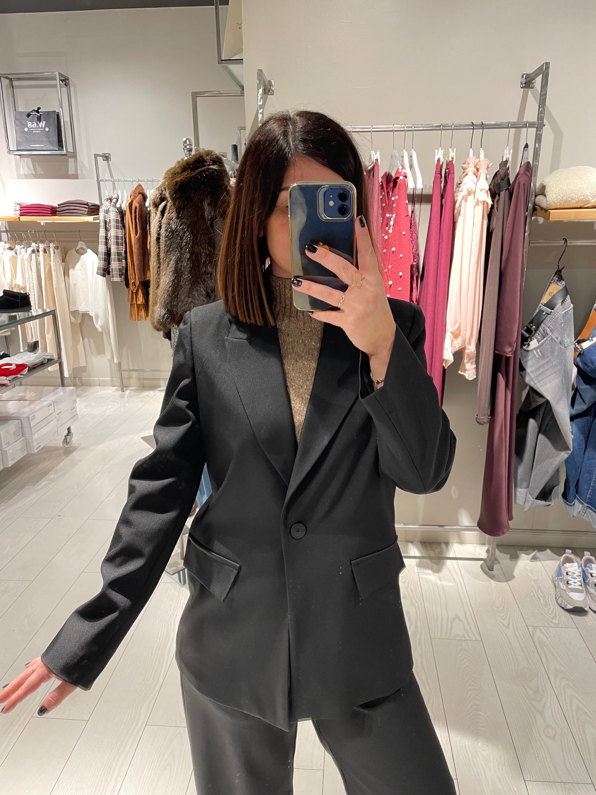 Completo composto da giacca dal fit leggermente aderente e pantalone modello dritto con elastico a molla nella schiena e passanti, la vestibilità è regolare la modella in foto indossa una S ed è alta 1,68 m circa