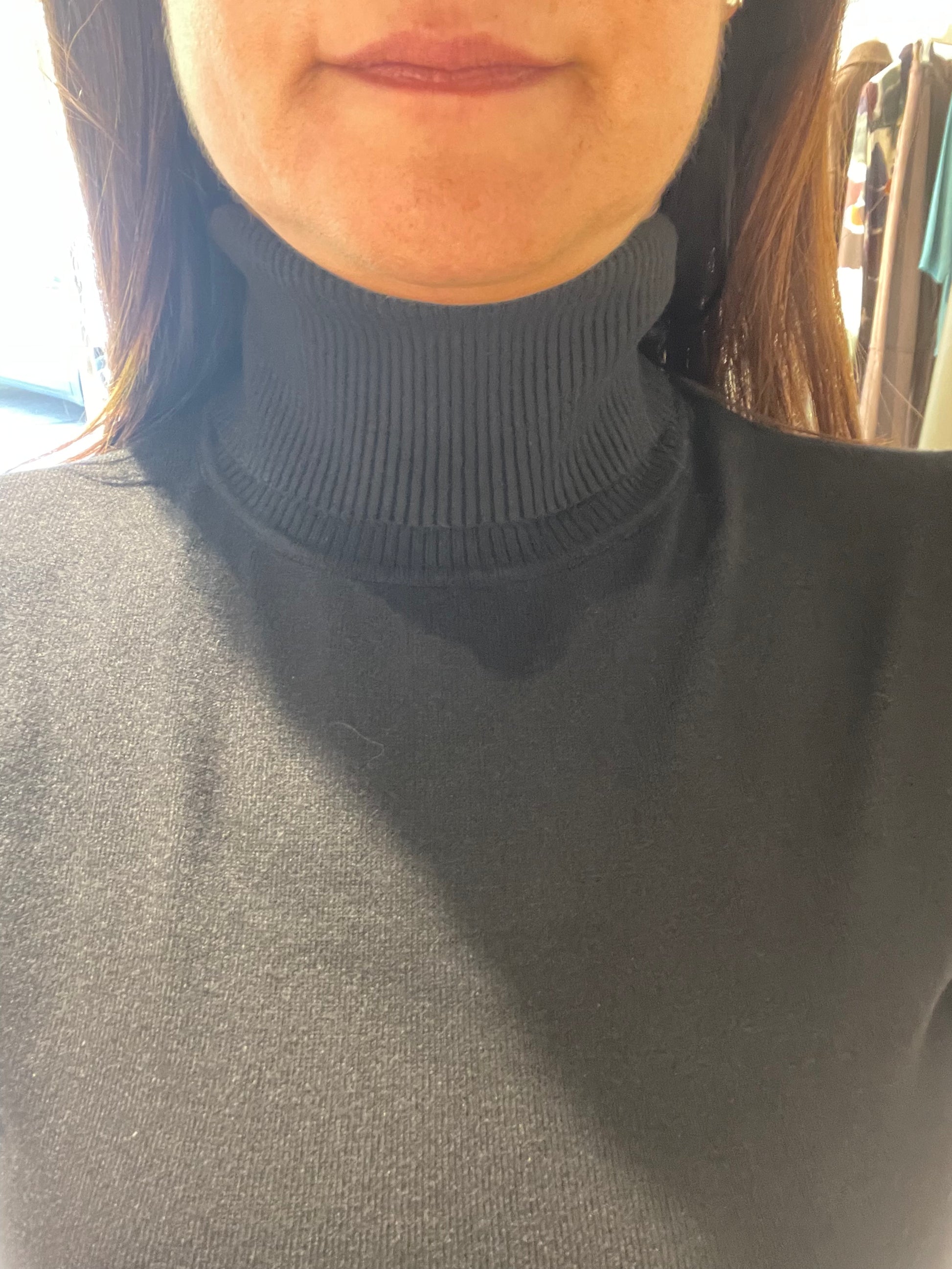 Dolcevita aderente con manica corta, capo disponibile in taglia unica che veste fino ad una L, la modella à alta 1,68 m circa