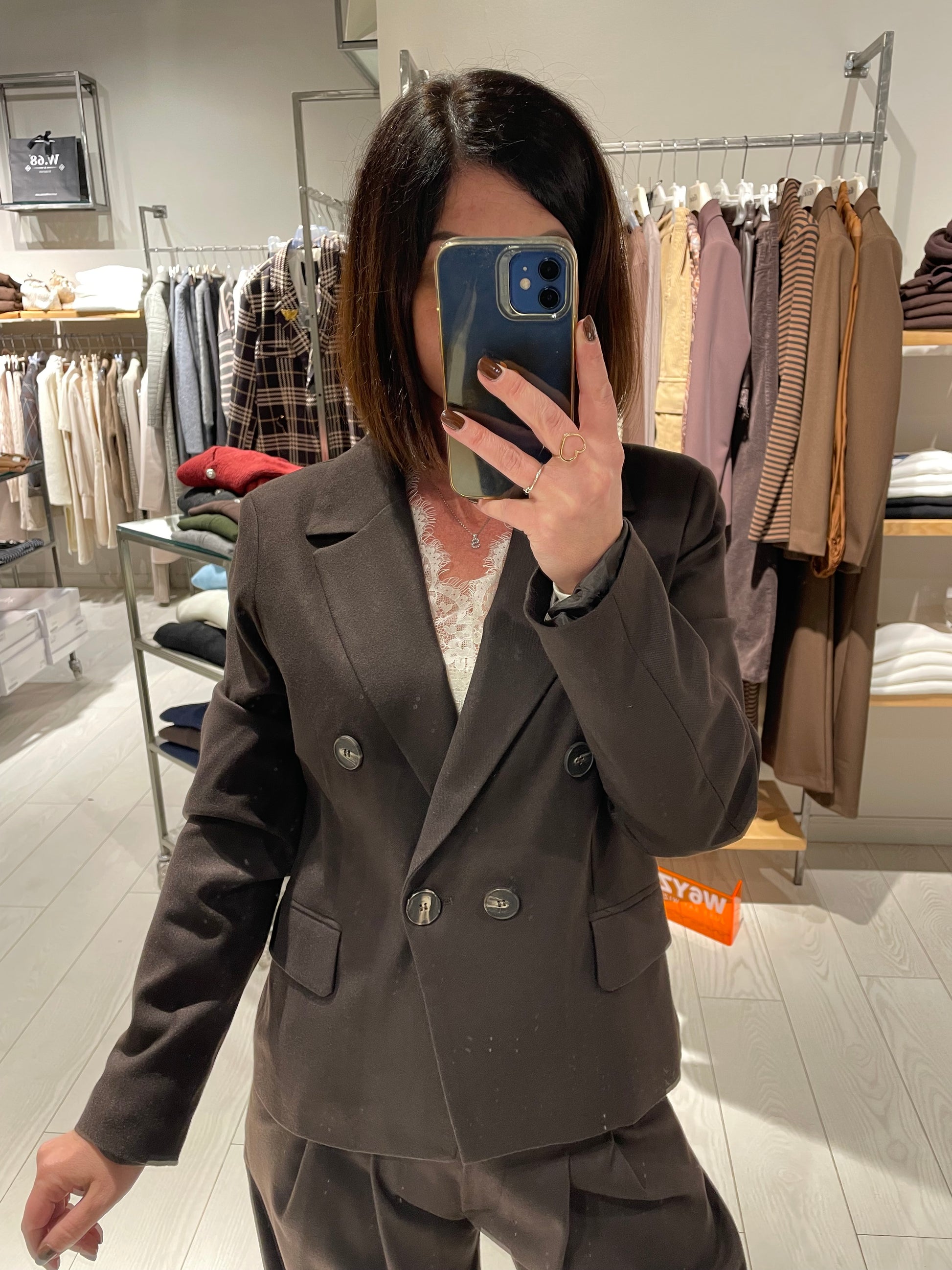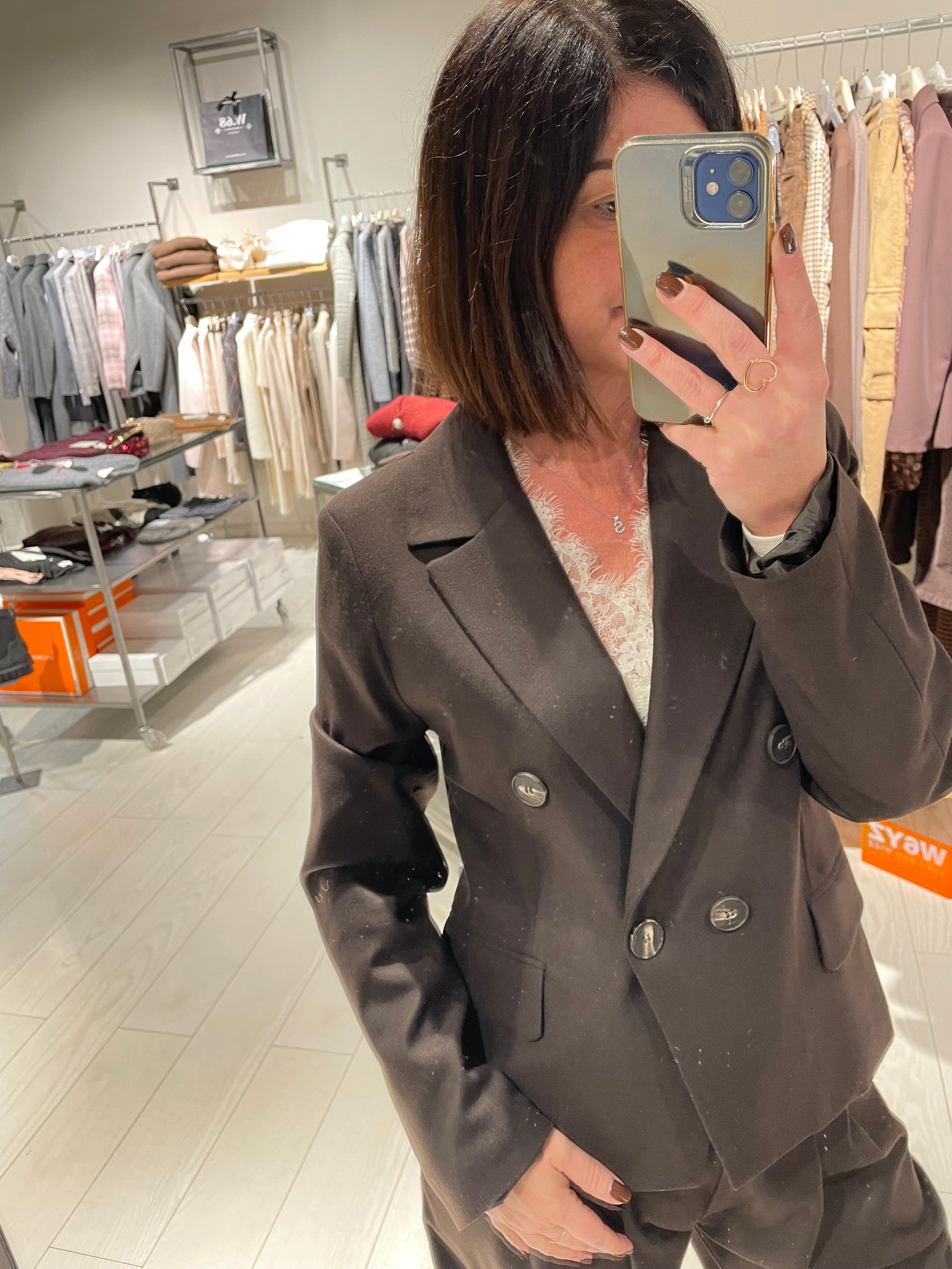 Giacca doppio petto dal fit asciutto, tessuto caldo e morbido, da abbinare al suo pantalone per avere un completo, la vestibilità è regolare, la modella indossa una taglia S ed è alta 1,68 m circa