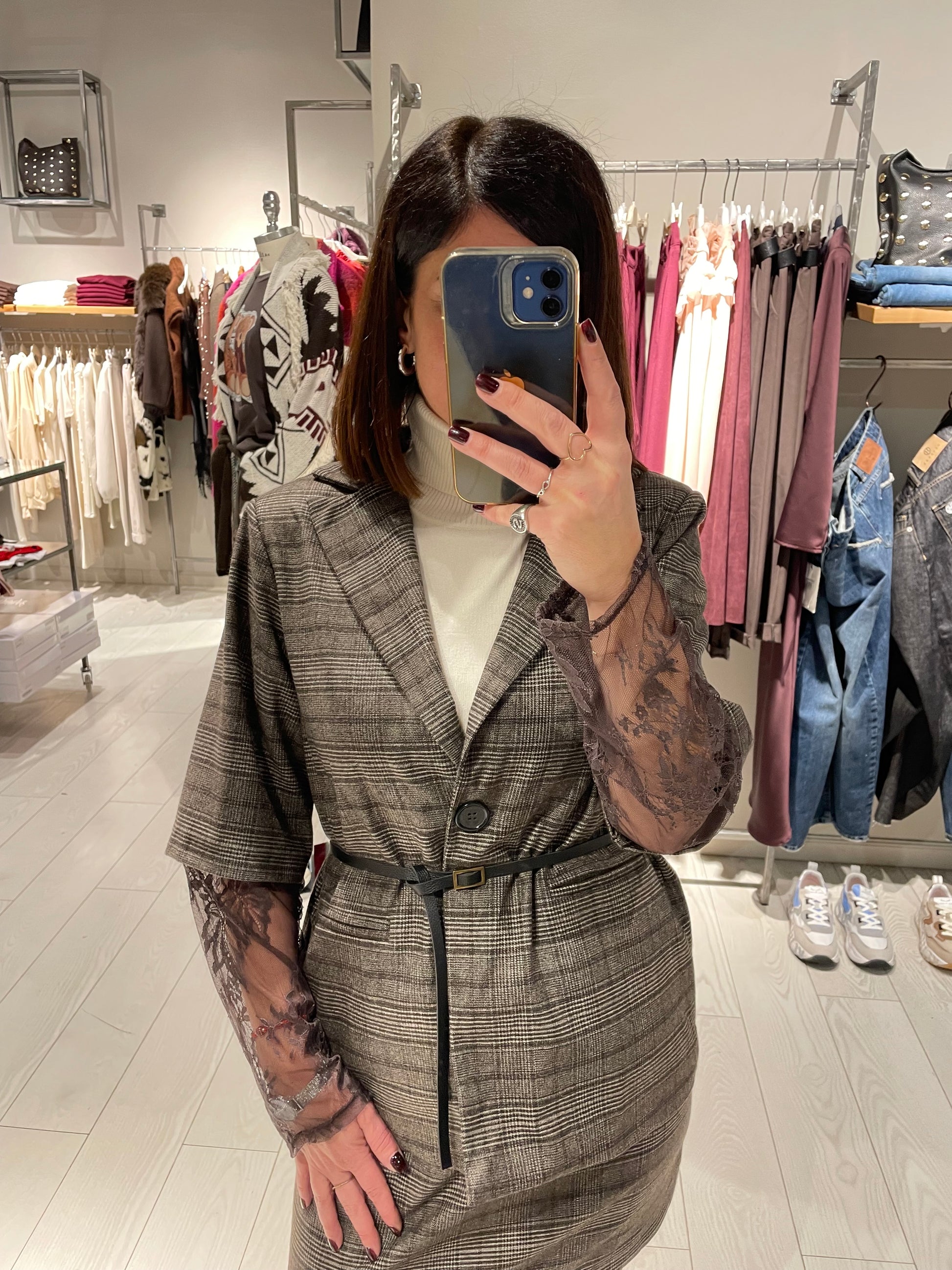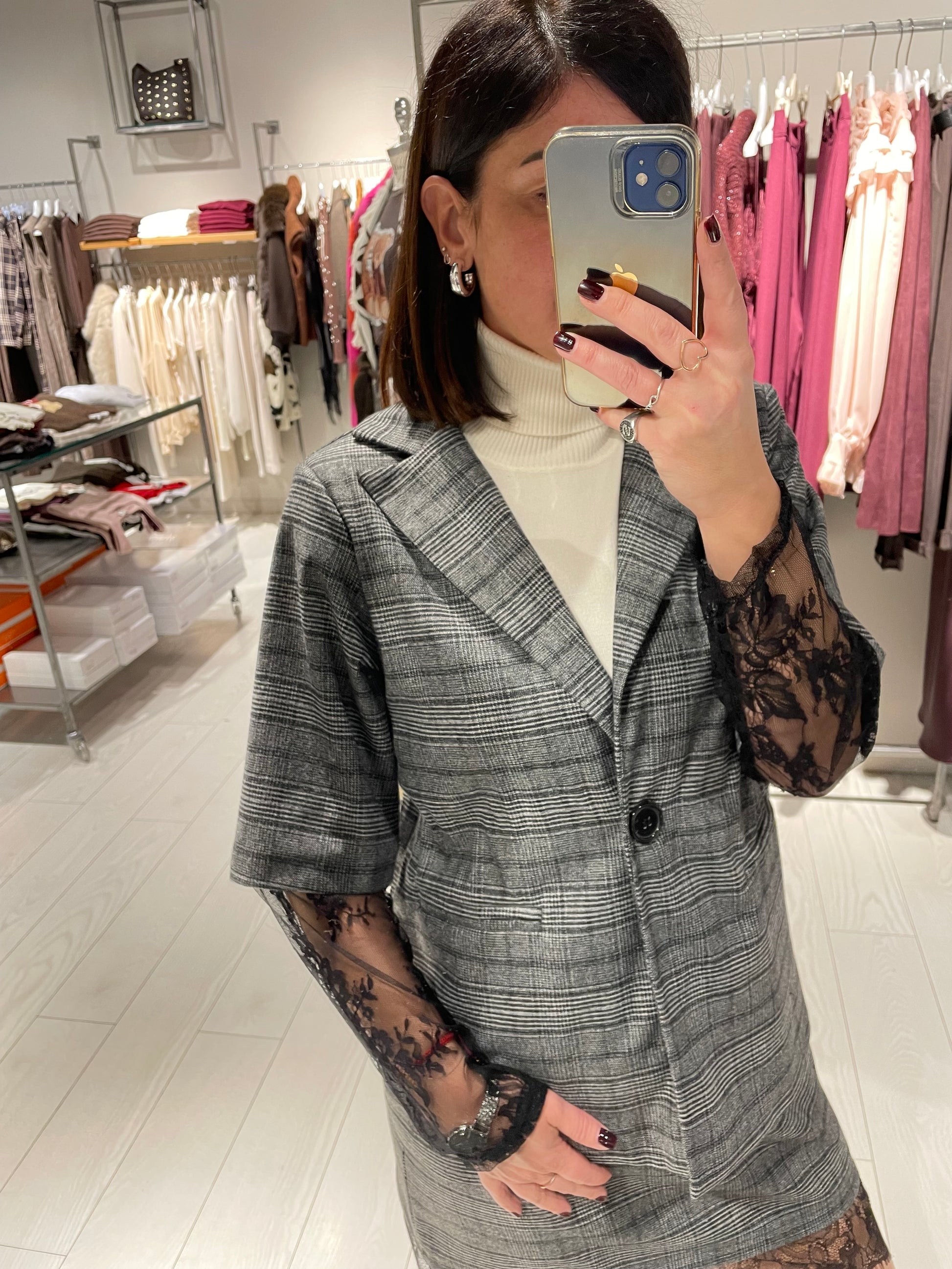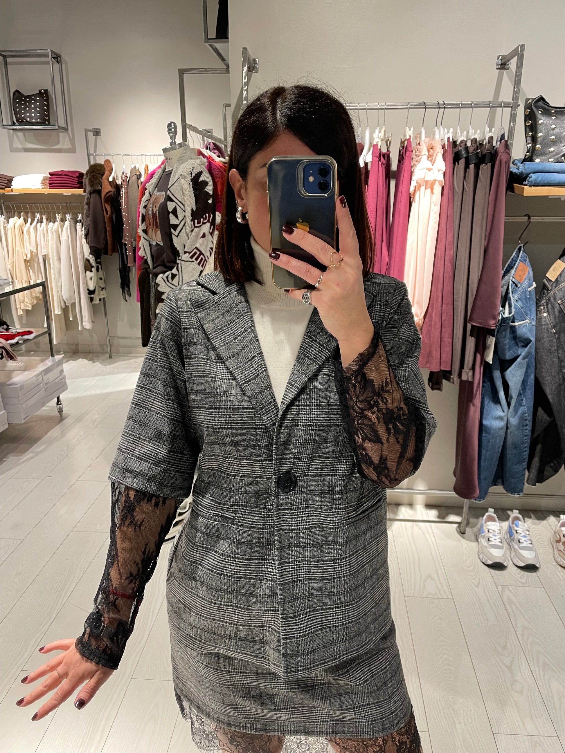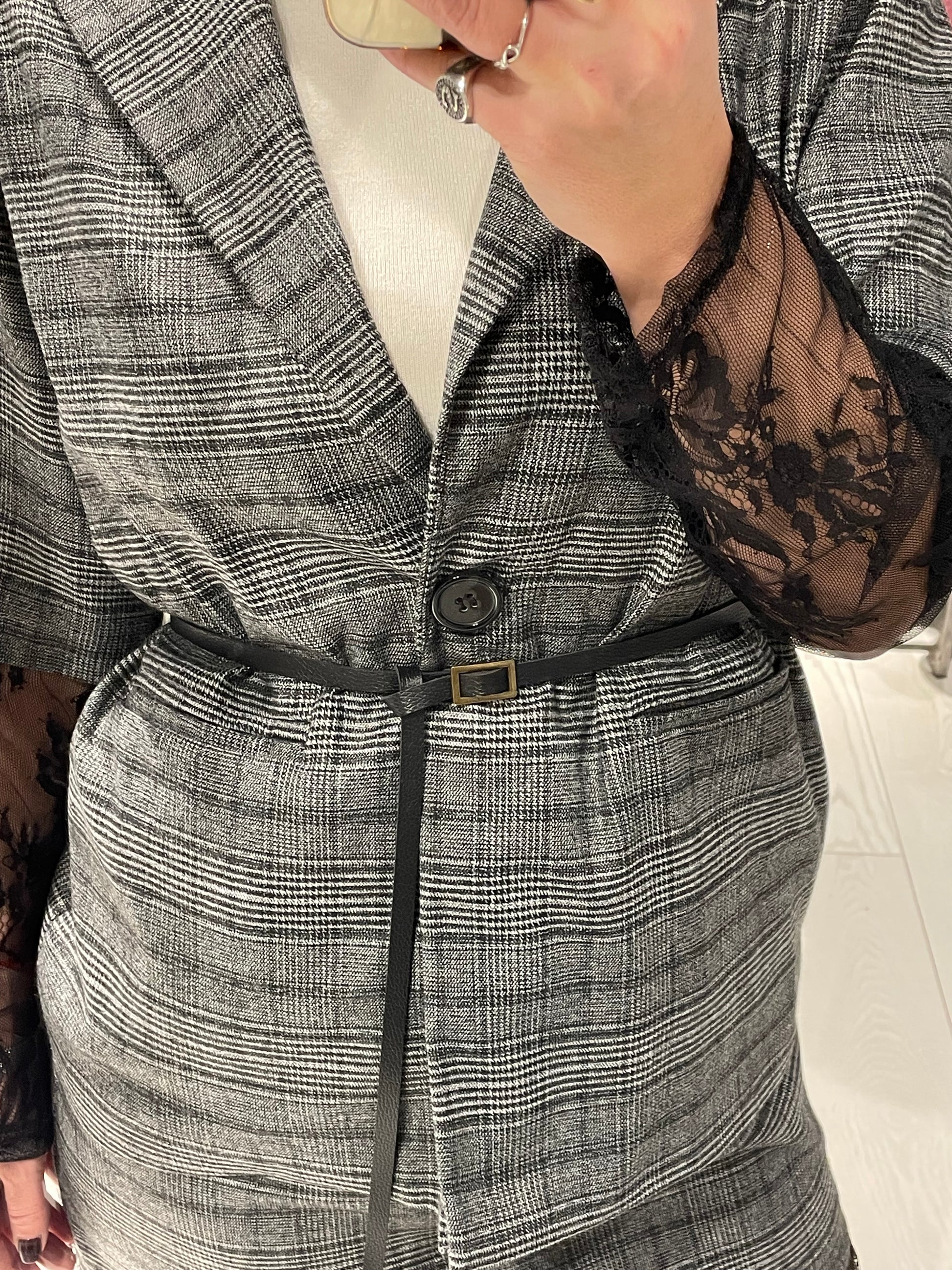 Giacca con manica in pizzo, chiusura un bottone con cinturina, possibilità di abbinare la sua minigonna per avere un completo,la vestibilità è regolare, la modella in voto indossa una taglia S ed è alta 1,68 m circa