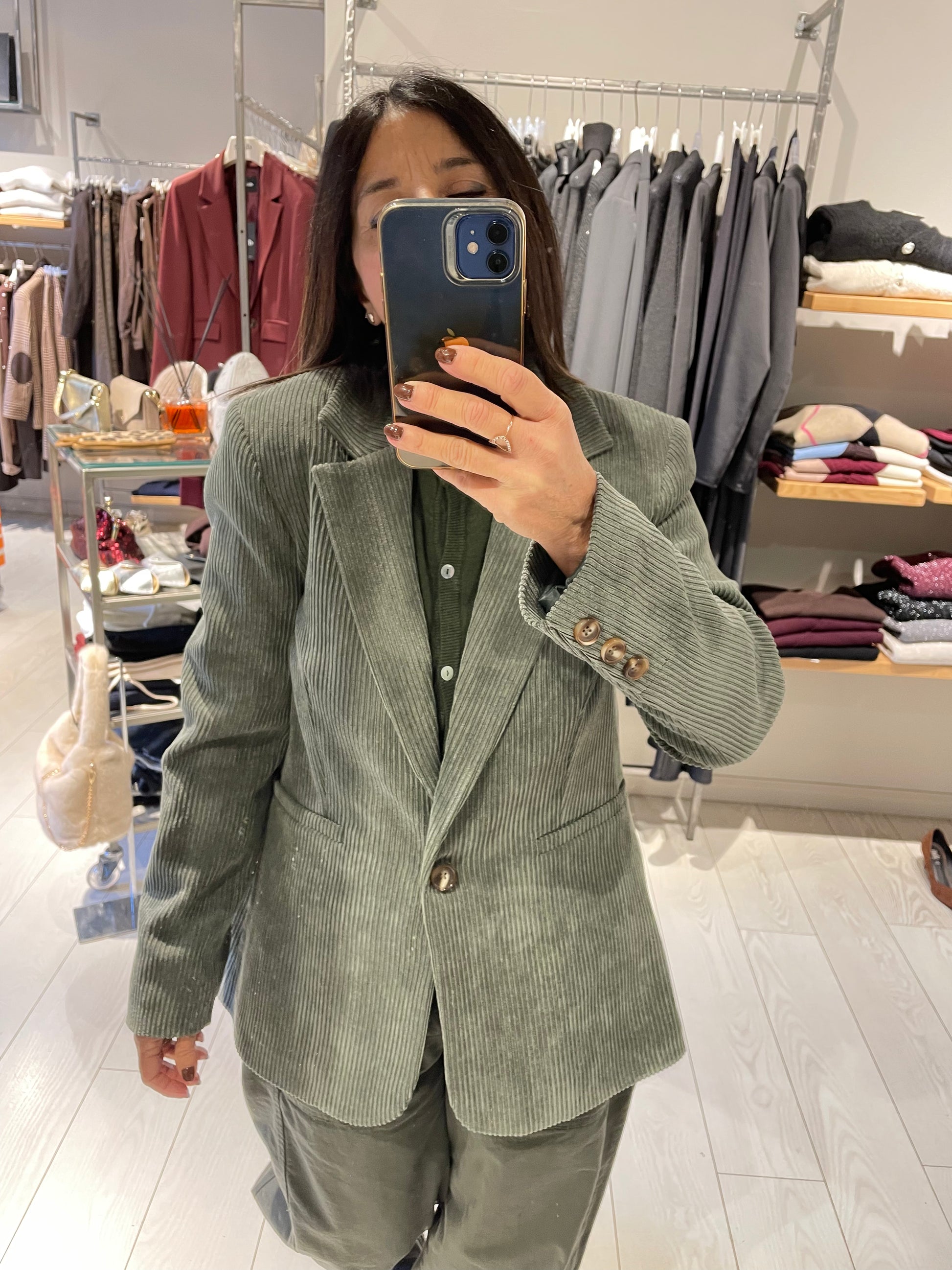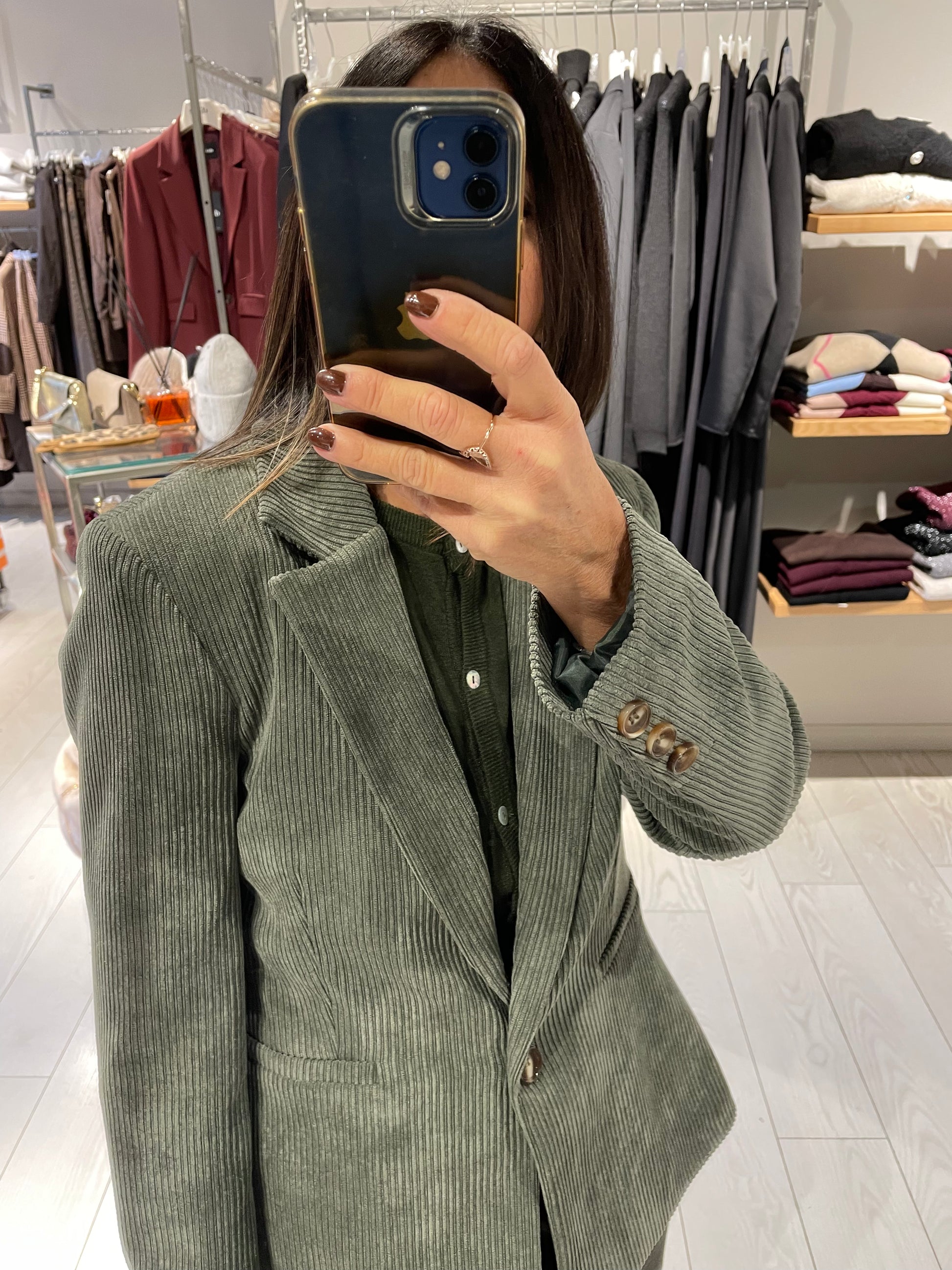 Giacca in velluto a coste, chiusura un bottone, interamente foderata, la vestibilità è regolare, la modella in foto indossa una taglia S ed è alta 1.68 m circa