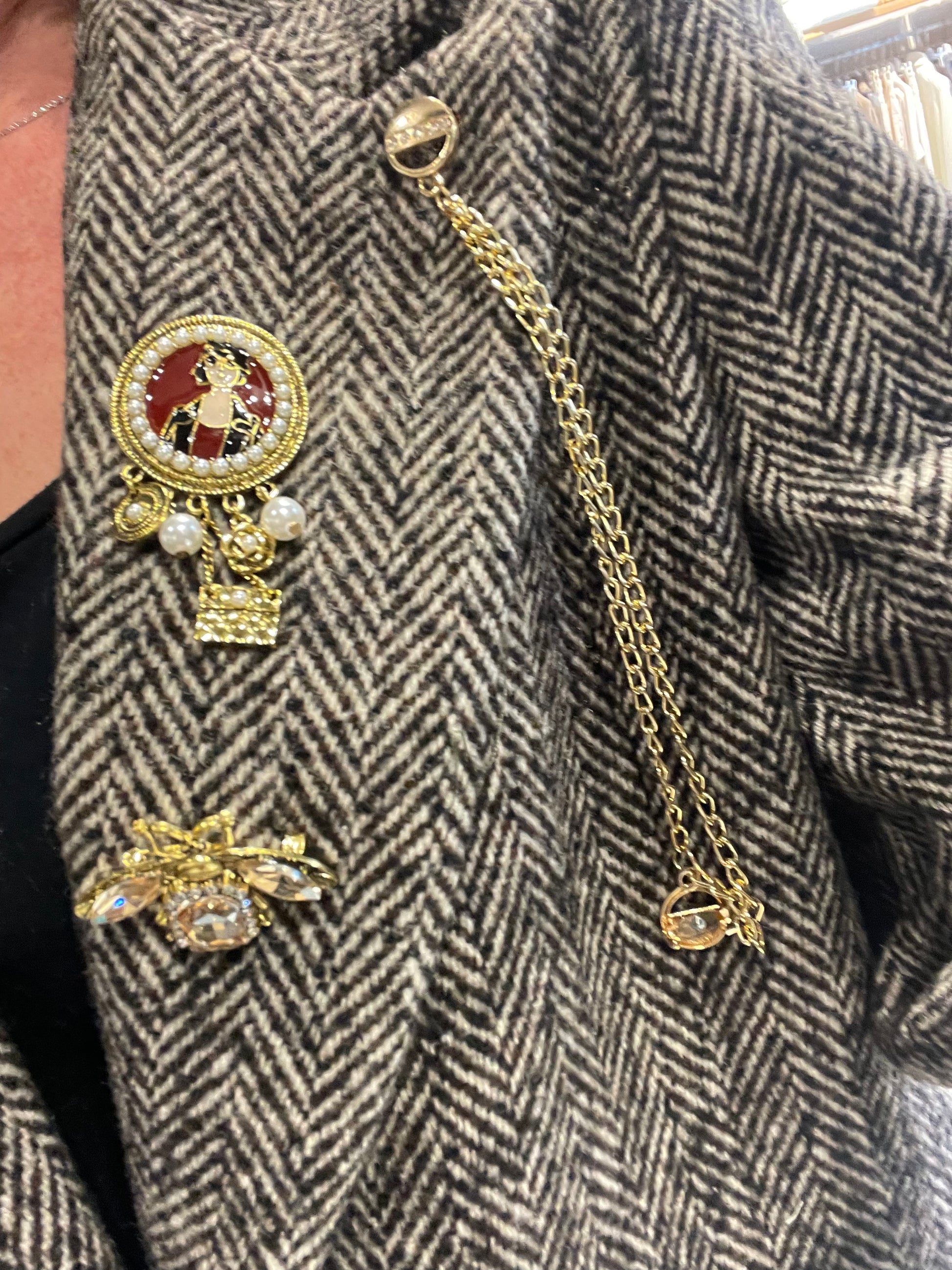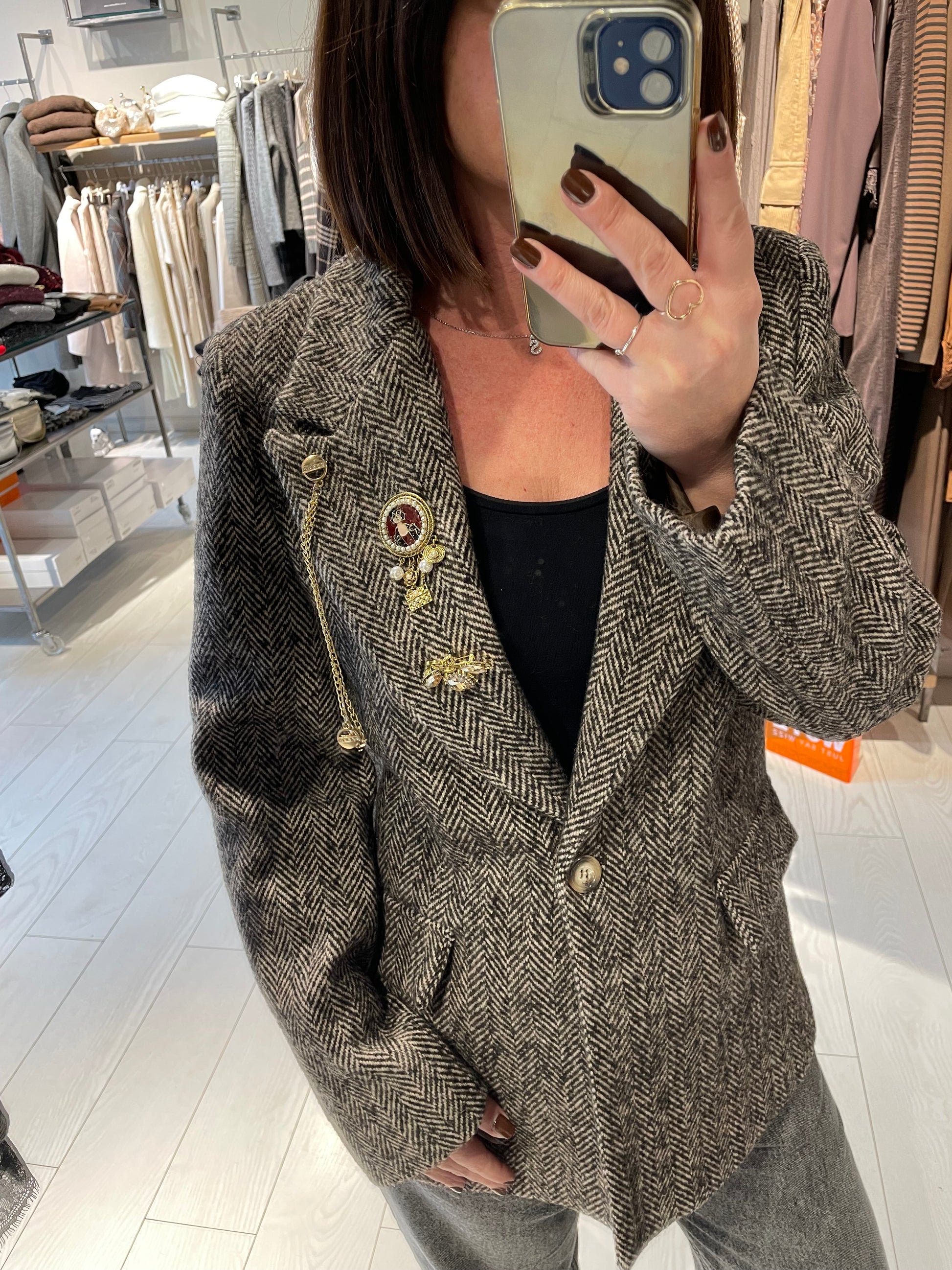 Giacca mono bottone con spille e cabochon removibili, tessuto spigato, interamente foderata, la vestibilità è regolare, la modella in foto indossa una taglia S ed è alta 1.68 m circa
