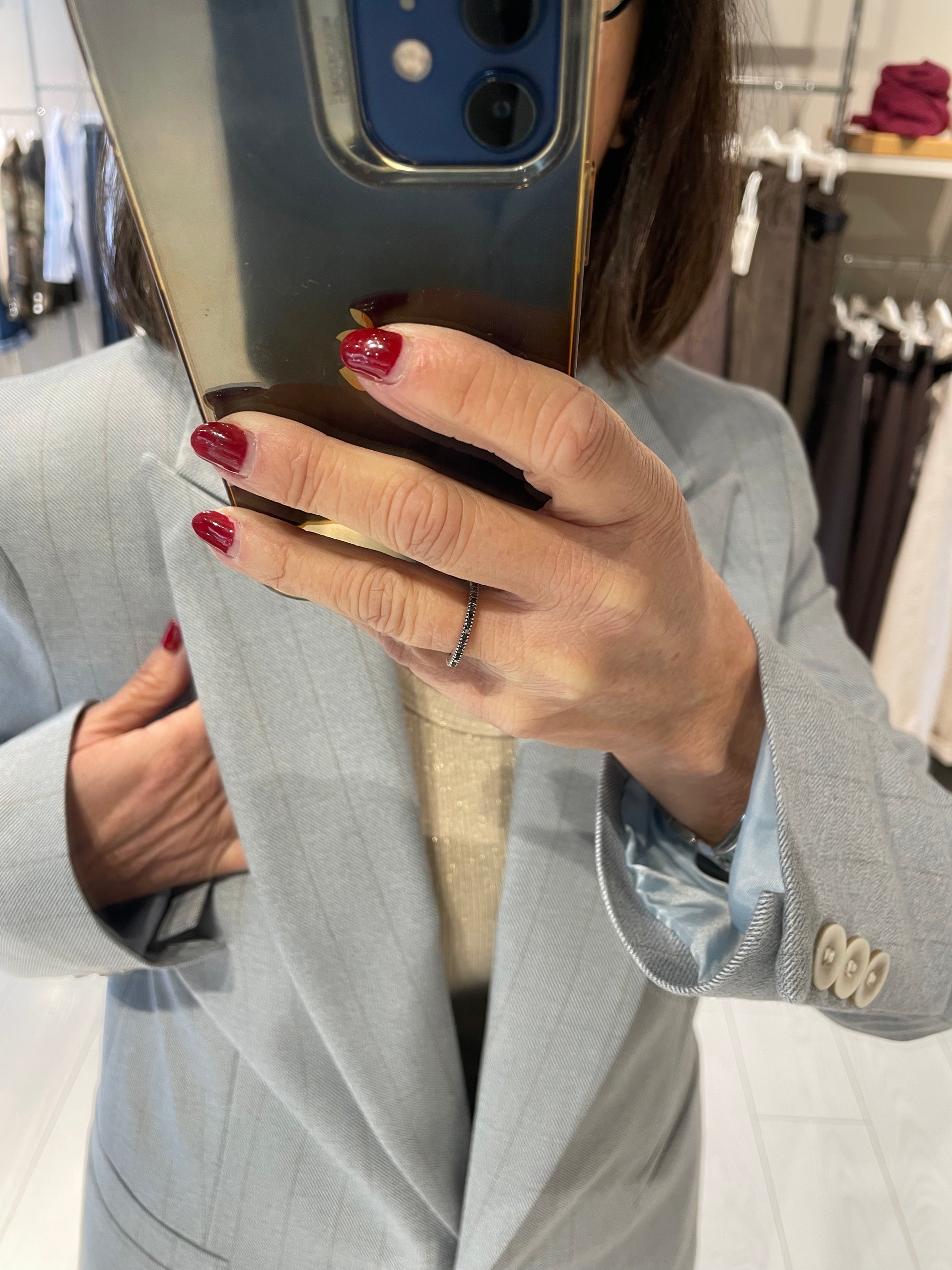 Bellissimo, con una particolare apertura, taglio perfetto, leggermente over, punta di grigio molto piacevole. Super contenta