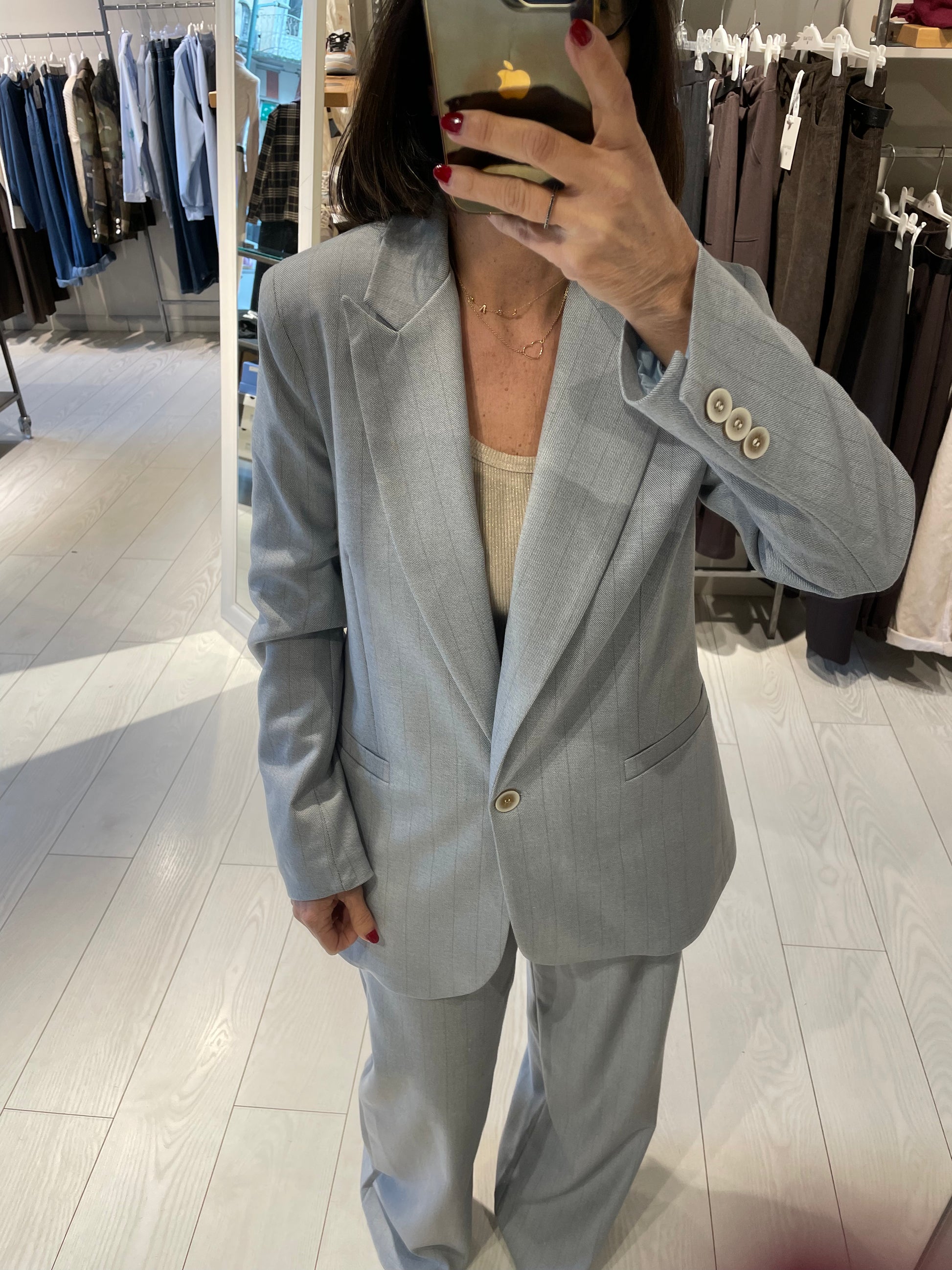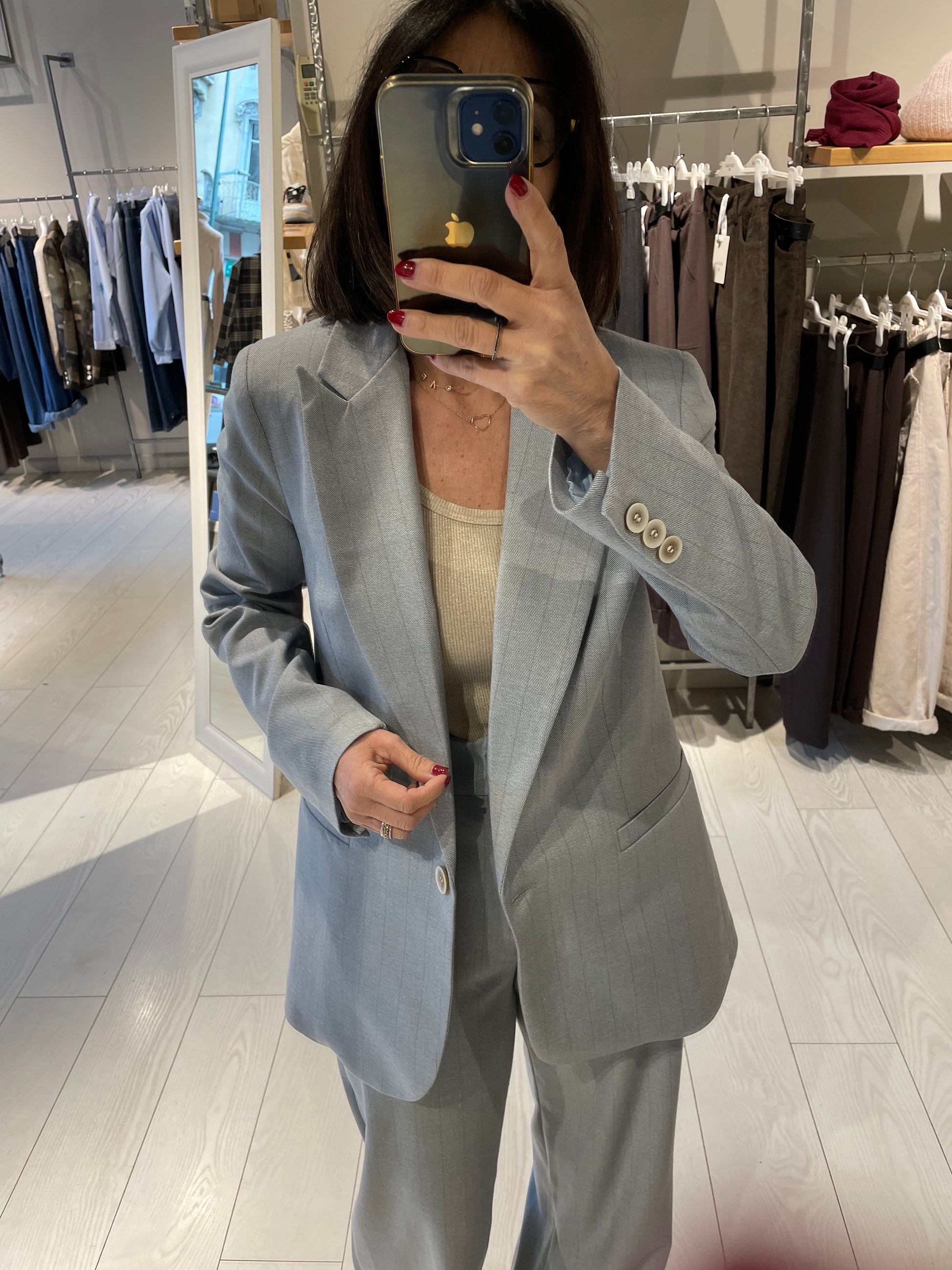 Giacca monopetto in tessuto gessato con finitura elegante e sofisticata. Il taglio regolare assicura una vestibilità comoda e versatile, adatto a molteplici occasioni. La fodera interna garantisce comfort durante l'indosso e protezione del tessuto esterno. Abbinata la suo pantalone è perfetta per chi ricerca un capo classico dal design senza tempo, ideale per un look professionali e casual con stile. La modella in foto indossa una taglia S ed è alta 1.60 m circa