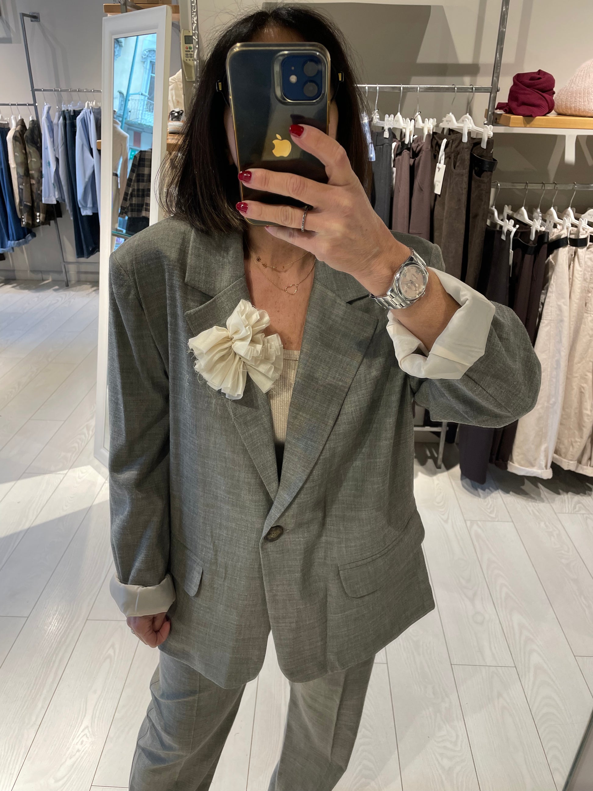 Giacca over con spilla dalla vestibilità ampia e accogliente, completamente foderata per garantire comfort e durabilità nel tempo. Disponibile in taglia unica, si distingue per la sua versatilità e può essere abbinata al pantalone coordinato per creare un completo elegante e coeso. Perfetta per chi desidera un capo poliedrico che si adatta a molteplici occasioni, mantenendo uno stile raffinato e contemporaneo. La modella in foto è alta 1.60 m circa
