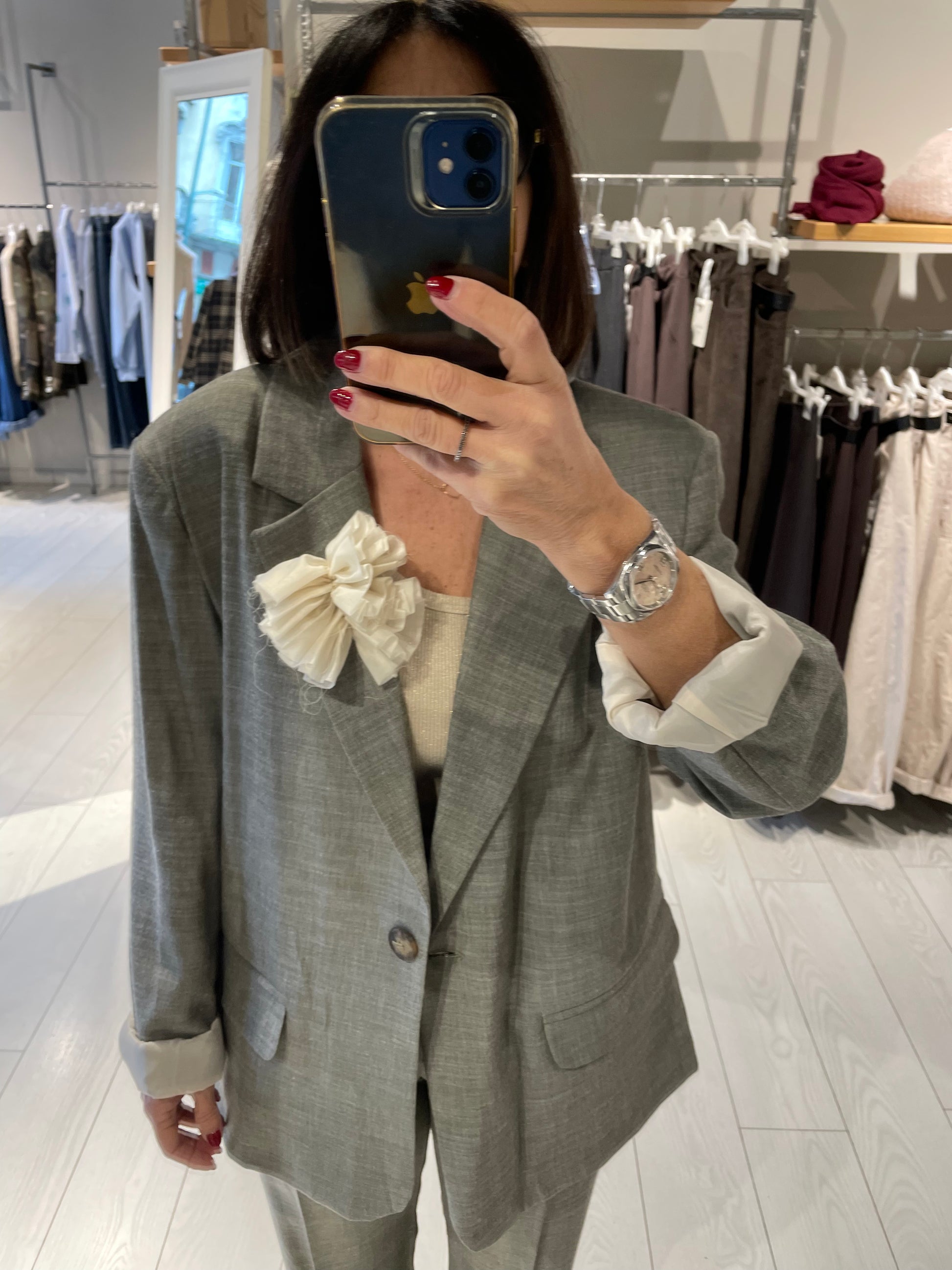Bellissimo, con una particolare apertura, taglio perfetto, leggermente over, punta di grigio molto piacevole. Super contenta