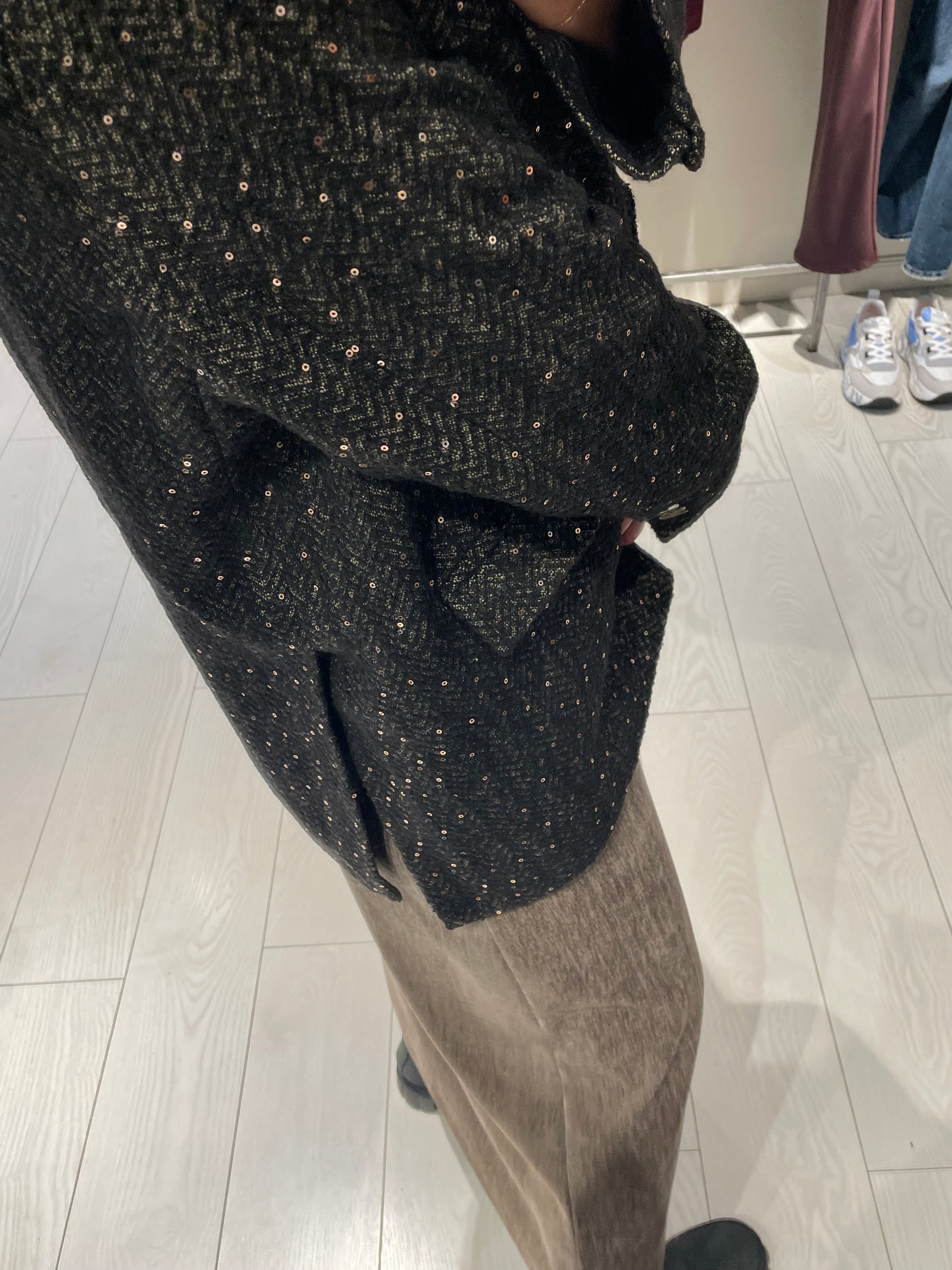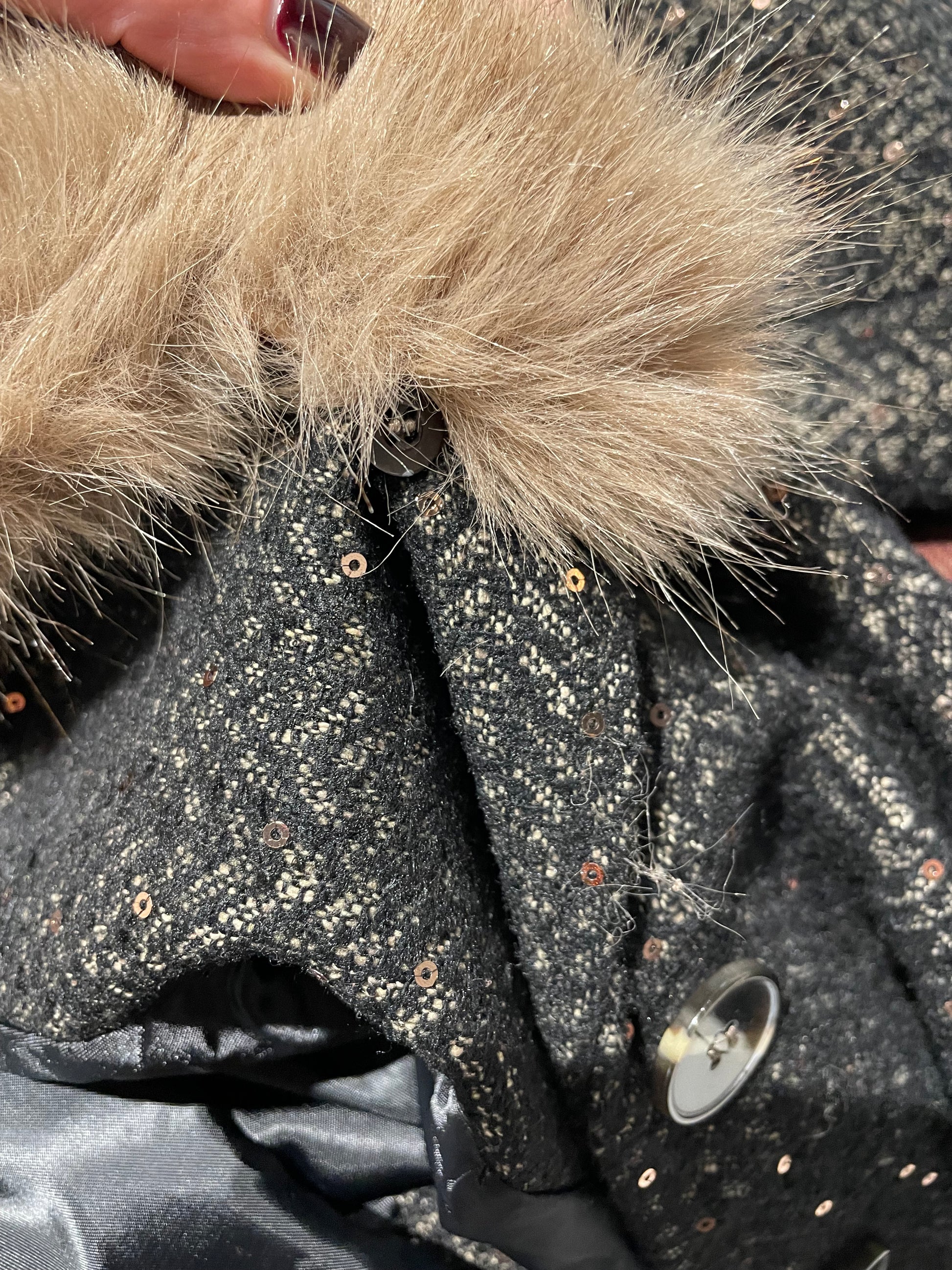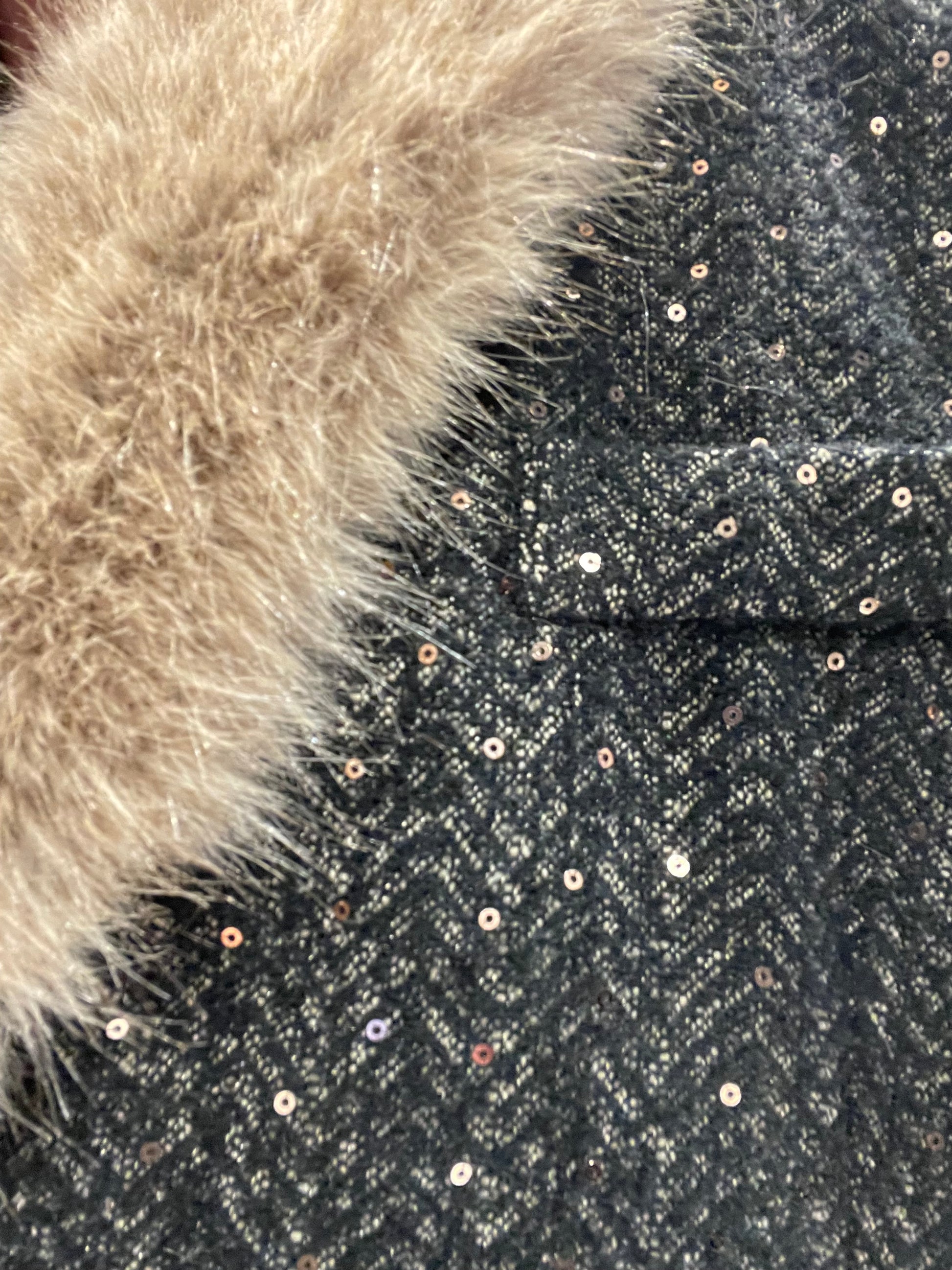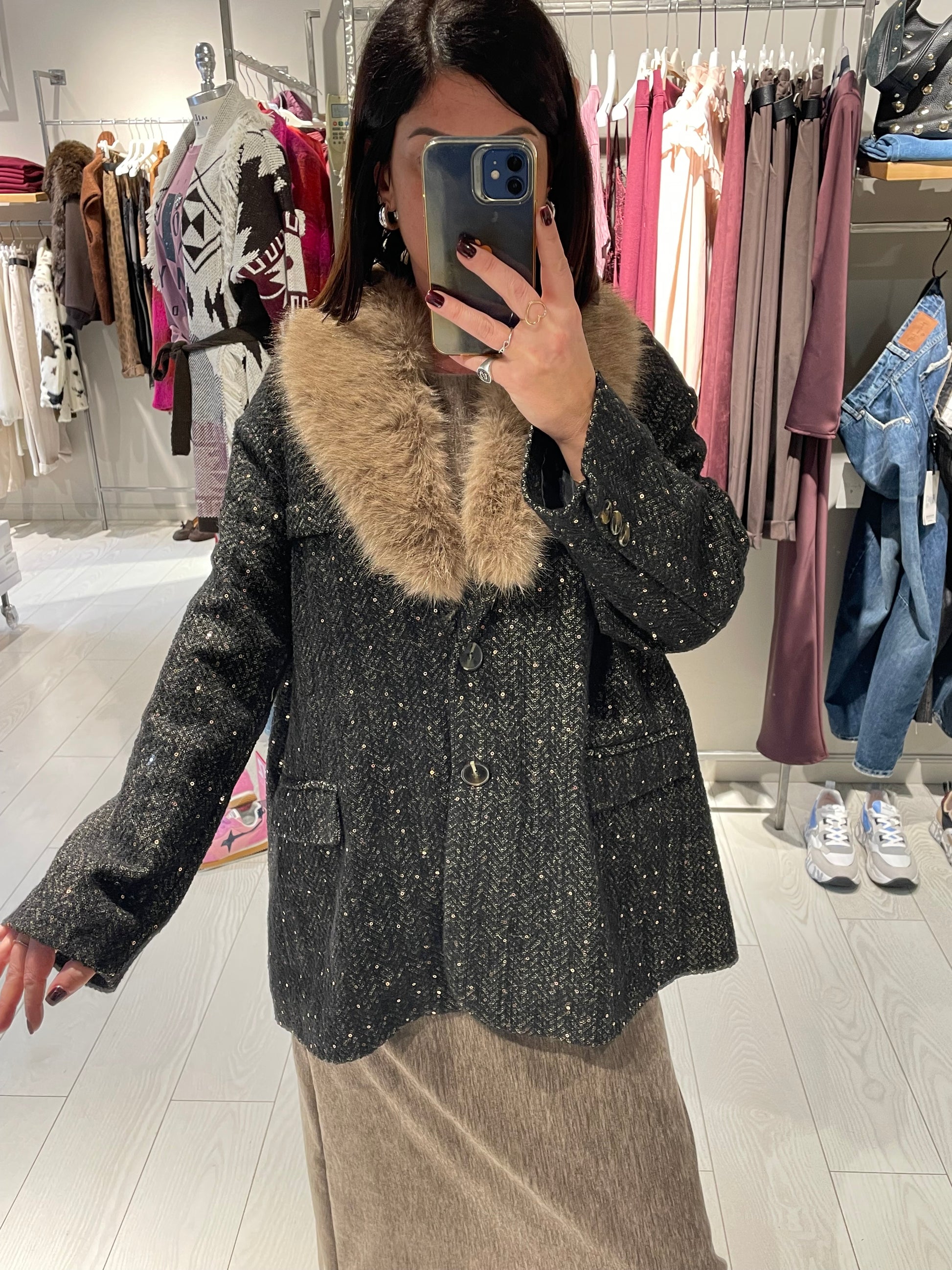 Giacca modello over con collo in eco pellicia staccabile, tessuto spigato con micro paillettes, capo disponibile in taglia unica che veste fino ad una L, la modella in foto è alta 1,68 m circa