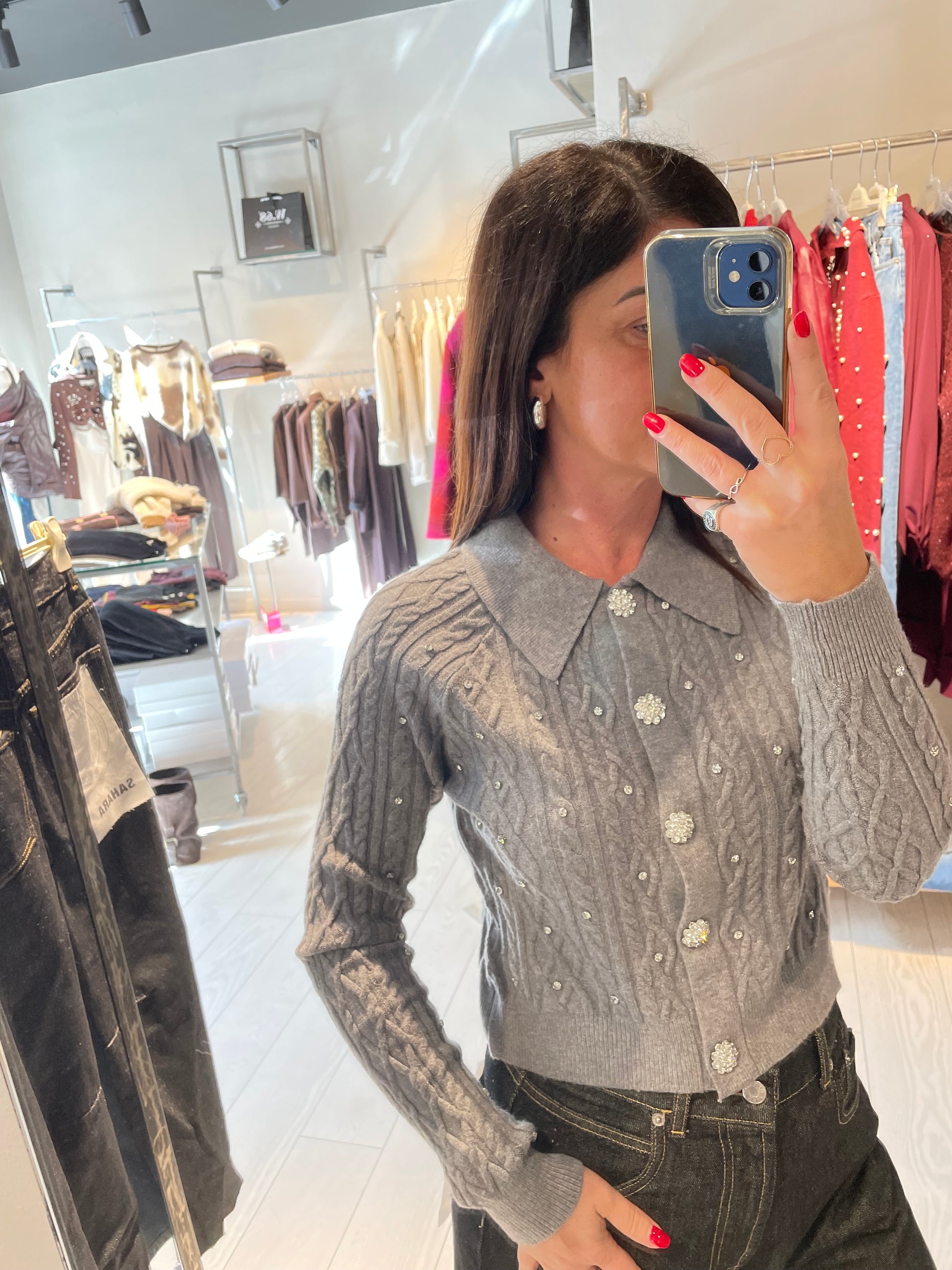 Cardigan corto con colletto a polo, bottoni gioiello e strass cuciti, fit asciutto, capo disponibile in taglia unica che può vestire fino ad una M, la modella in foto è alta 1.68 m circa