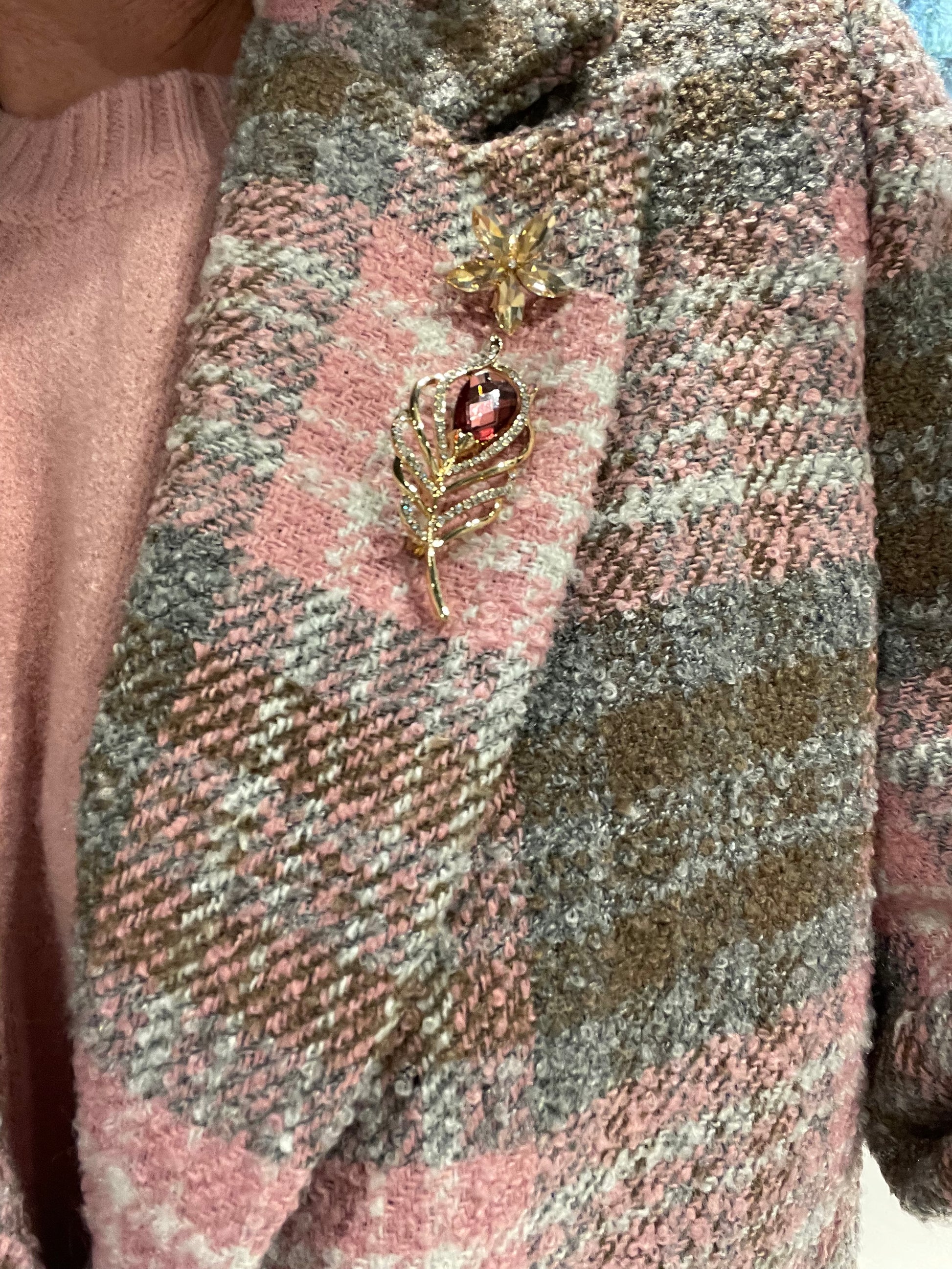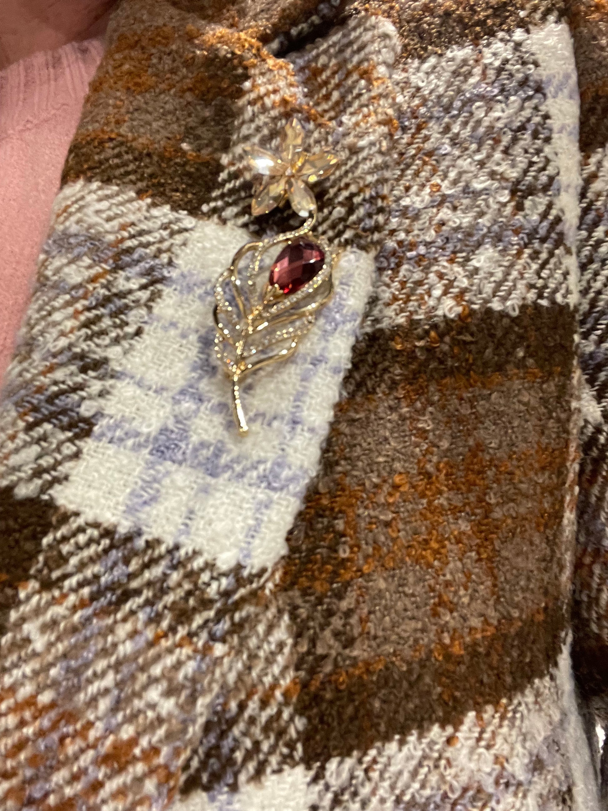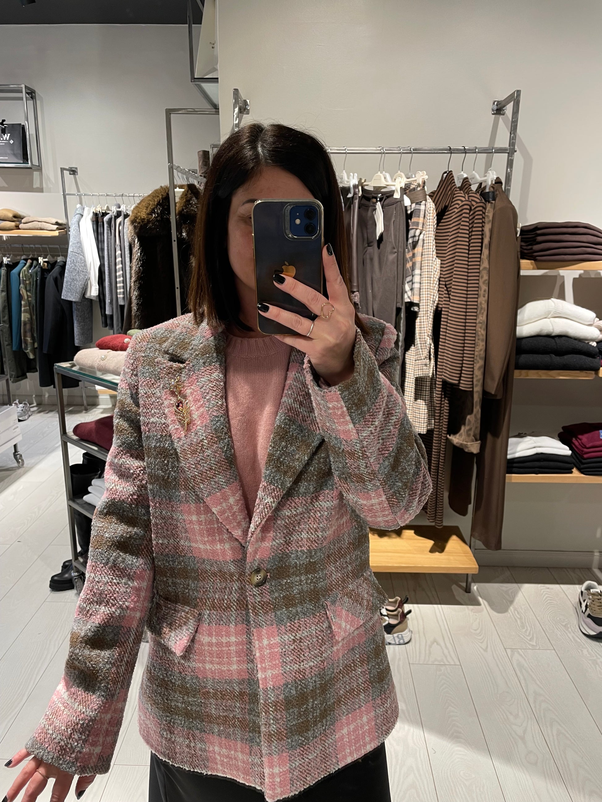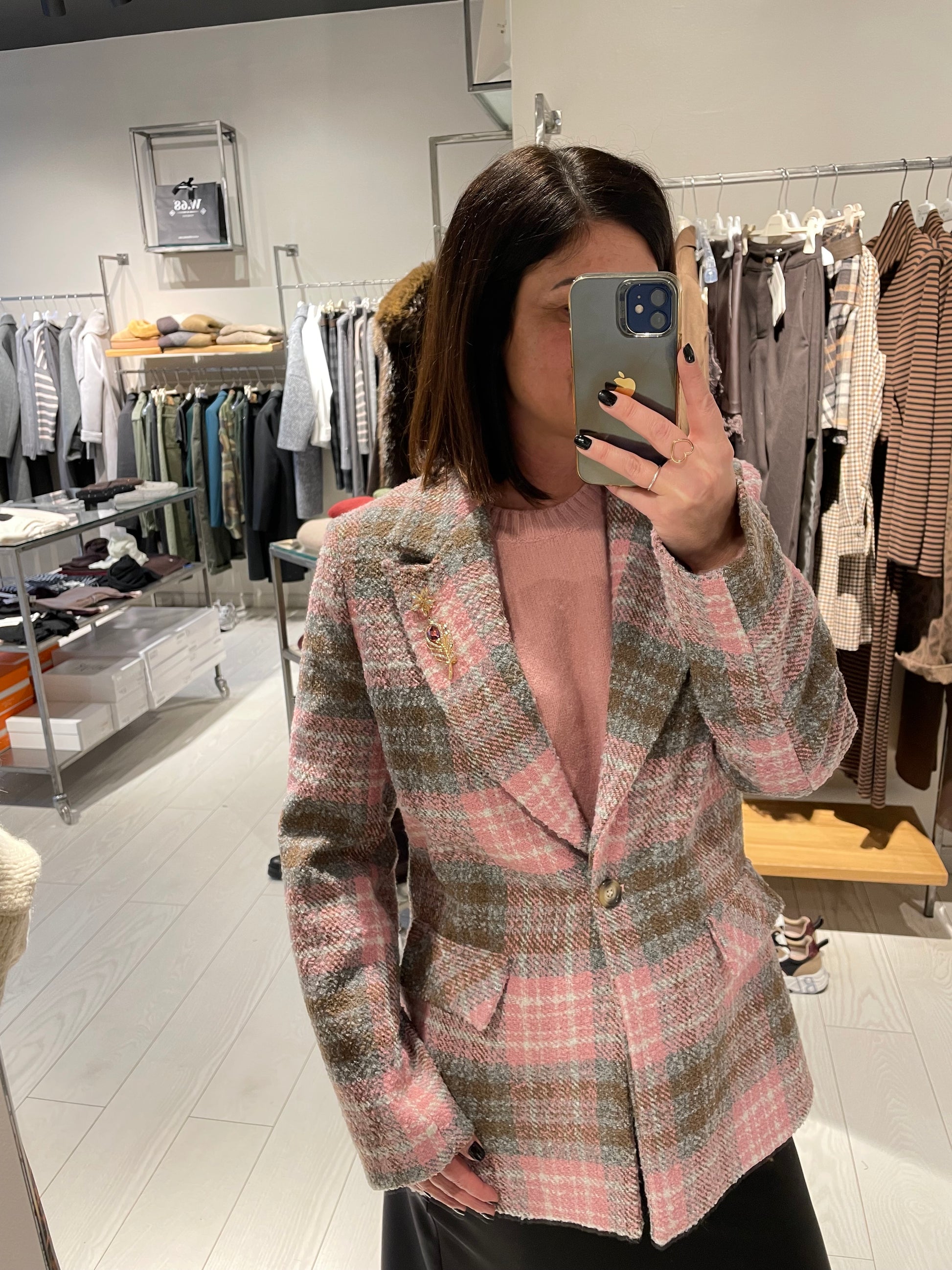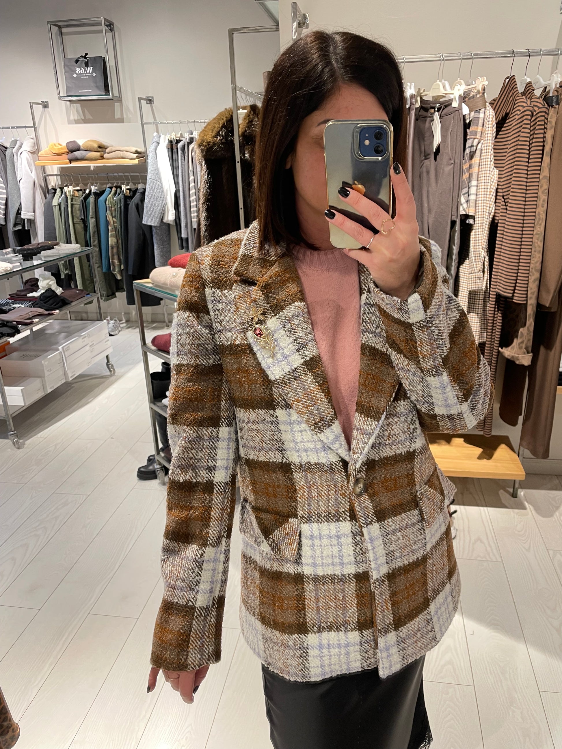Giacca foderata con chiusura un bottone stampa check con spille sul bavero, la vestibilità è regolare, la modella in foto indossa una taglia S ed è alta 1,68 m circa