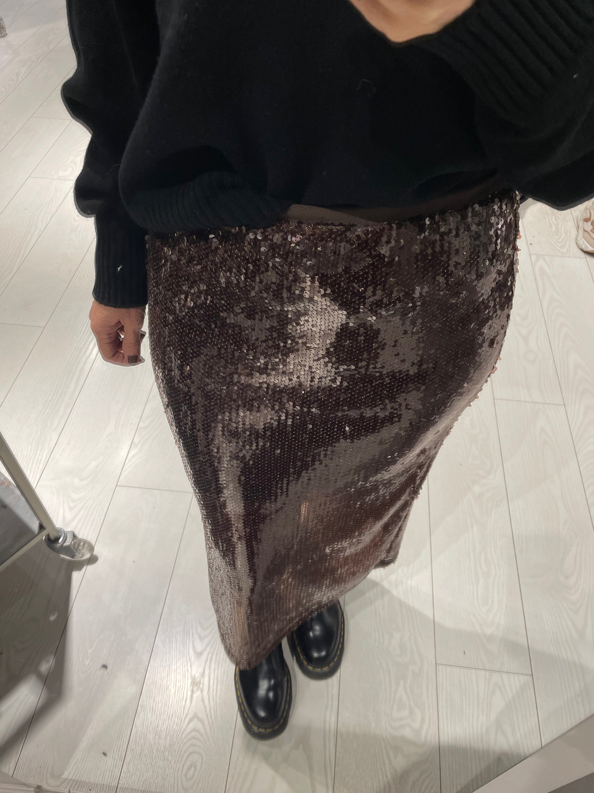 Gonna tubino in paillettes, tutto elastico in vita, spacco laterale, fodera interna leggermente elasticizzata, la vestibilità è regolare, la modella in foto indossa una taglia s ed è alta 1.60 m circa