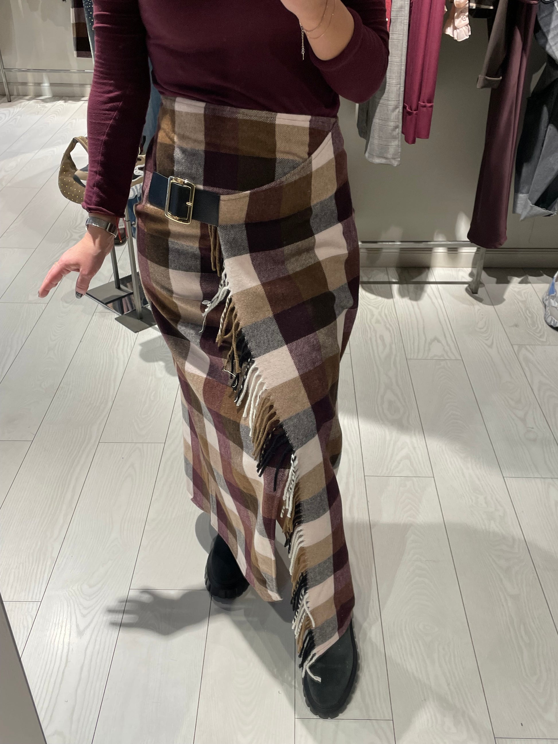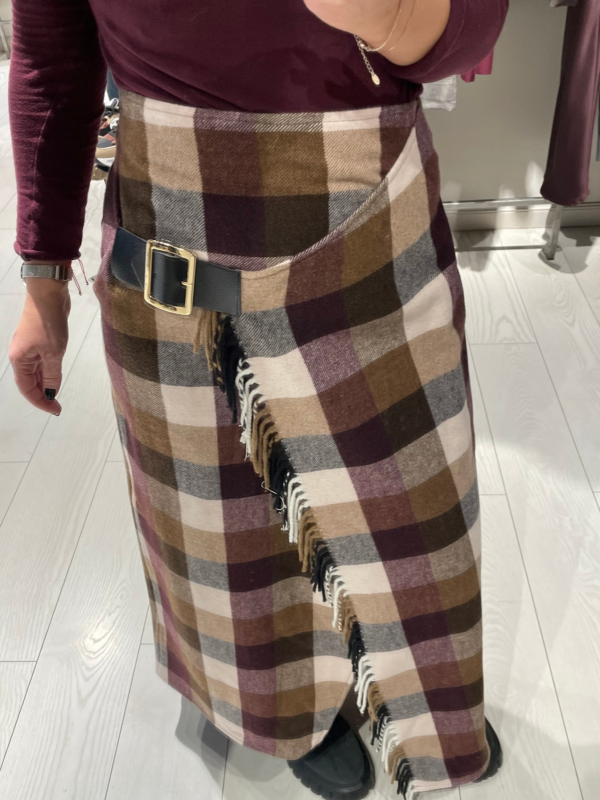 Gonna lunga modello pareo con frange, la vestibilità è regolare, la modella in foto indossa una taglia S ed è alta 1,68 m circa