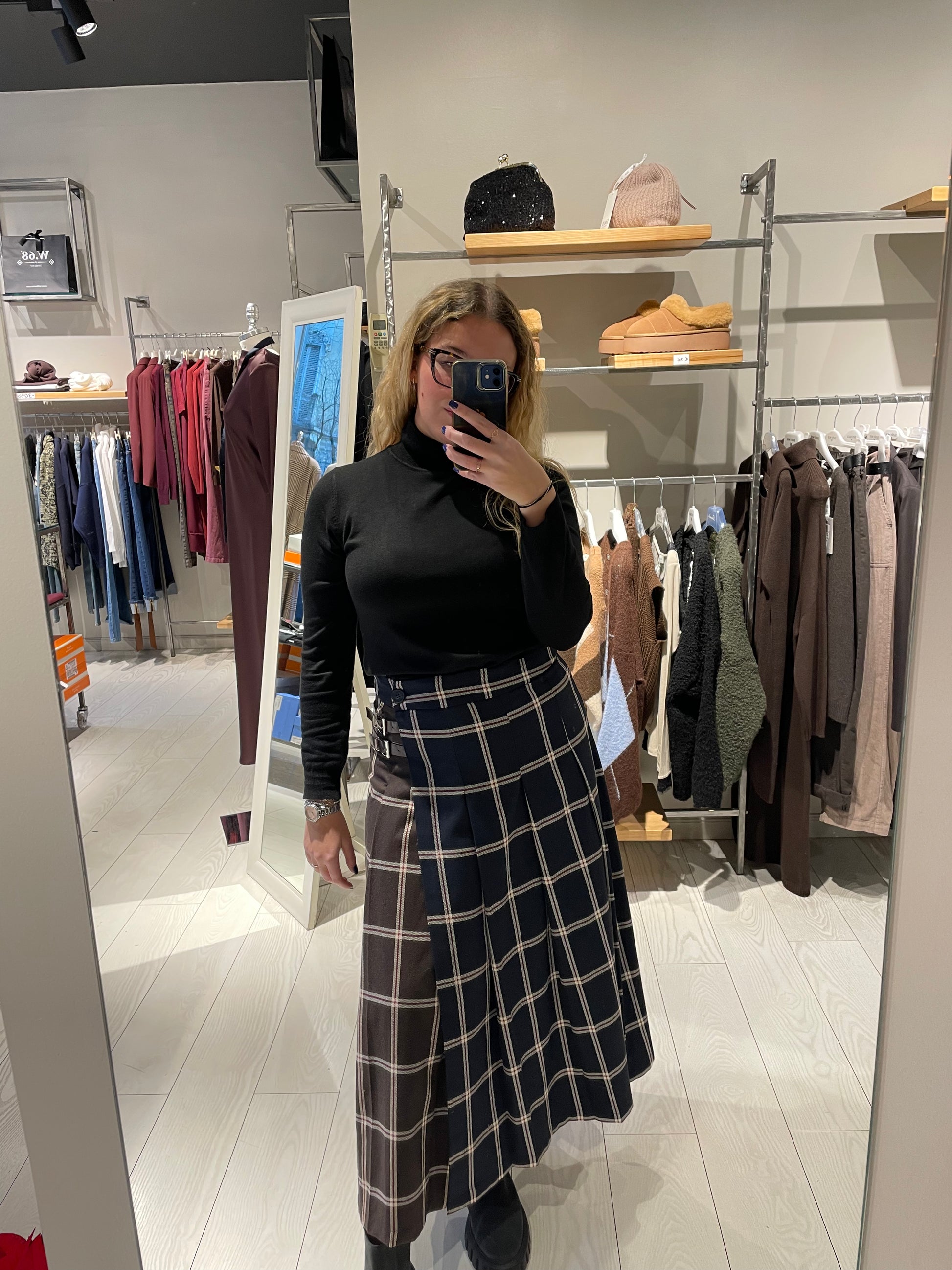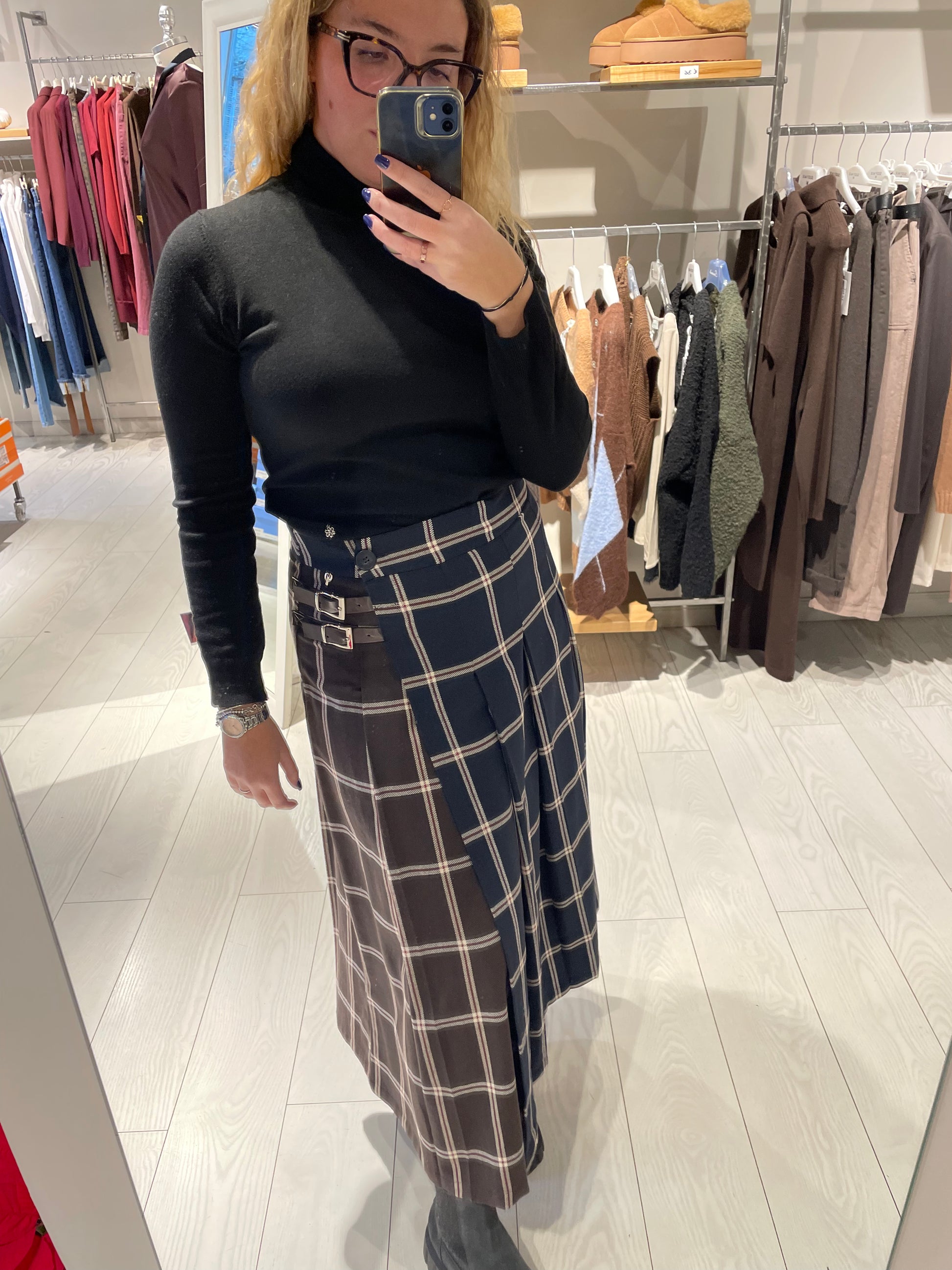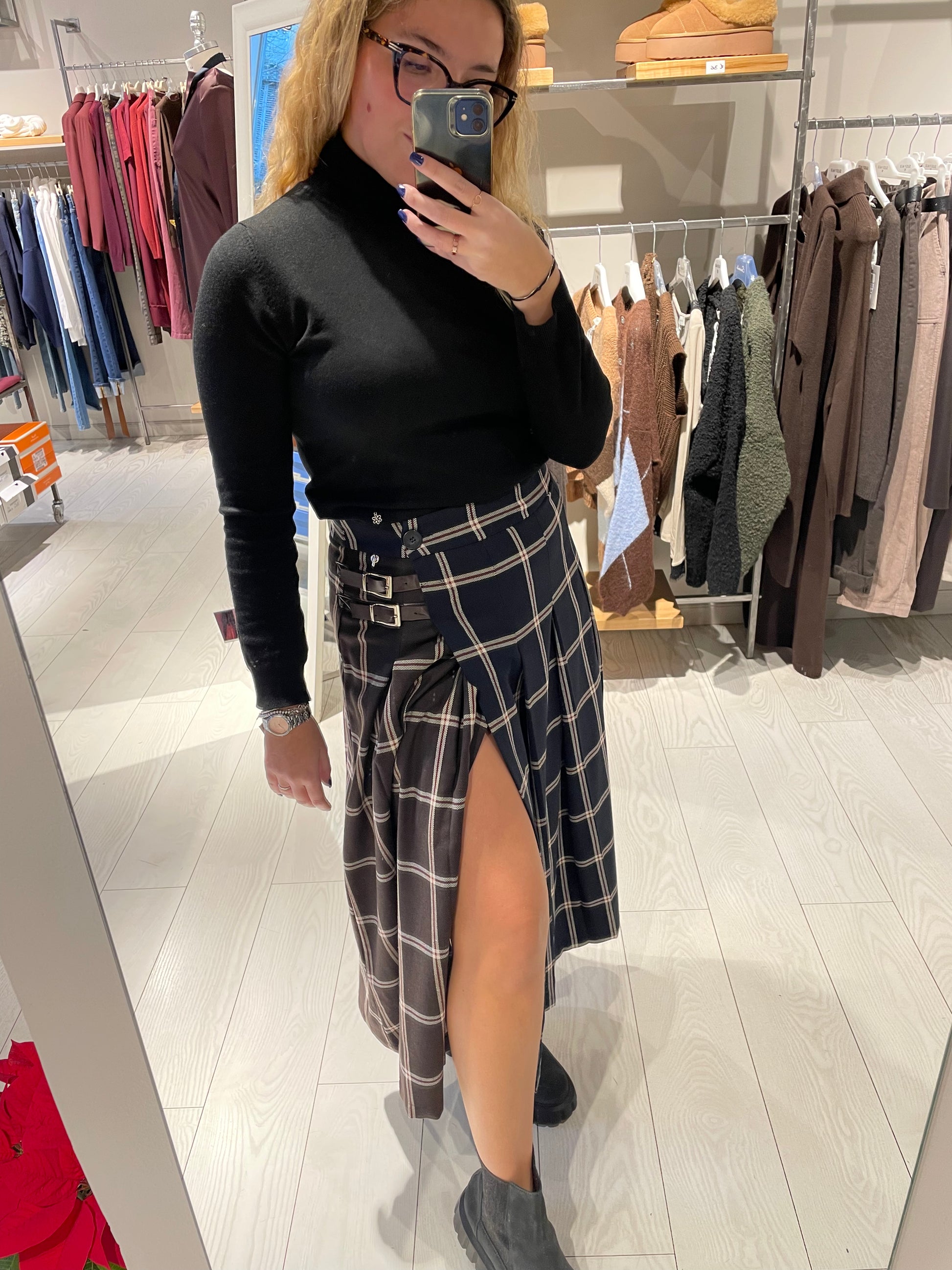 Gonna a portafoglio a vita alta in fantasia scozzese bicolore, un capo che unisce tradizione e versatilità. Il design tartan caratteristico offre un'estetica ricercata, mentre la doppia fibbia laterale garantisce una vestibilità regolabile e confortevole. La silhouette a vita alta valorizza la figura, creando linee eleganti e affinate. Perfetta per chi desidera un pezzo di qualità che combina stile classico con praticità contemporanea. La modella in foto indossa una taglia S ed è alta 1.65 m circa