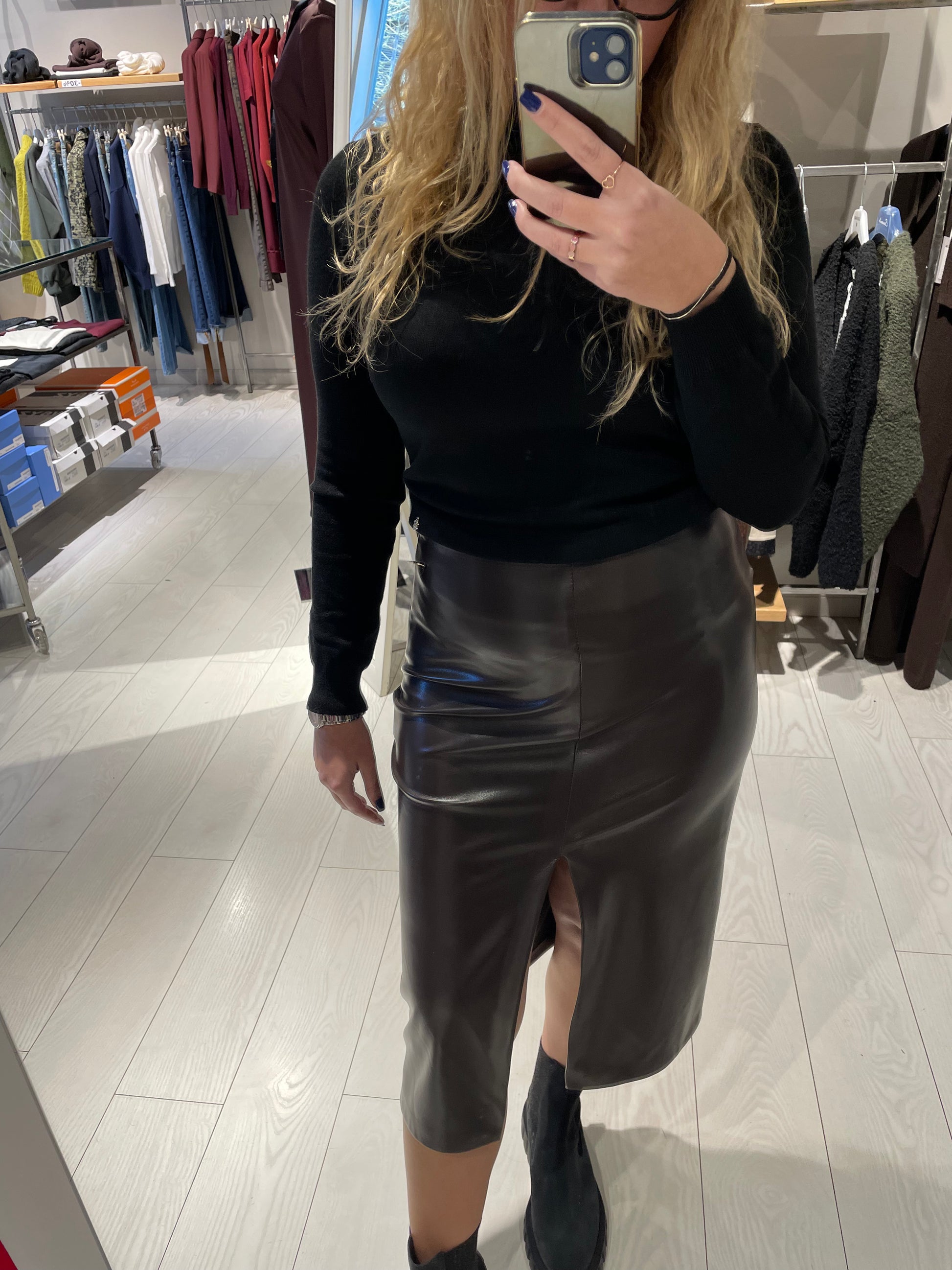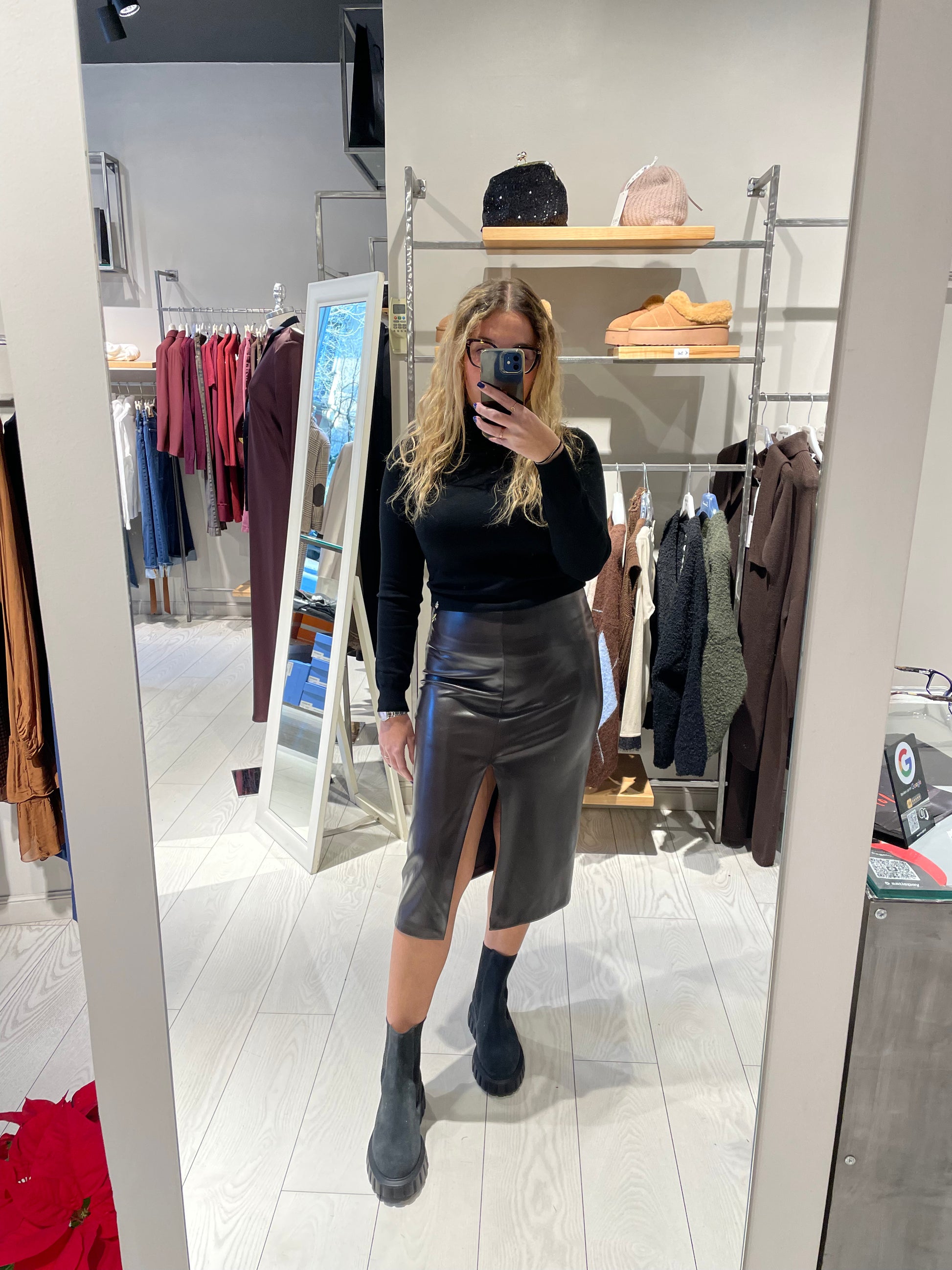 Gonna longuette in ecopelle con spacco laterale, chiusura con cerniera laterale. Un capo versatile che unisce eleganza e praticità, perfetto per chi ricerca uno stile sofisticato. La texture in ecopelle conferisce un aspetto raffinato, mentre lo spacco aggiunge movimento e consente una vestibilità comoda. Ideale per occasioni speciali o per elevare il look quotidiano con un tocco di classe.