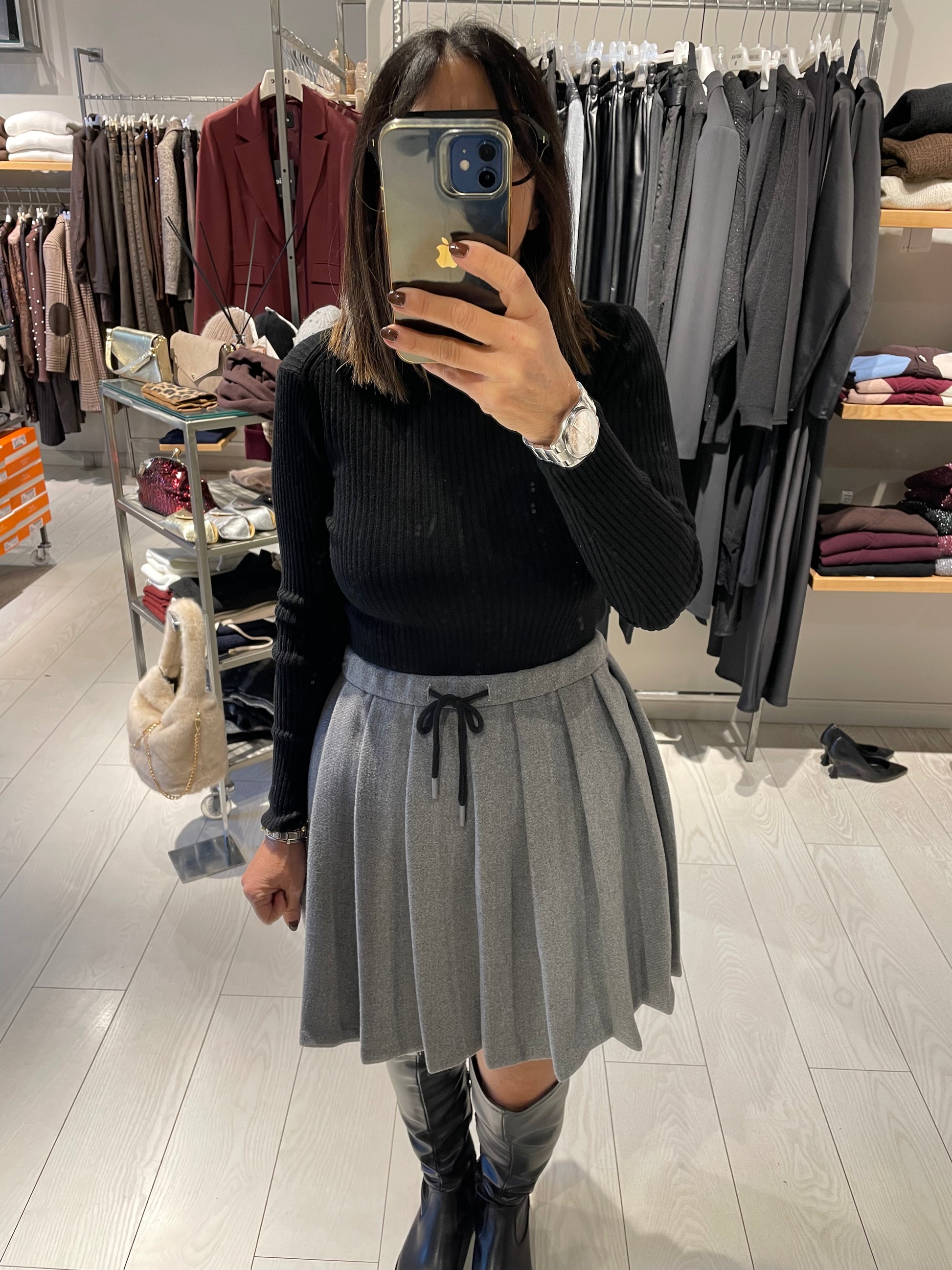 Mini gonna a pieghe in panno caldo con coulisse in vita, possibilità di abbinare la sua giacca per avere un completo, la vestibilità è regolare, la modella in foto indossa una taglia S ed è alta 1.6o m circa
