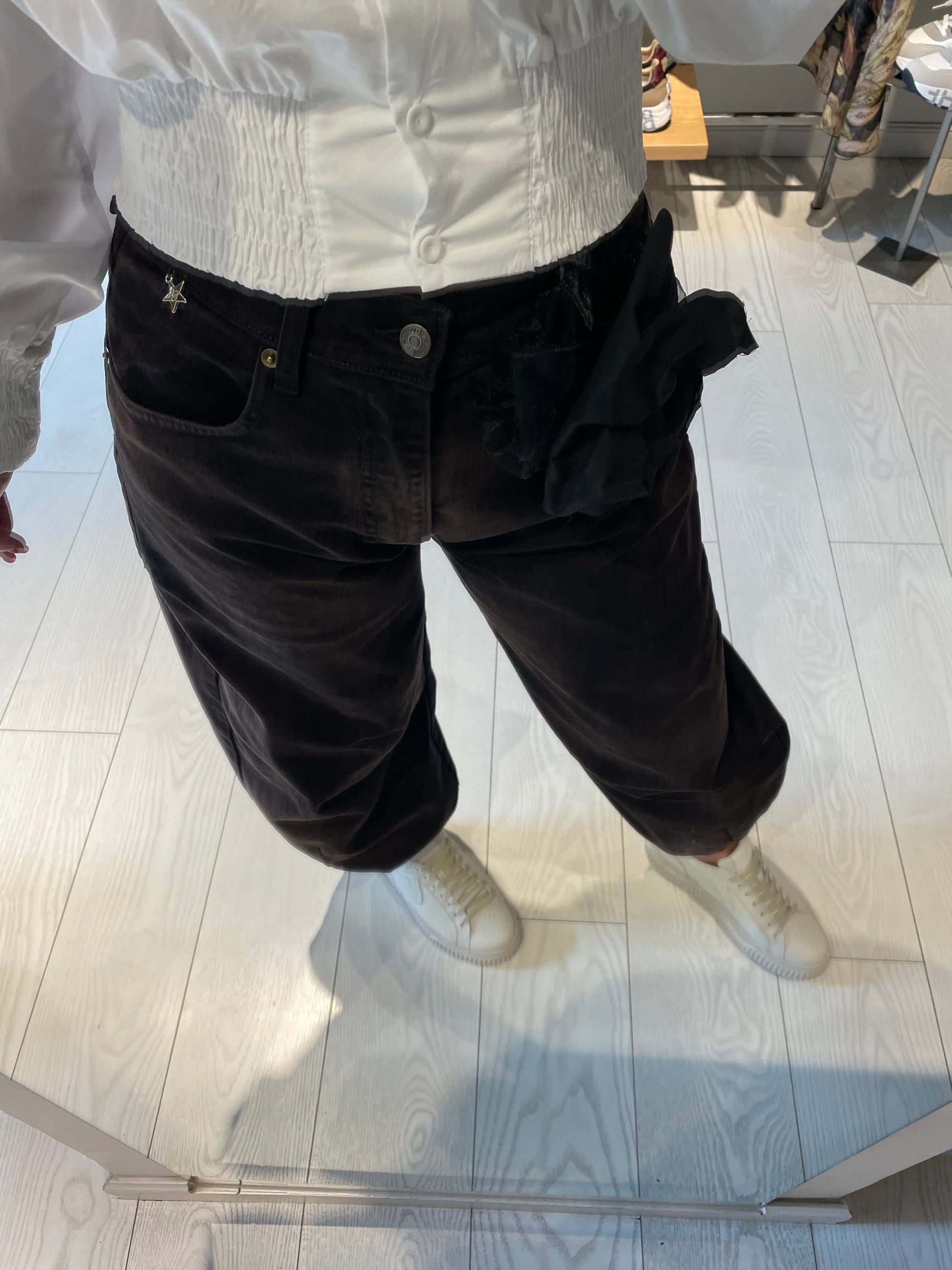 Pantalone modello caroo con elastico alla caviglia, tessuto jeans, il taglio è morbida, si consiglia di acquistare una taglia in meno, la modella in foto indossa una taglia XS ed è alta 1,68 m circa