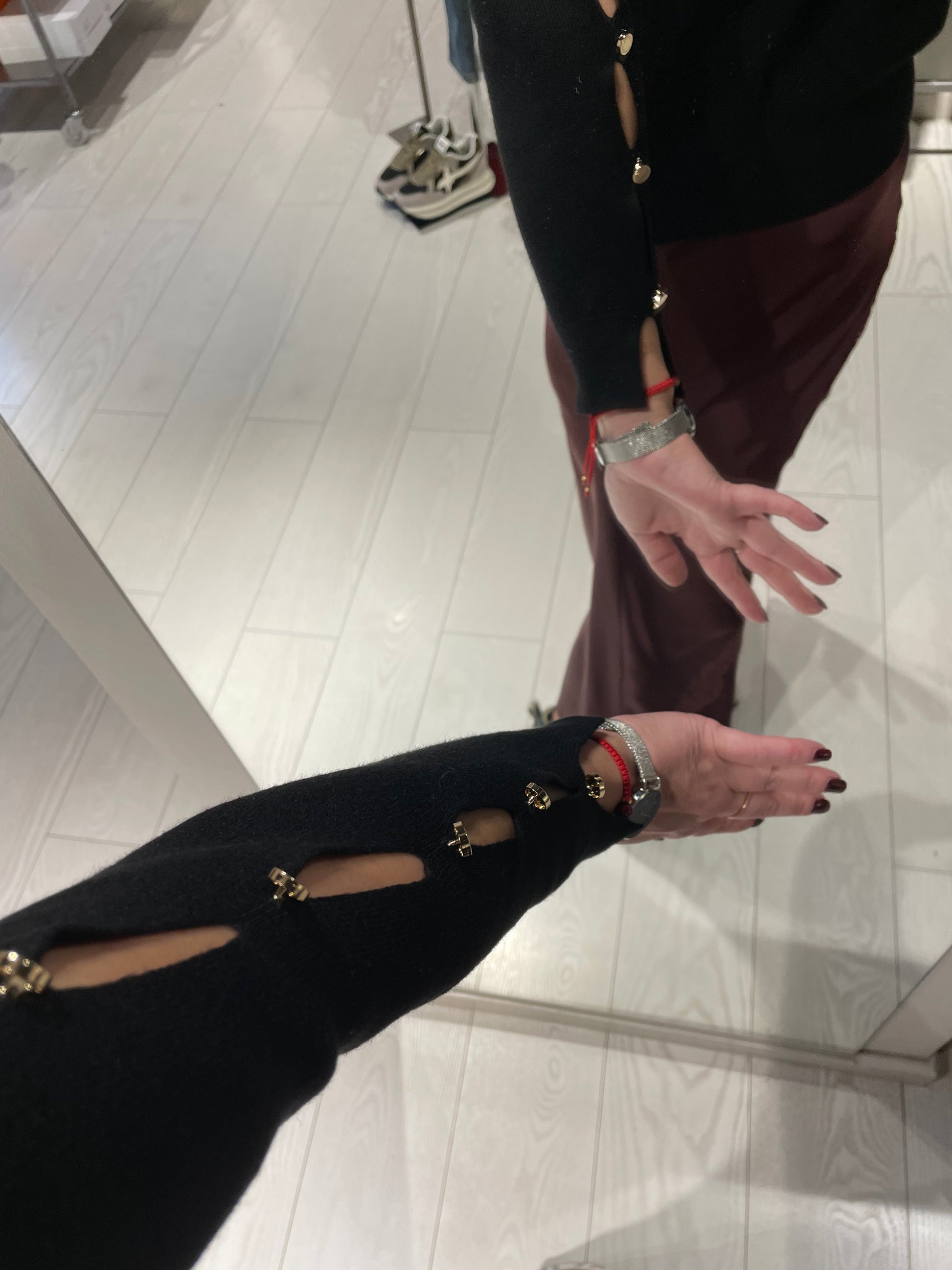 Maglia girocollo con cut out sulle maniche e borchie oro, fit regolare, la modella in foto indossa una taglia S ed è alta 1,68 m circa