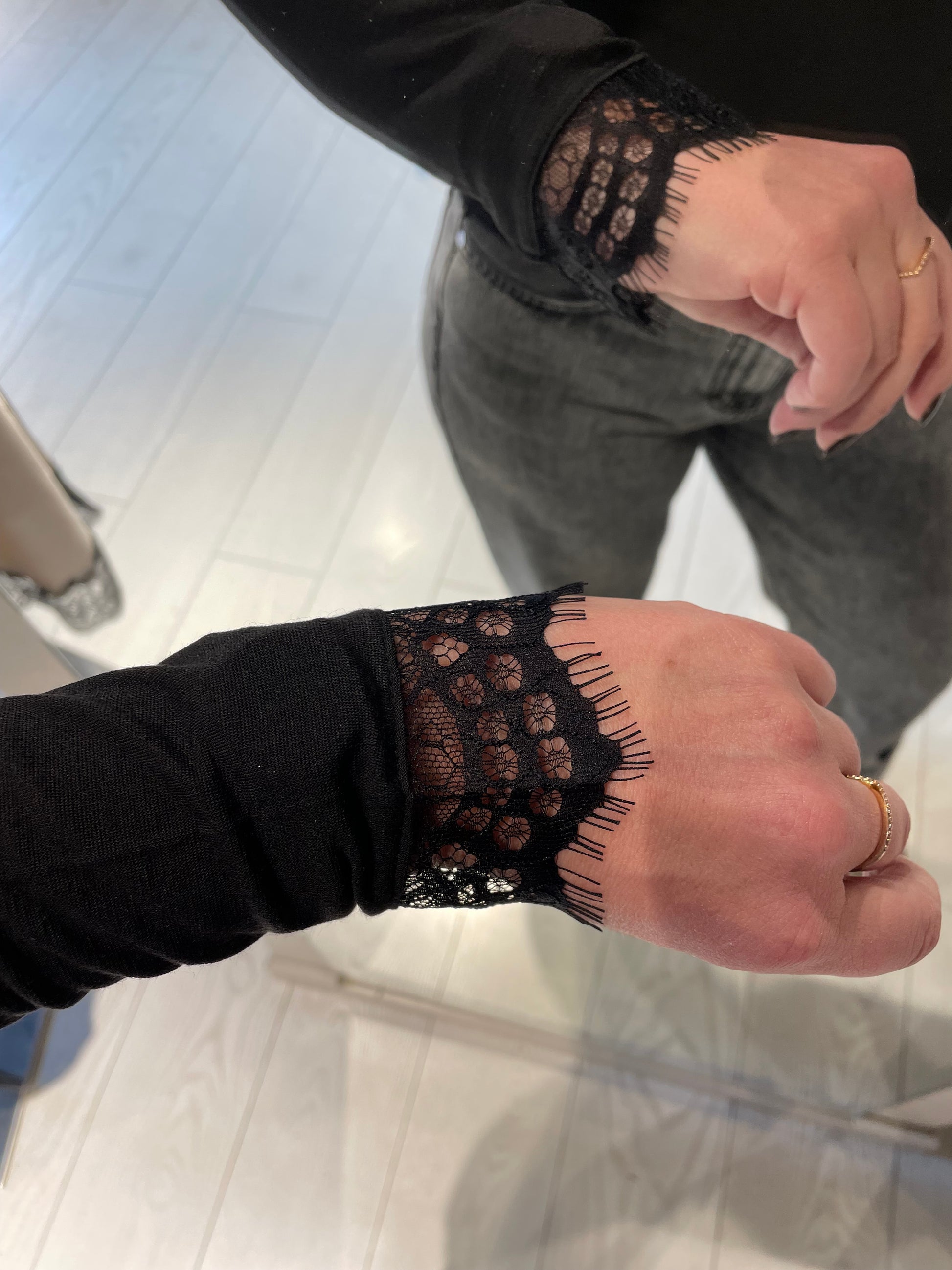 Maglia aderente con scollo a V elasticizzata, pizzo sullo scollo e sul polsino, ideale da indossare sotto i maglioni o sotto le giacche, la modella in foto indossa una taglia S ed è alta 1,68 m circa