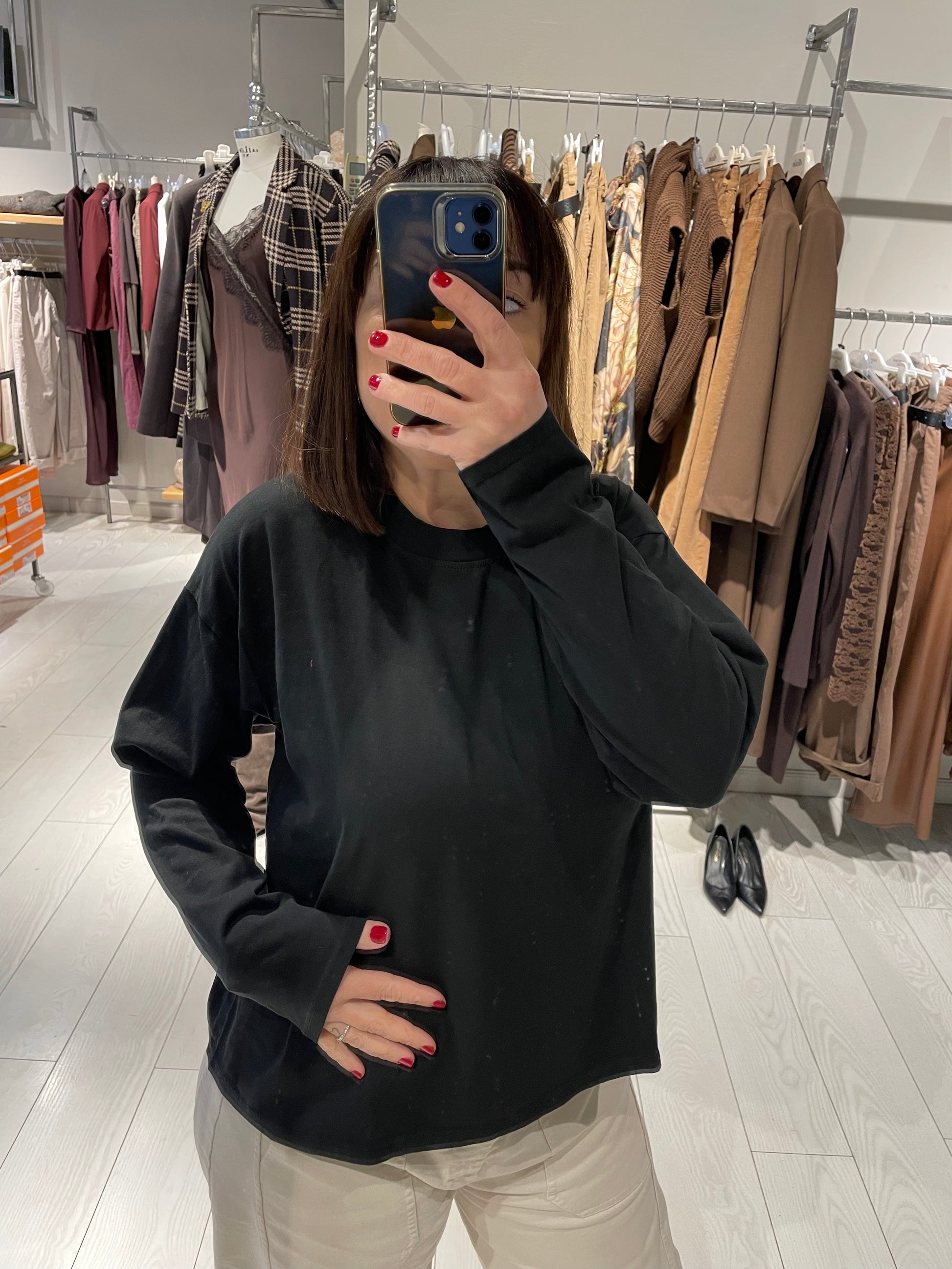 Maglia girocollo in cotone con manica lunga, modello morbido a scatoletta, capo disponibile in taglia unica che veste fino ad una L, la modella in foto è alta 1,60 m circa