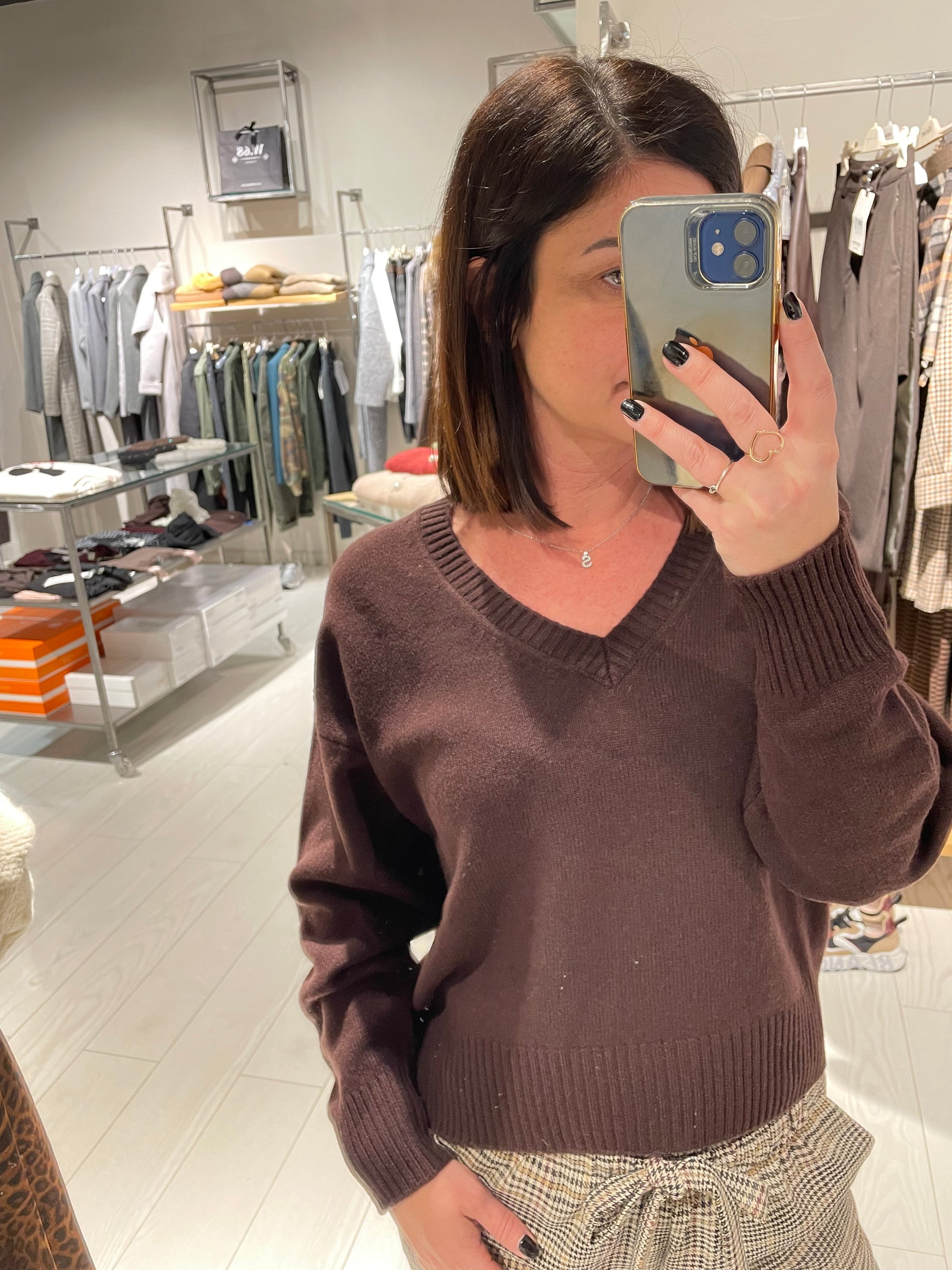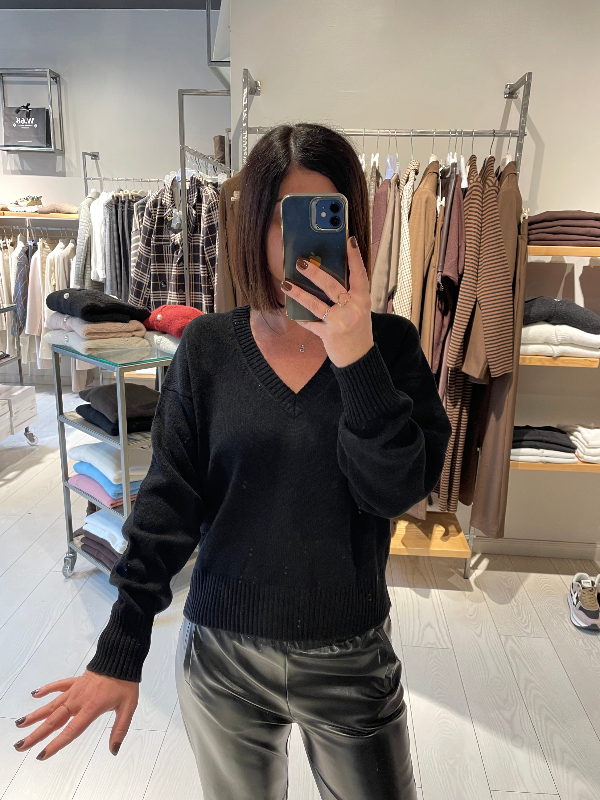 Maglia scollo a V, modello regolare con polsino alto, caldo e confortevole, capo disponibile in taglia unica che può vestire fino ad una L, la modella in foto è alta 1,68 m circa