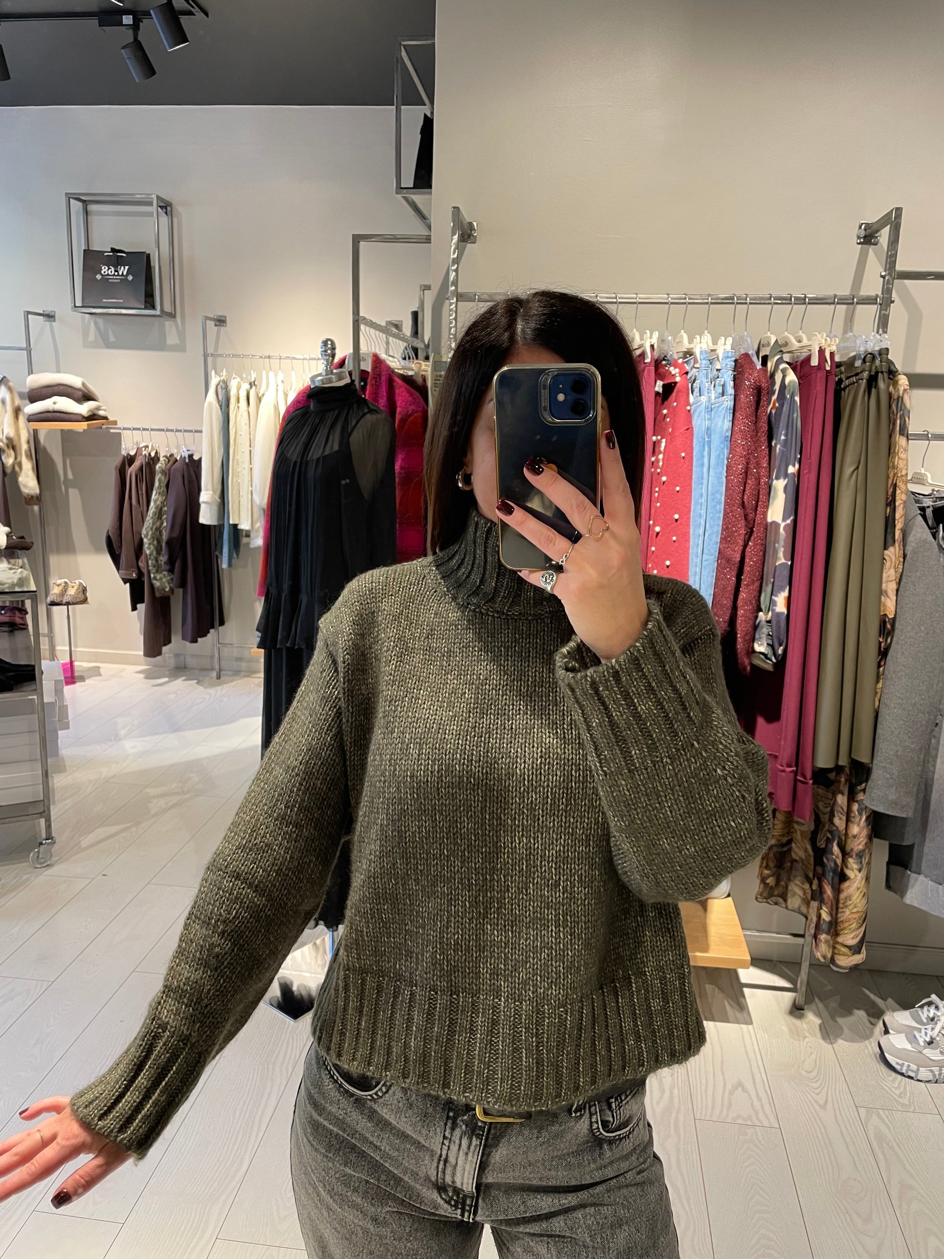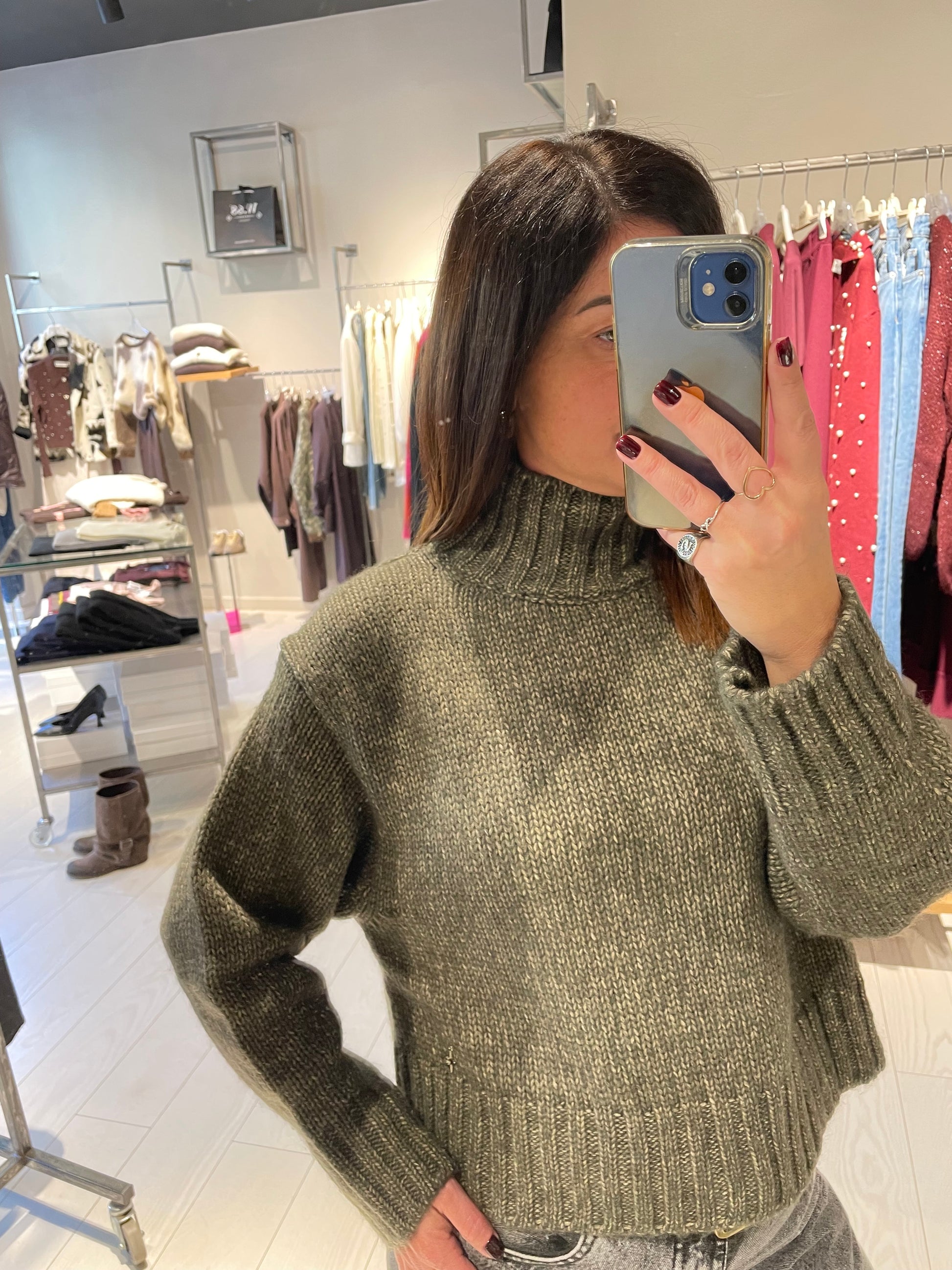 Maglia modello a scatoletta, collo a lupetto, calda e morbida, la vestibilità è regolare, la modella in foto indossa una taglia S ed è alta 1.68 m circa