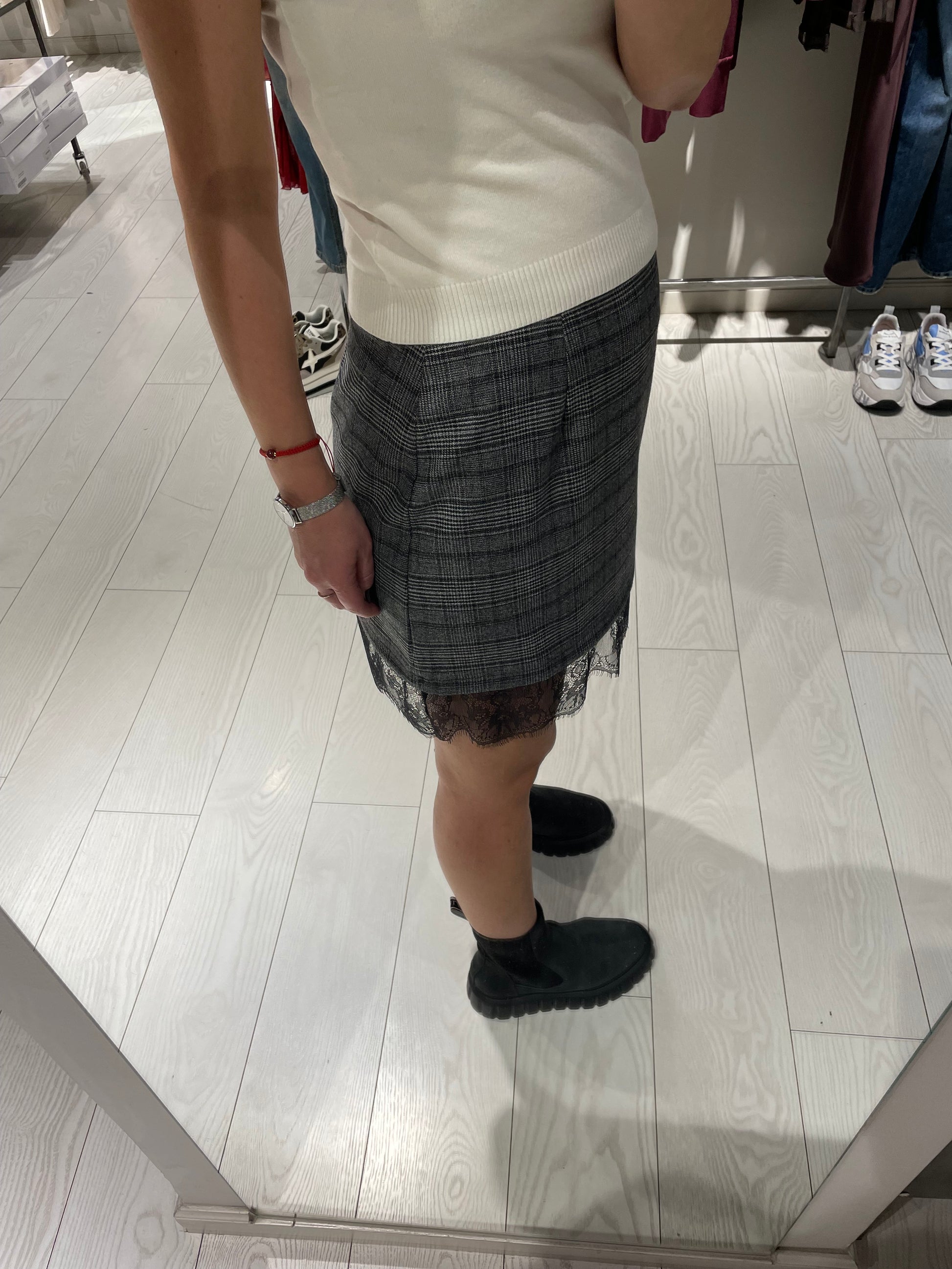 Minigonna con profilo in pizza, chiusura con cerniera dietro centralmente, stampa principe di galles, possibilità di abbinare la sua giacca per creare un completo, la vestibilità è regolare, la modella in foto indossa una taglia S ed è alta 1,68 m circa