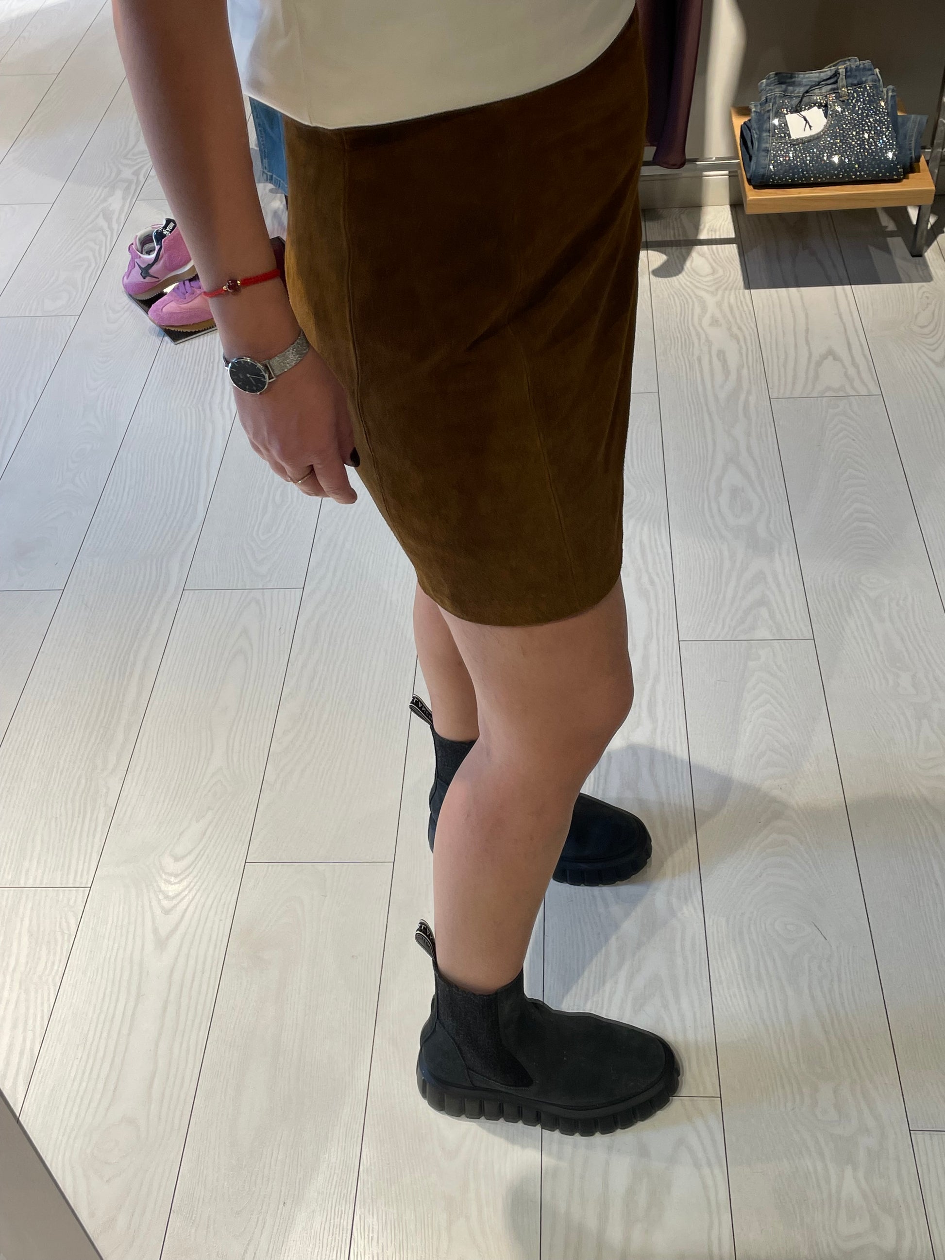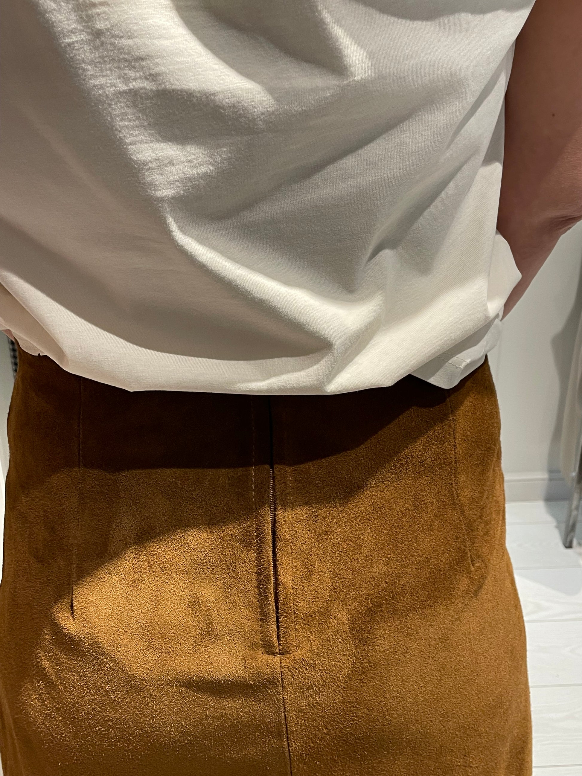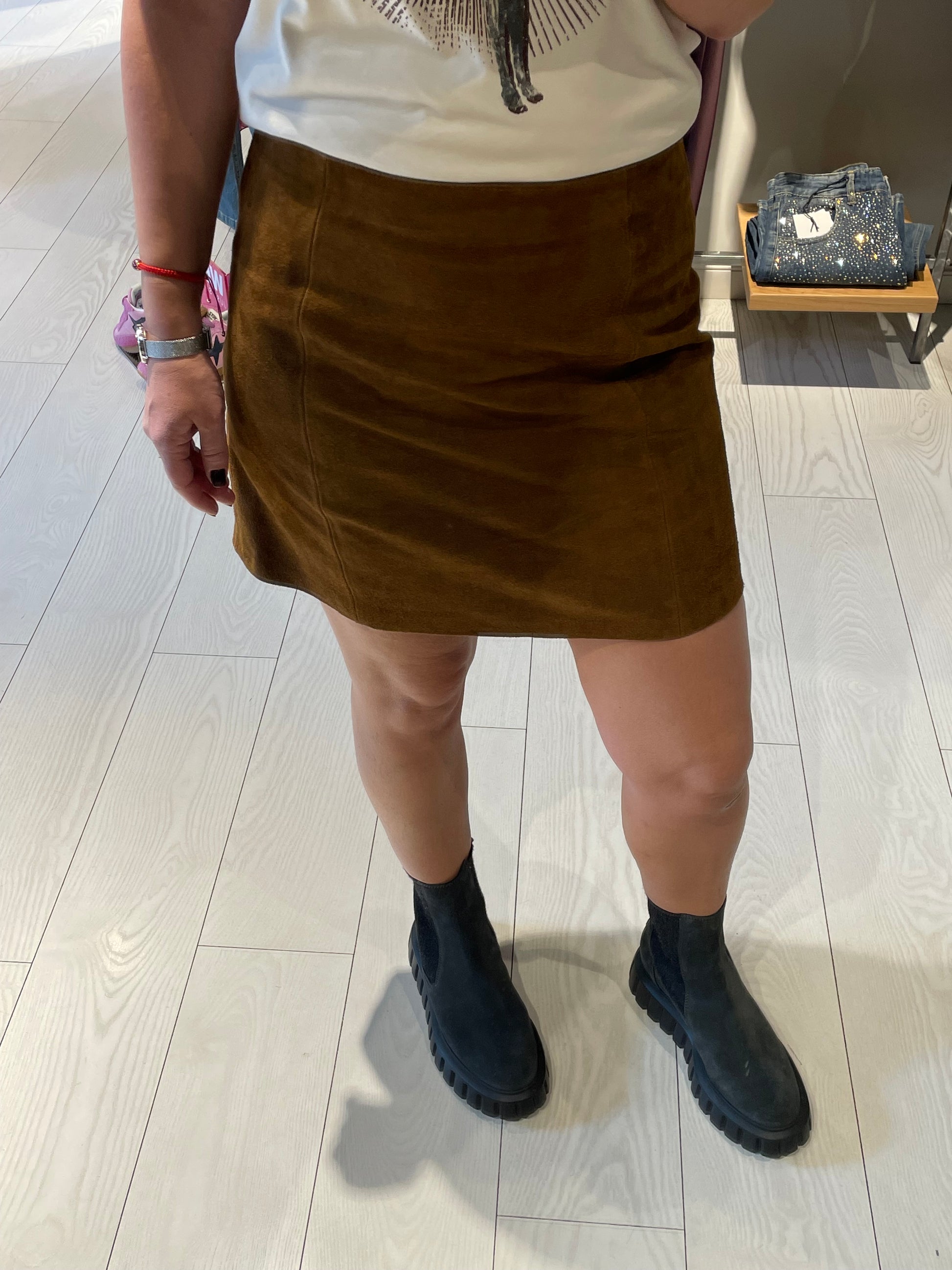 Gonna corta in camoscio, chiusura con cerniera dietro, la vestibilità è regolare e la modella in foto indossa una taglia S ed è alta 1,68 m circa