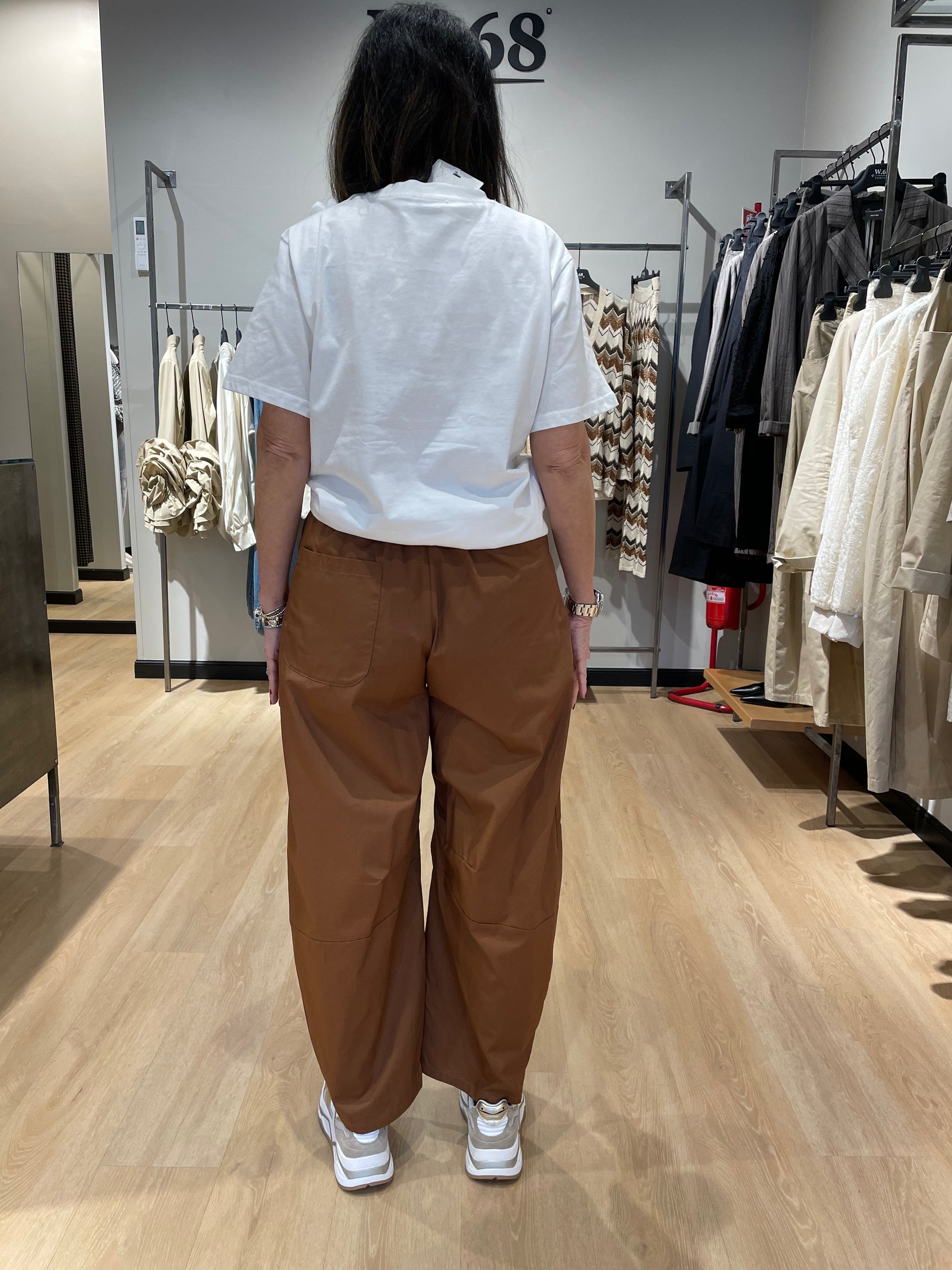 Pantalone barrel dalla silhouette moderna e versatile. Il taglio ampio e confortevole della gamba si affusola leggermente verso la caviglia, creando una linea elegante e contemporanea. Perfetto per chi ricerca uno stile casual-chic che si adatta a molteplici occasioni. Realizzato con attenzione ai dettagli, questo capo è ideale per completare outfit sofisticati senza rinunciare al comfort quotidiano. La modella indossa tg S ed è alta circa 1,60