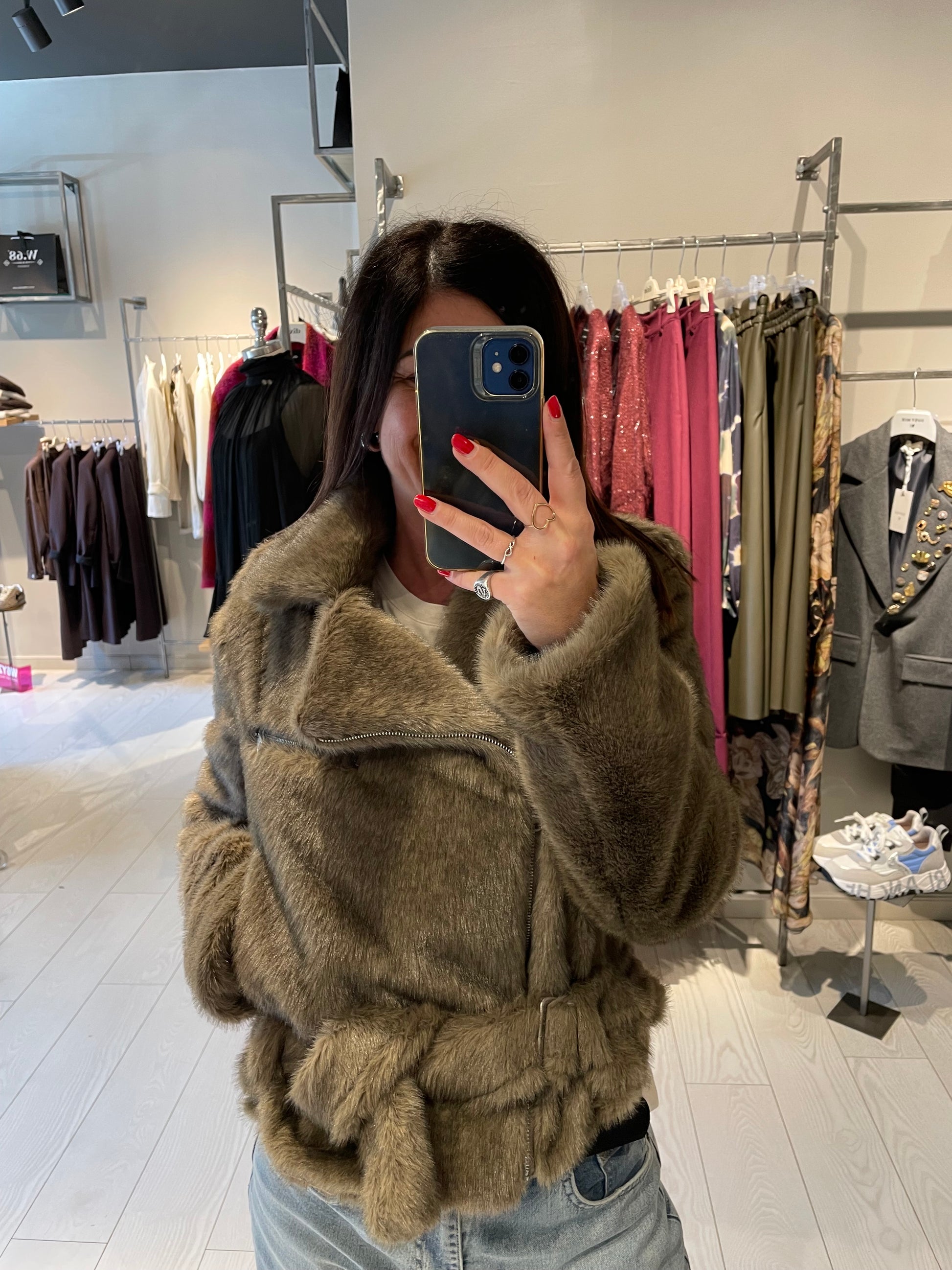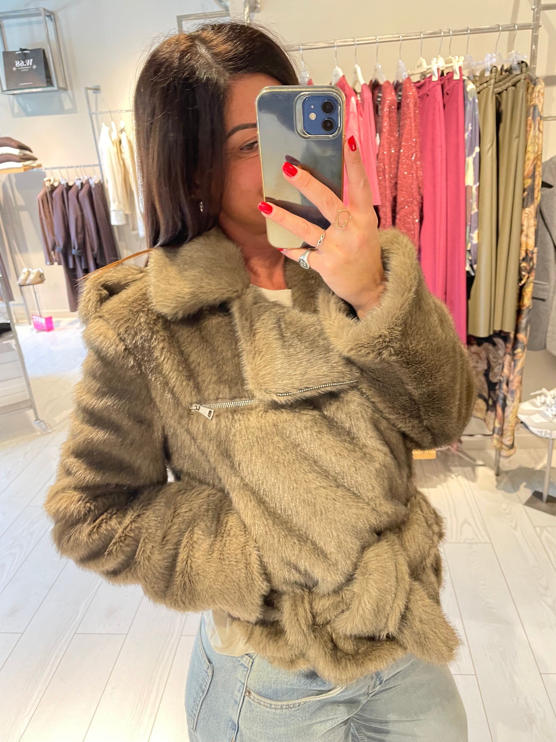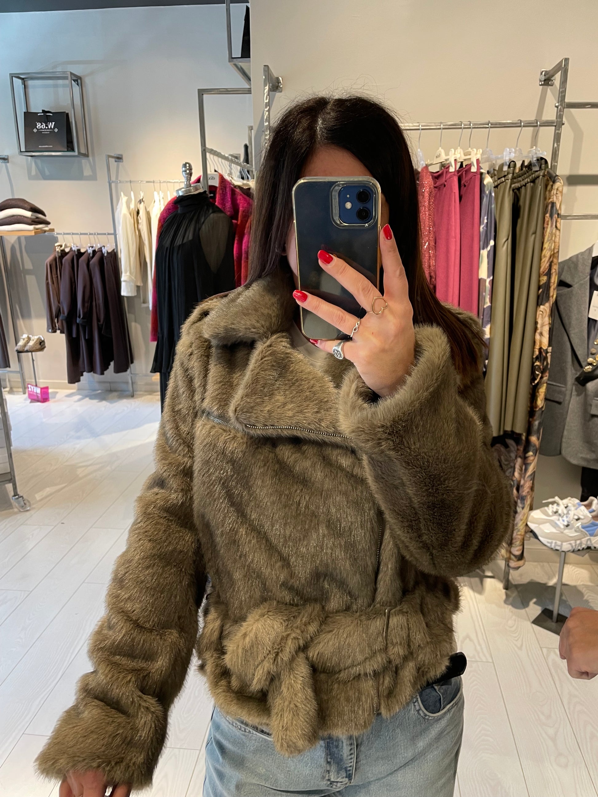 Eco Pelliccia modello a chiodo con tasche e cerniera leggermente spostata a lato, la vestibilità è regolare, la modella in foto indossa una taglia S ed è alta 1.68 m circa