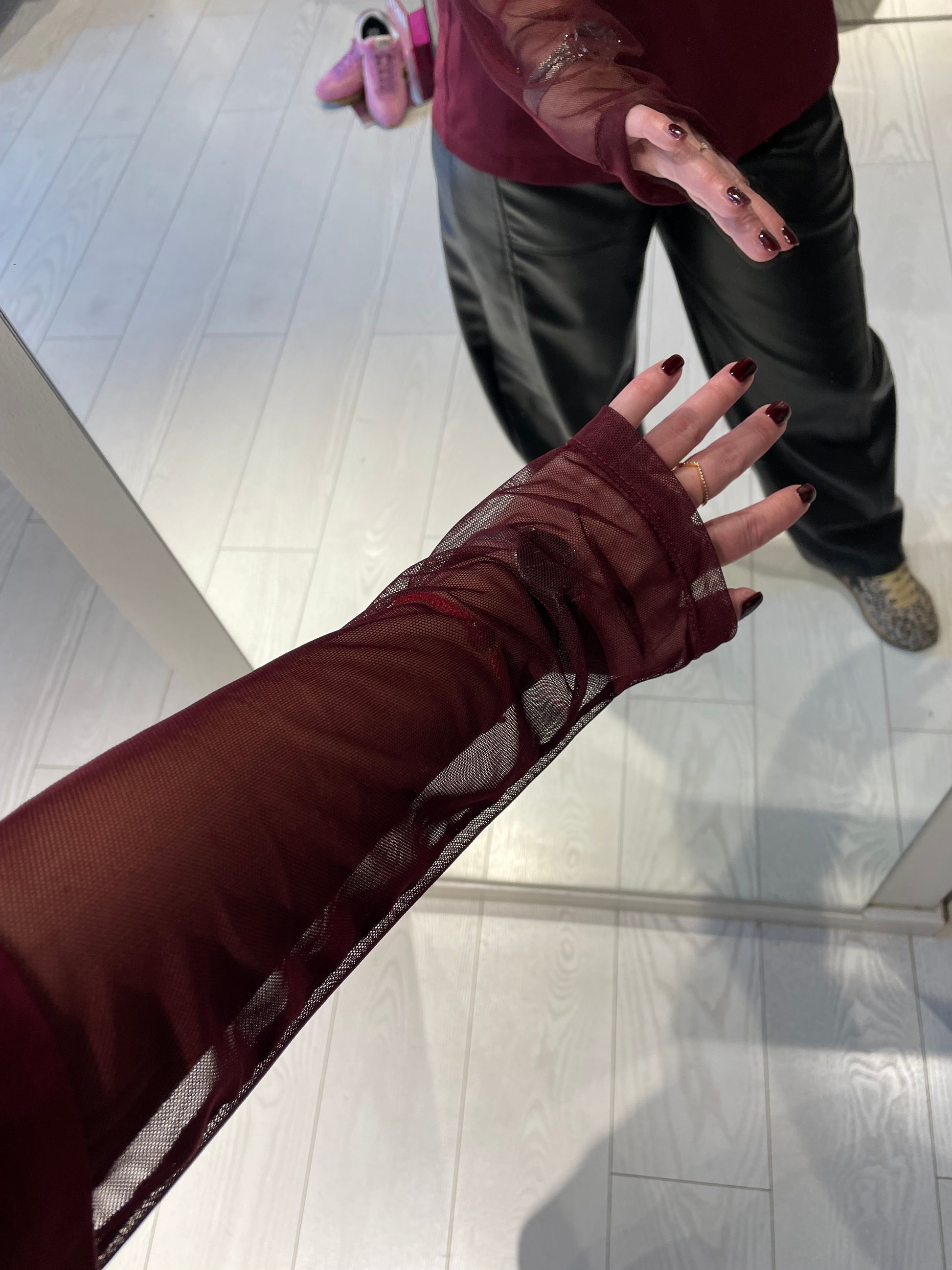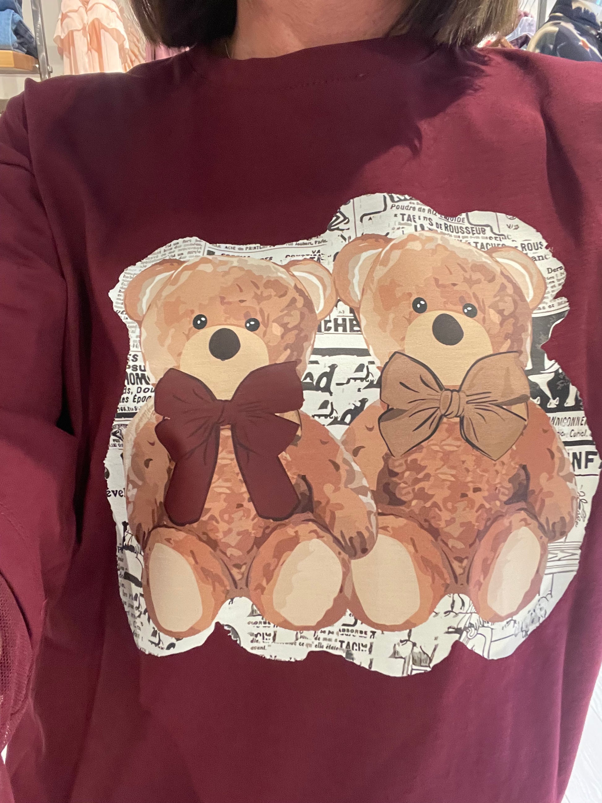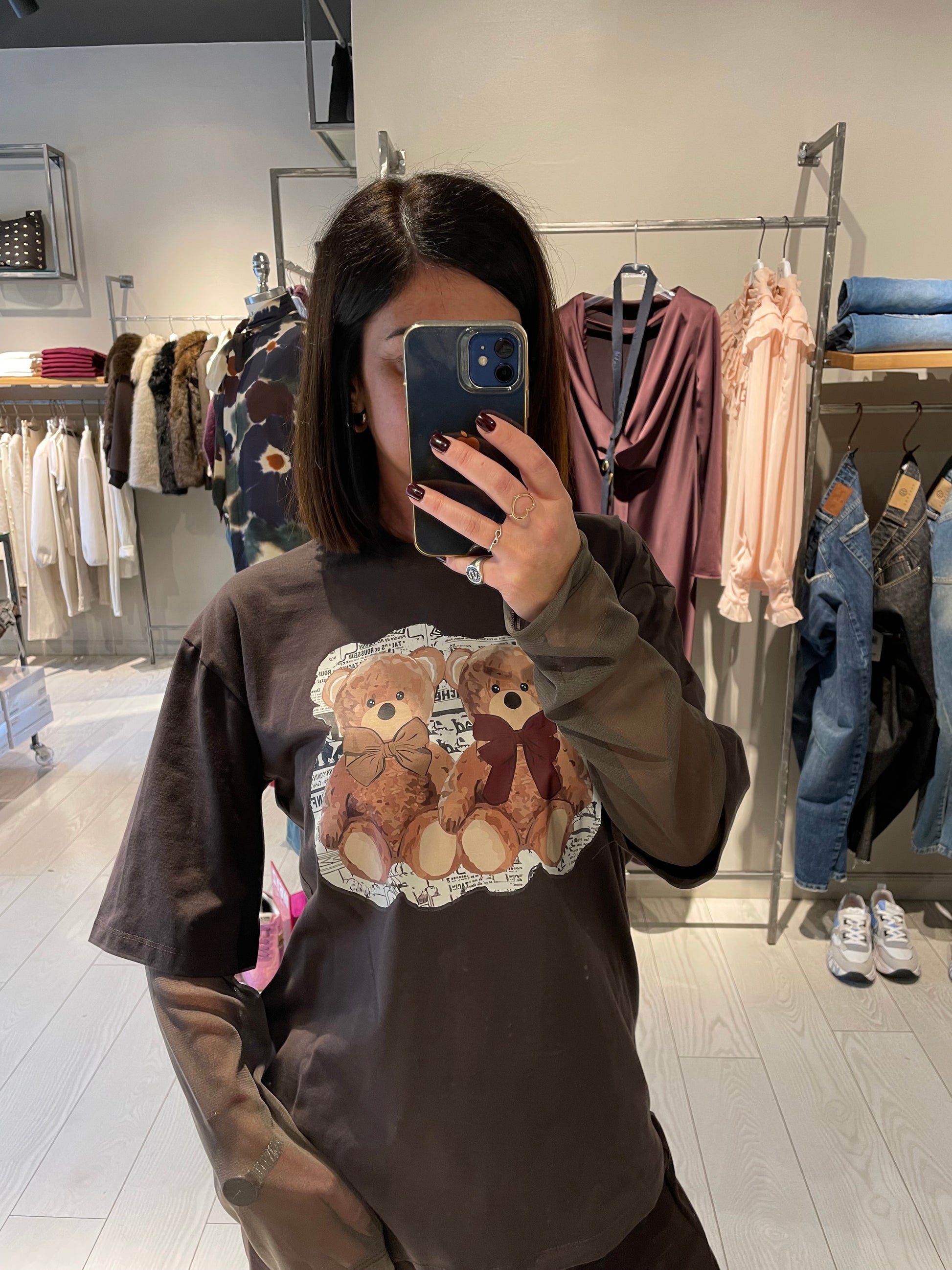 T-shirt girocollo con maniche in tulle stesso colore, stampa con orsetti, capo disponibile in taglia unica con fit regolare, può vestire fino ad una L, la modella in foto è alta 1,68 m circa