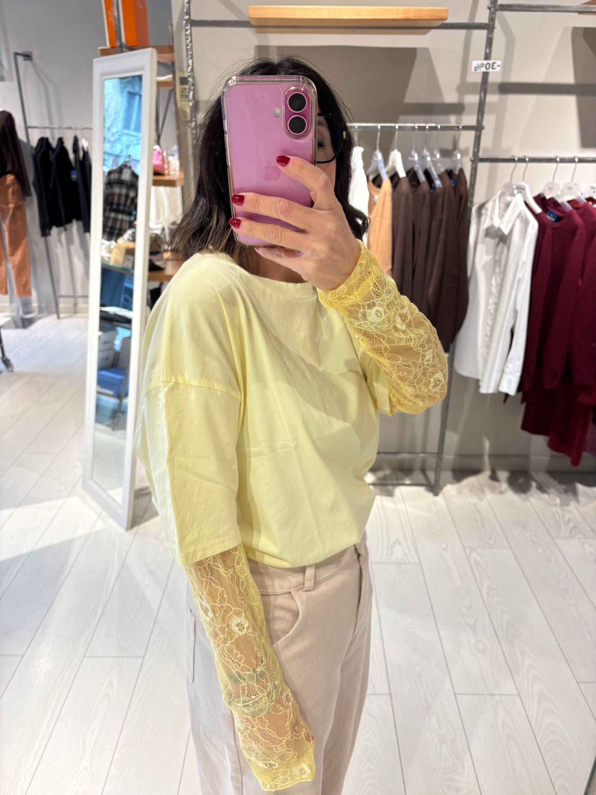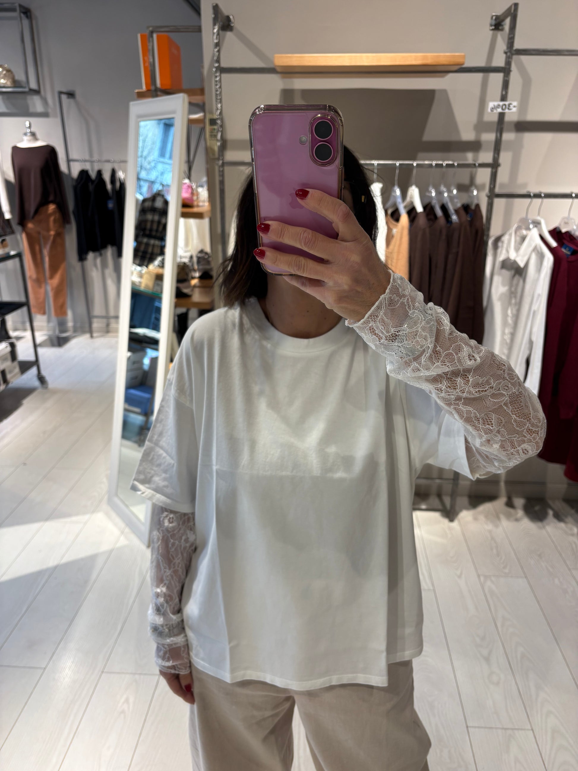 T-shirt con manica in pizzo dello stesso colore, modello dritto a scatoletta, capo disponibile in taglia unica che può vestire fino ad una L, la modella in foto è alta 1,68 m circa